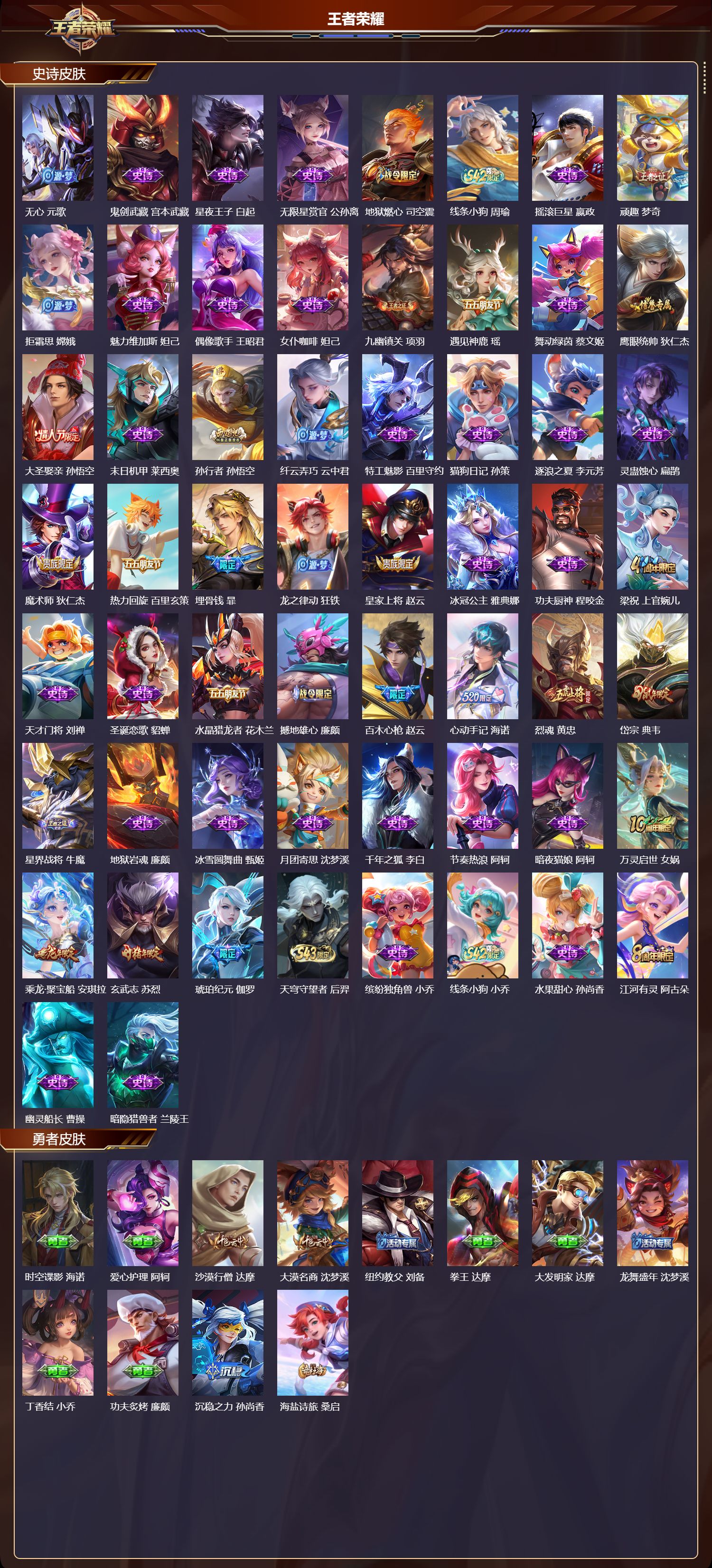 【71,史诗皮肤】蔬乡物语,鲁班七号,逐梦之星,马可波罗,百解令,蒙犽,奇遇舞章,艾琳,暗渊魔法,司马懿,乘龙·忆丹青,大乔,燃音魔法,高渐离,苍穹之光,项羽,猫狗日记,大乔,妄想食味,姬小满,德古拉伯爵,刘邦,心灵战警,亚瑟,诗语江南,西施,无心,元歌,鬼剑武藏,宫本武藏,星夜王子,白起,无限星赏官,公孙离,地狱燃心,司空震,线条小狗,周瑜,摇滚巨星,嬴政,顽趣,梦奇,拒霜思,嫦娥,魅力维加斯,妲己,偶像歌手,王昭君,女仆咖啡,妲己,九幽镇关,项羽,遇见神鹿,瑶,舞动绿茵,蔡文姬,鹰眼统帅,狄仁杰,大圣娶亲,孙悟空,末日机甲,莱西奥,孙行者,孙悟空,纤云弄巧,云中君,特工魅影,百里守约,猫狗日记,孙策,逐浪之夏,李元芳,灵蛊蚀心,扁鹊,魔术师,狄仁杰,热力回旋,百里玄策,埋骨钱,暃,龙之律动,狂铁,皇家上将,赵云,冰冠公主,雅典娜,功夫厨神,程咬金,梁祝,上官婉儿,天才门将,刘禅,圣诞恋歌,貂蝉,水晶猎龙者,花木兰,撼地雄心,廉颇,百木心枪,赵云,心动手记,海诺,烈魂,黄忠,岱宗,典韦,星界战将,牛魔,地狱岩魂,廉颇,冰雪圆舞曲,甄姬,月团寄思,沈梦溪,千年之狐,李白,节奏热浪,阿轲,暗夜猫娘,阿轲,万灵启世,女娲,乘龙·聚宝船,安琪拉,玄武志,苏烈,琥珀纪元,伽罗,天穹守望者,后羿,缤纷独角兽,小乔,线条小狗,小乔,水果甜心,孙尚香,江河有灵,阿古朵,幽灵船长,曹操,暗隐猎兽者,兰陵王,