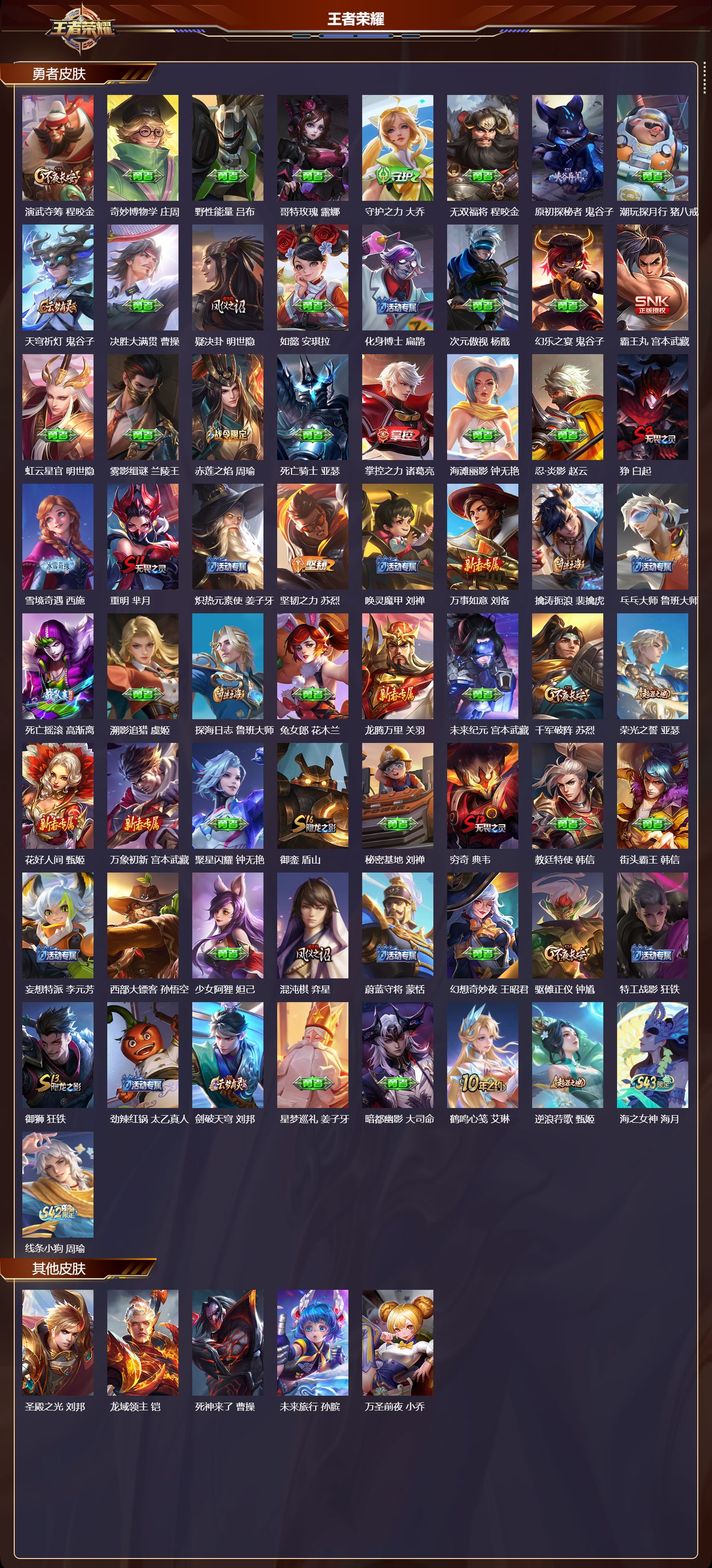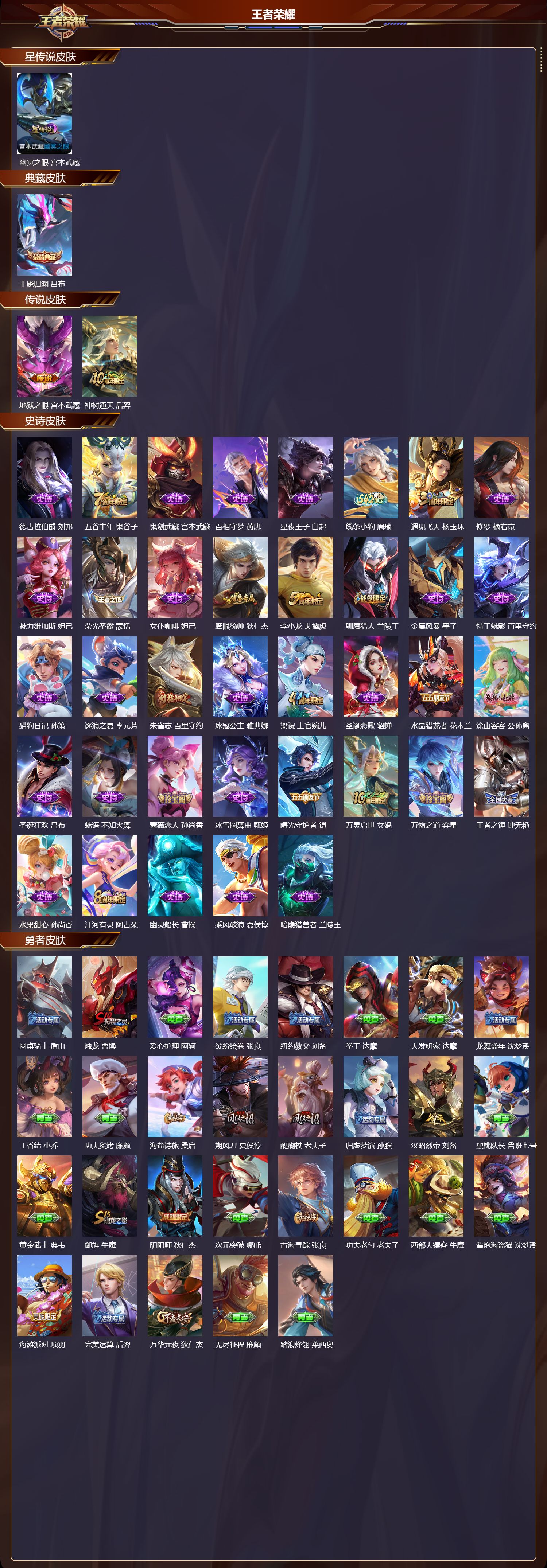 【37,史诗皮肤】,德古拉伯爵,刘邦,五谷丰年,鬼谷子,鬼剑武藏,宫本武藏,百相守梦,黄忠,星夜王子,白起,线条小狗,周瑜,遇见飞天,杨玉环,修罗,橘右京,魅力维加斯,妲己,荣光圣徽,蒙恬,女仆咖啡,妲己,鹰眼统帅,狄仁杰,李小龙,裴擒虎,驯魔猎人,兰陵王,金属风暴,墨子,特工魅影,百里守约,猫狗日记,孙策,逐浪之夏,李元芳,朱雀志,百里守约,冰冠公主,雅典娜,梁祝,上官婉儿,圣诞恋歌,貂蝉,水晶猎龙者,花木兰,涂山容容,公孙离,圣诞狂欢,吕布,魅语,不知火舞,蔷薇恋人,孙尚香,冰雪圆舞曲,甄姬,曙光守护者,铠,万灵启世,女娲,万物之道,弈星,王者之锤,钟无艳,水果甜心,孙尚香,江河有灵,阿古朵,幽灵船长,曹操,乘风破浪,夏侯惇,暗隐猎兽者,兰陵王,