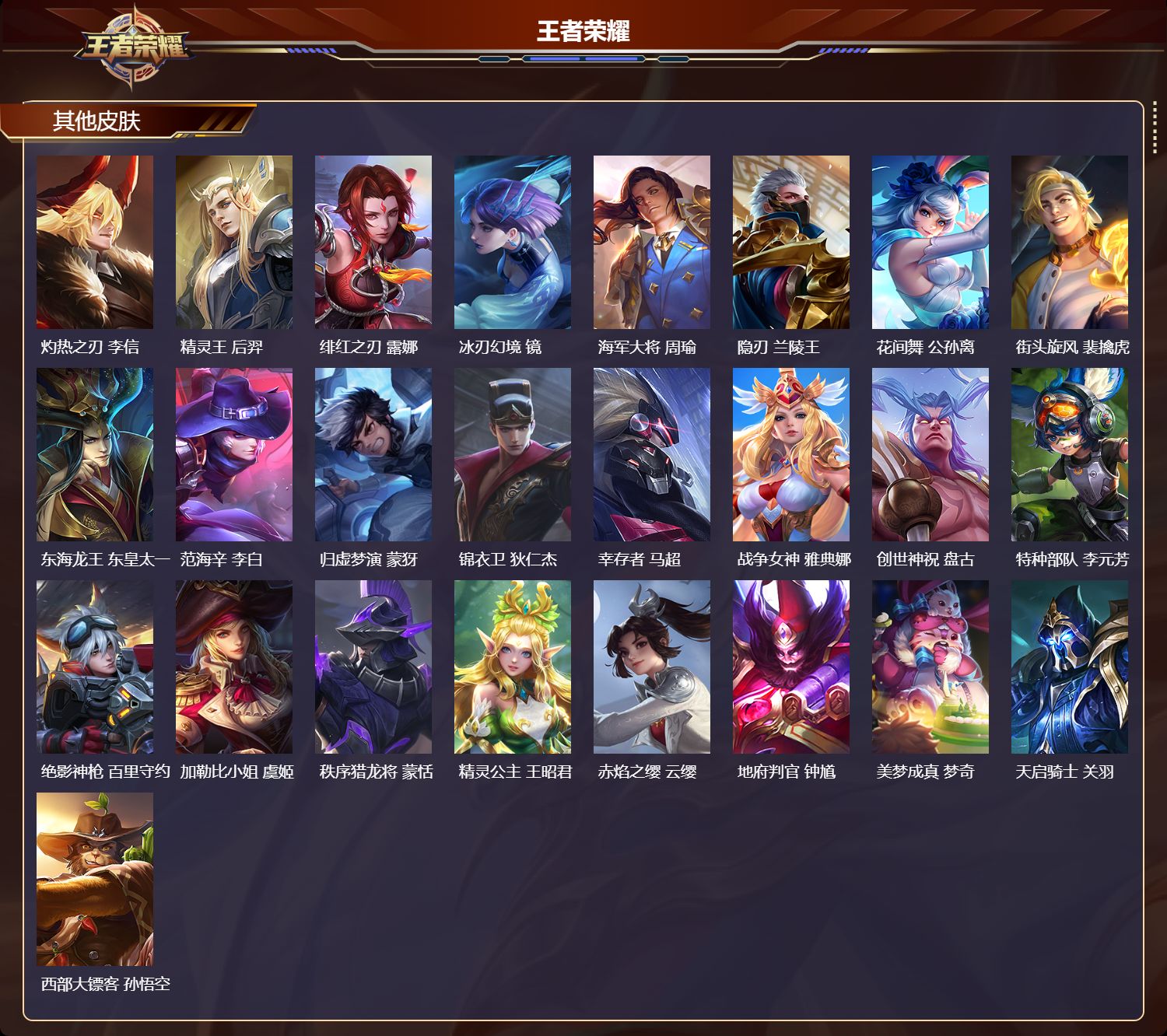 【30,其他皮肤】,圣殿之光,刘邦,龙域领主,铠,死神来了,曹操,未来旅行,孙膑,万圣前夜,小乔,灼热之刃,李信,精灵王,后羿,绯红之刃,露娜,冰刃幻境,镜,海军大将,周瑜,隐刃,兰陵王,花间舞,公孙离,街头旋风,裴擒虎,东海龙王,东皇太一,范海辛,李白,归虚梦演,蒙犽,锦衣卫,狄仁杰,幸存者,马超,战争女神,雅典娜,创世神祝,盘古,特种部队,李元芳,绝影神枪,百里守约,加勒比小姐,虞姬,秩序猎龙将,蒙恬,精灵公主,王昭君,赤焰之缨,云缨,地府判官,钟馗,美梦成真,梦奇,天启骑士,关羽,西部大镖客,孙悟空,
