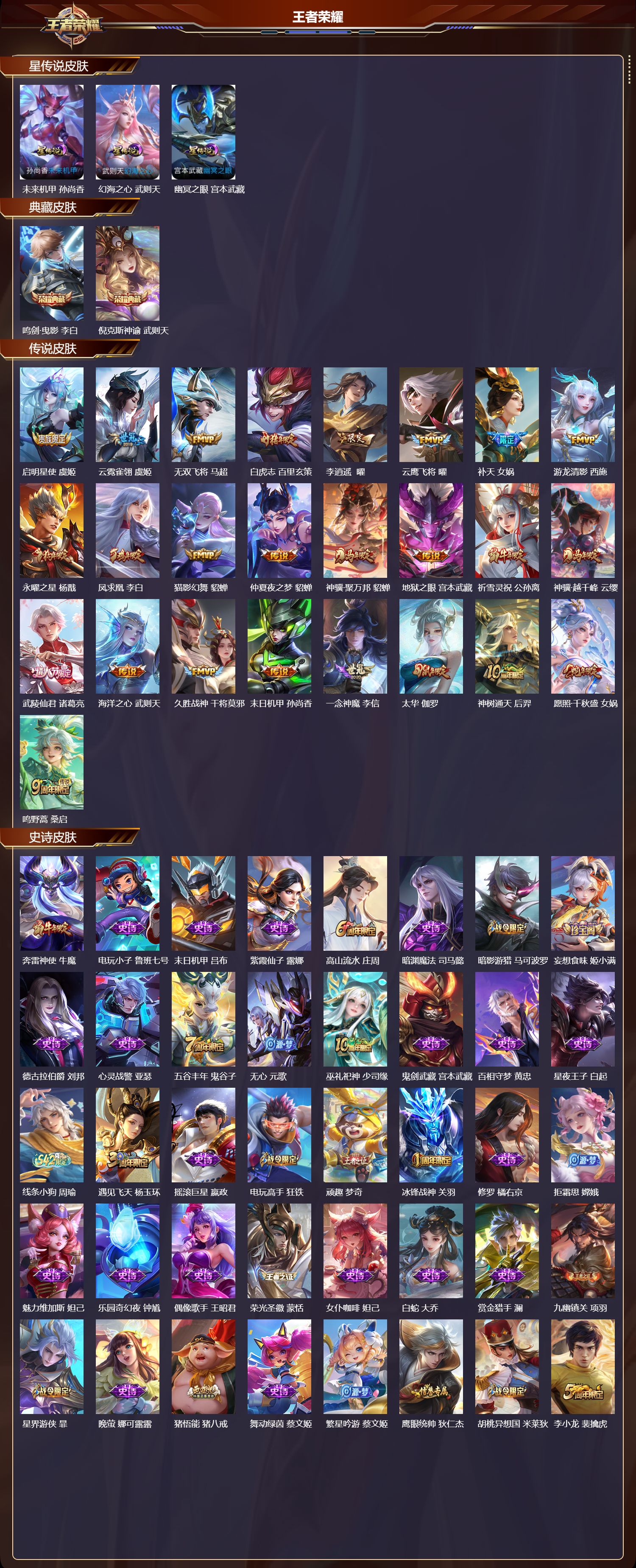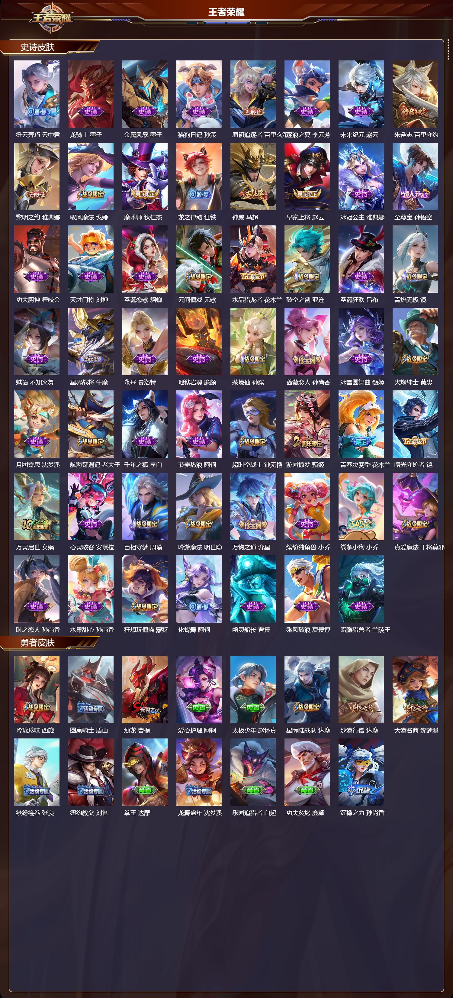 【95,史诗皮肤】,奔雷神使,牛魔,电玩小子,鲁班七号,末日机甲,吕布,紫霞仙子,露娜,高山流水,庄周,暗渊魔法,司马懿,暗影游猎,马可波罗,妄想食味,姬小满,德古拉伯爵,刘邦,心灵战警,亚瑟,五谷丰年,鬼谷子,无心,元歌,巫礼祀神,少司缘,鬼剑武藏,宫本武藏,百相守梦,黄忠,星夜王子,白起,线条小狗,周瑜,遇见飞天,杨玉环,摇滚巨星,嬴政,电玩高手,狂铁,顽趣,梦奇,冰锋战神,关羽,修罗,橘右京,拒霜思,嫦娥,魅力维加斯,妲己,乐园奇幻夜,钟馗,偶像歌手,王昭君,荣光圣徽,蒙恬,女仆咖啡,妲己,白蛇,大乔,赏金猎手,澜,九幽镇关,项羽,星界游侠,暃,晚萤,娜可露露,猪悟能,猪八戒,舞动绿茵,蔡文姬,繁星吟游,蔡文姬,鹰眼统帅,狄仁杰,胡桃异想国,米莱狄,李小龙,裴擒虎,纤云弄巧,云中君,龙骑士,墨子,金属风暴,墨子,猫狗日记,孙策,原初追逐者,百里玄策,逐浪之夏,李元芳,未来纪元,赵云,朱雀志,百里守约,黎明之约,雅典娜,驭风魔法,戈娅,魔术师,狄仁杰,龙之律动,狂铁,神威,马超,皇家上将,赵云,冰冠公主,雅典娜,至尊宝,孙悟空,功夫厨神,程咬金,天才门将,刘禅,圣诞恋歌,貂蝉,云间偶戏,元歌,水晶猎龙者,花木兰,破空之剑,亚连,圣诞狂欢,吕布,青焰无极,镜,魅语,不知火舞,星界战将,牛魔,永昼,夏洛特,地狱岩魂,廉颇,茶境仙,孙膑,蔷薇恋人,孙尚香,冰雪圆舞曲,甄姬,火炮绅士,黄忠,月团寄思,沈梦溪,航海奇遇记,老夫子,千年之狐,李白,节奏热浪,阿轲,超时空战士,钟无艳,游园惊梦,甄姬,青春决赛季,花木兰,曙光守护者,铠,万灵启世,女娲,心灵骇客,安琪拉,百相守梦,周瑜,吟游魔法,明世隐,万物之道,弈星,缤纷独角兽,小乔,线条小狗,小乔,真爱魔法,干将莫邪,时之恋人,孙尚香,水果甜心,孙尚香,狂想玩偶喵,蒙犽,化蝶舞,阿轲,幽灵船长,曹操,乘风破浪,夏侯惇,暗隐猎兽者,兰陵王,