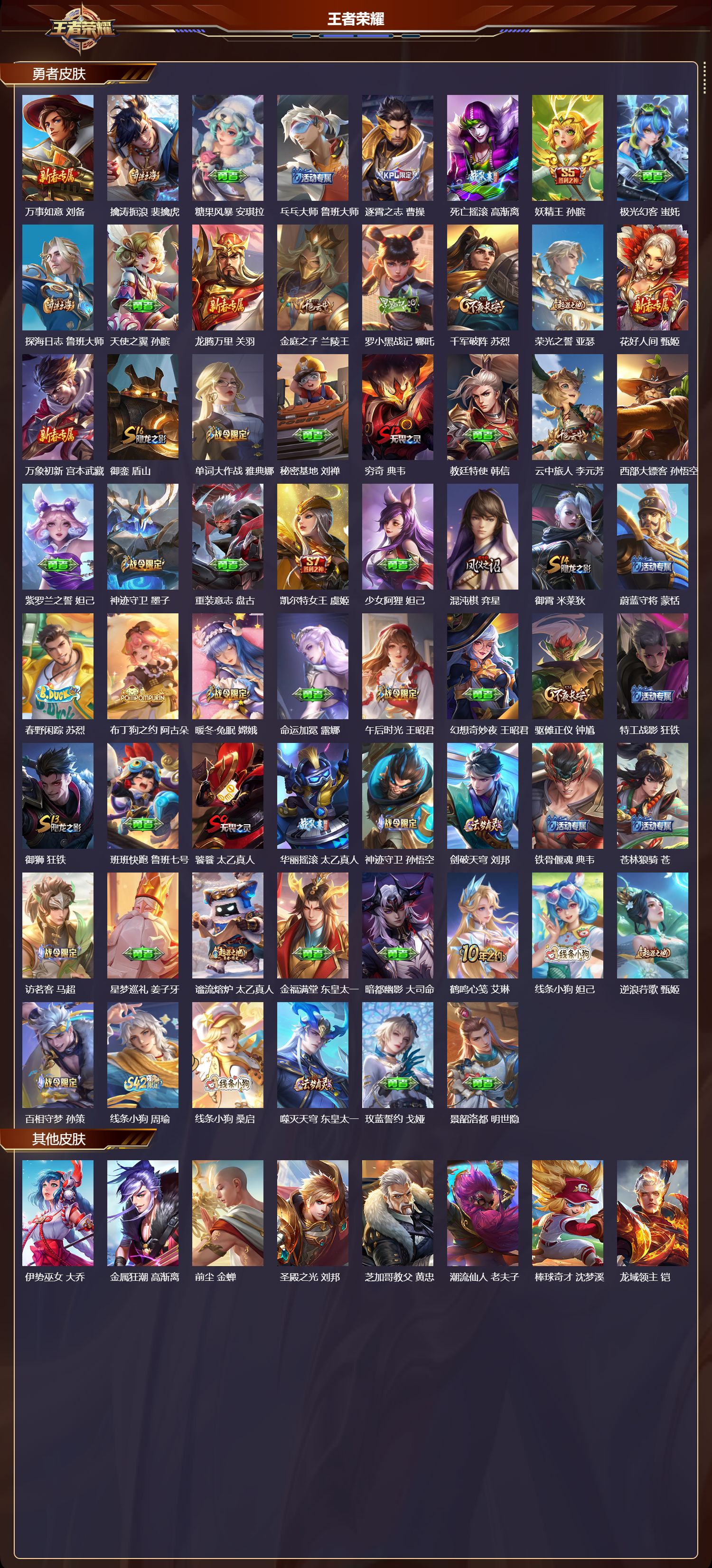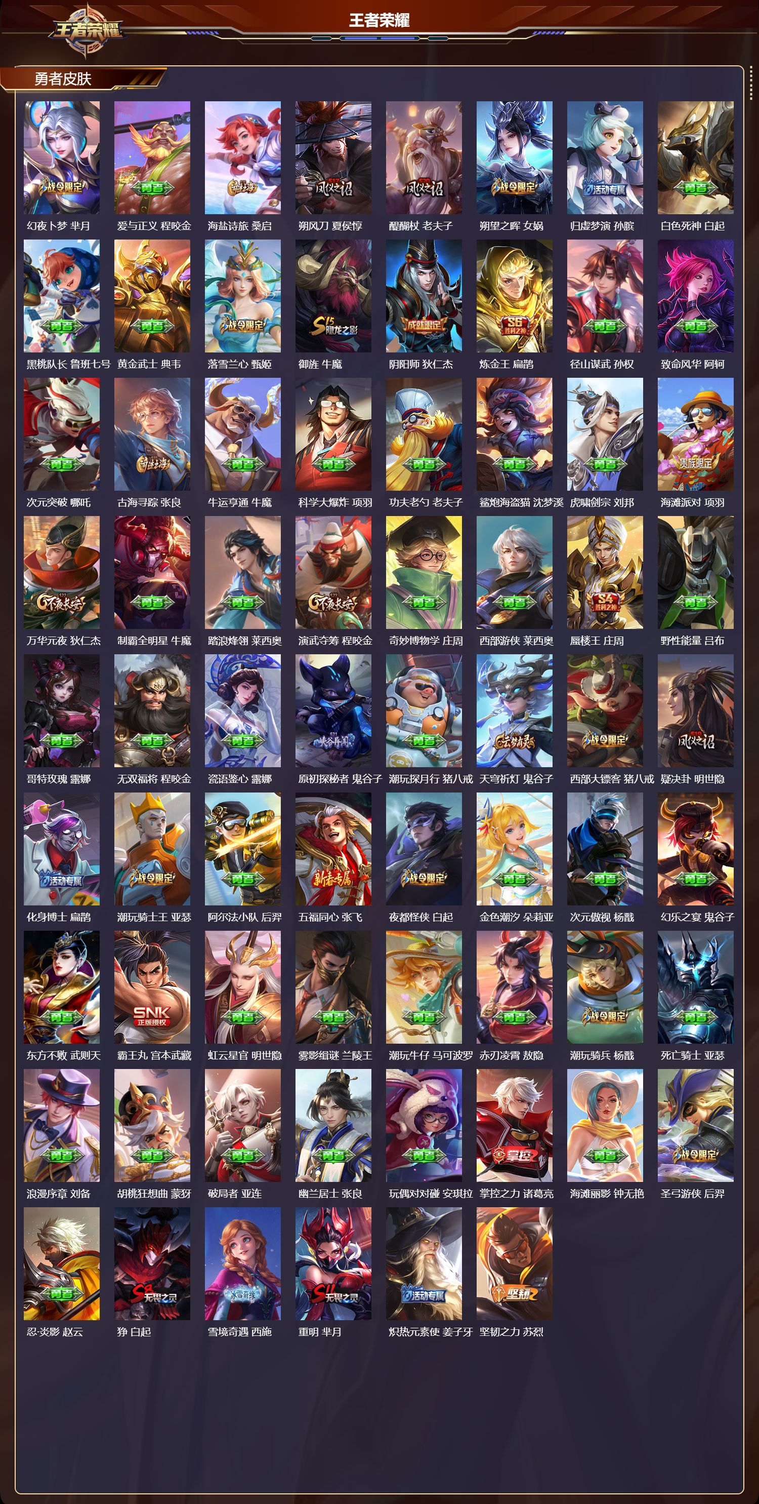 【147,勇者皮肤】,玲珑珍味,西施,圆桌骑士,盾山,烛龙,曹操,爱心护理,阿轲,太极少年,赵怀真,星际陆战队,达摩,沙漠行僧,达摩,大漠名商,沈梦溪,缤纷绘卷,张良,纽约教父,刘备,拳王,达摩,龙舞盛年,沈梦溪,乐园追猎者,白起,功夫炙烤,廉颇,沉稳之力,孙尚香,幻夜卜梦,芈月,爱与正义,程咬金,海盐诗旅,桑启,朔风刀,夏侯惇,醍醐杖,老夫子,朔望之晖,女娲,归虚梦演,孙膑,白色死神,白起,黑桃队长,鲁班七号,黄金武士,典韦,落雪兰心,甄姬,御旌,牛魔,阴阳师,狄仁杰,炼金王,扁鹊,径山谋武,孙权,致命风华,阿轲,次元突破,哪吒,古海寻踪,张良,牛运亨通,牛魔,科学大爆炸,项羽,功夫老勺,老夫子,鲨炮海盗猫,沈梦溪,虎啸剑宗,刘邦,海滩派对,项羽,万华元夜,狄仁杰,制霸全明星,牛魔,踏浪烽翎,莱西奥,演武夺筹,程咬金,奇妙博物学,庄周,西部游侠,莱西奥,蜃楼王,庄周,野性能量,吕布,哥特玫瑰,露娜,无双福将,程咬金,瓷语鉴心,露娜,原初探秘者,鬼谷子,潮玩探月行,猪八戒,天穹祈灯,鬼谷子,西部大镖客,猪八戒,疑决卦,明世隐,化身博士,扁鹊,潮玩骑士王,亚瑟,阿尔法小队,后羿,五福同心,张飞,夜都怪侠,白起,金色潮汐,朵莉亚,次元傲视,杨戬,幻乐之宴,鬼谷子,东方不败,武则天,霸王丸,宫本武藏,虹云星官,明世隐,雾影缉谜,兰陵王,潮玩牛仔,马可波罗,赤刃凌霄,敖隐,潮玩骑兵,杨戬,死亡骑士,亚瑟,浪漫序章,刘备,胡桃狂想曲,蒙犽,破局者,亚连,幽兰居士,张良,玩偶对对碰,安琪拉,掌控之力,诸葛亮,海滩丽影,钟无艳,圣弓游侠,后羿,忍·炎影,赵云,狰,白起,雪境奇遇,西施,重明,芈月,炽热元素使,姜子牙,坚韧之力,苏烈,万事如意,刘备,擒涛扼浪,裴擒虎,糖果风暴,安琪拉,乓乓大师,鲁班大师,逐霄之志,曹操,死亡摇滚,高渐离,妖精王,孙膑,极光幻客,蚩奼,探海日志,鲁班大师,天使之翼,孙膑,龙腾万里,关羽,金庭之子,兰陵王,罗小黑战记,哪吒,千军破阵,苏烈,荣光之誓,亚瑟,花好人间,甄姬,万象初新,宫本武藏,御銮,盾山,单词大作战,雅典娜,秘密基地,刘禅,穷奇,典韦,教廷特使,韩信,云中旅人,李元芳,西部大镖客,孙悟空,紫罗兰之誓,妲己,神迹守卫,墨子,重装意志,盘古,凯尔特女王,虞姬,少女阿狸,妲己,混沌棋,弈星,御霄,米莱狄,蔚蓝守将,蒙恬,春野闲踪,苏烈,布丁狗之约,阿古朵,暖冬·兔眠,嫦娥,命运加冕,露娜,午后时光,王昭君,幻想奇妙夜,王昭君,驱傩正仪,钟馗,特工战影,狂铁,御狮,狂铁,班班快跑,鲁班七号,饕餮,太乙真人,华丽摇滚,太乙真人,神迹守卫,孙悟空,剑破天穹,刘邦,铁骨偃魂,典韦,苍林狼骑,苍,访茗客,马超,星梦巡礼,姜子牙,谧流熔炉,太乙真人,金福满堂,东皇太一,暗都幽影,大司命,鹤鸣心笺,艾琳,线条小狗,妲己,逆浪荇歌,甄姬,百相守梦,孙策,线条小狗,周瑜,线条小狗,桑启,噬灭天穹,东皇太一,玫蓝誓约,戈娅,景韶洛都,明世隐,