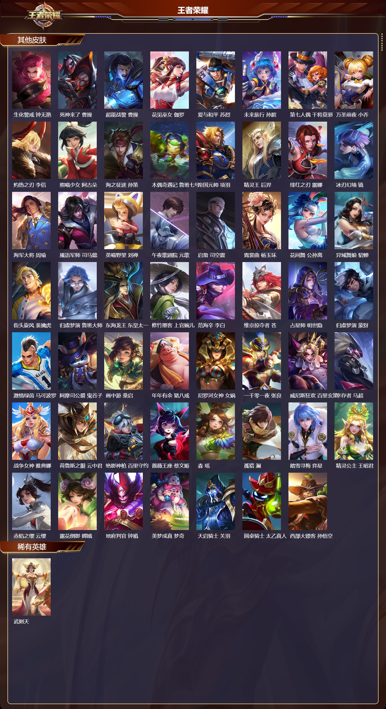 【63,其他皮肤】,伊势巫女,大乔,金属狂潮,高渐离,前尘,金蝉,圣殿之光,刘邦,芝加哥教父,黄忠,潮流仙人,老夫子,棒球奇才,沈梦溪,龙域领主,铠,生化警戒,钟无艳,死神来了,曹操,超能战警,曹操,花见巫女,伽罗,爱与和平,苏烈,未来旅行,孙膑,第七人偶,干将莫邪,万圣前夜,小乔,灼热之刃,李信,熊喵少女,阿古朵,海之征途,孙策,木偶奇遇记,鲁班七号,帝国元帅,项羽,精灵王,后羿,绯红之刃,露娜,冰刃幻境,镜,海军大将,周瑜,魇语军师,司马懿,英喵野望,刘禅,午夜歌剧院,元歌,启蛰,司空震,霓裳曲,杨玉环,花间舞,公孙离,异域舞娘,貂蝉,街头旋风,裴擒虎,归虚梦演,鲁班大师,东海龙王,东皇太一,修竹墨客,上官婉儿,范海辛,李白,维京掠夺者,苍,占星师,明世隐,归虚梦演,蒙犽,激情绿茵,马可波罗,阿摩司公爵,鬼谷子,画中游,桑启,年年有余,猪八戒,尼罗河女神,女娲,一千零一夜,张良,威尼斯狂欢,百里玄策,幸存者,马超,战争女神,雅典娜,荷鲁斯之眼,云中君,绝影神枪,百里守约,蔷薇王座,蔡文姬,森,瑶,孤猎,澜,踏雪寻梅,弈星,精灵公主,王昭君,赤焰之缨,云缨,露花倒影,嫦娥,地府判官,钟馗,美梦成真,梦奇,天启骑士,关羽,圆桌骑士,太乙真人,西部大镖客,孙悟空,
