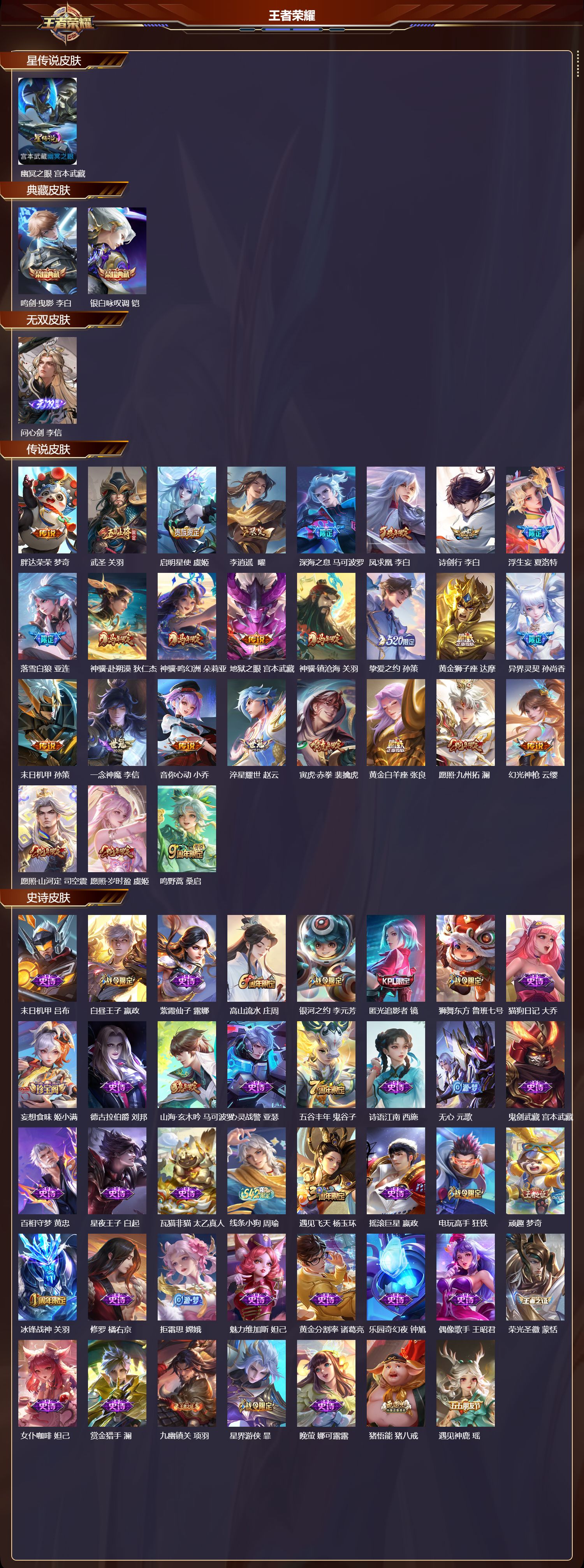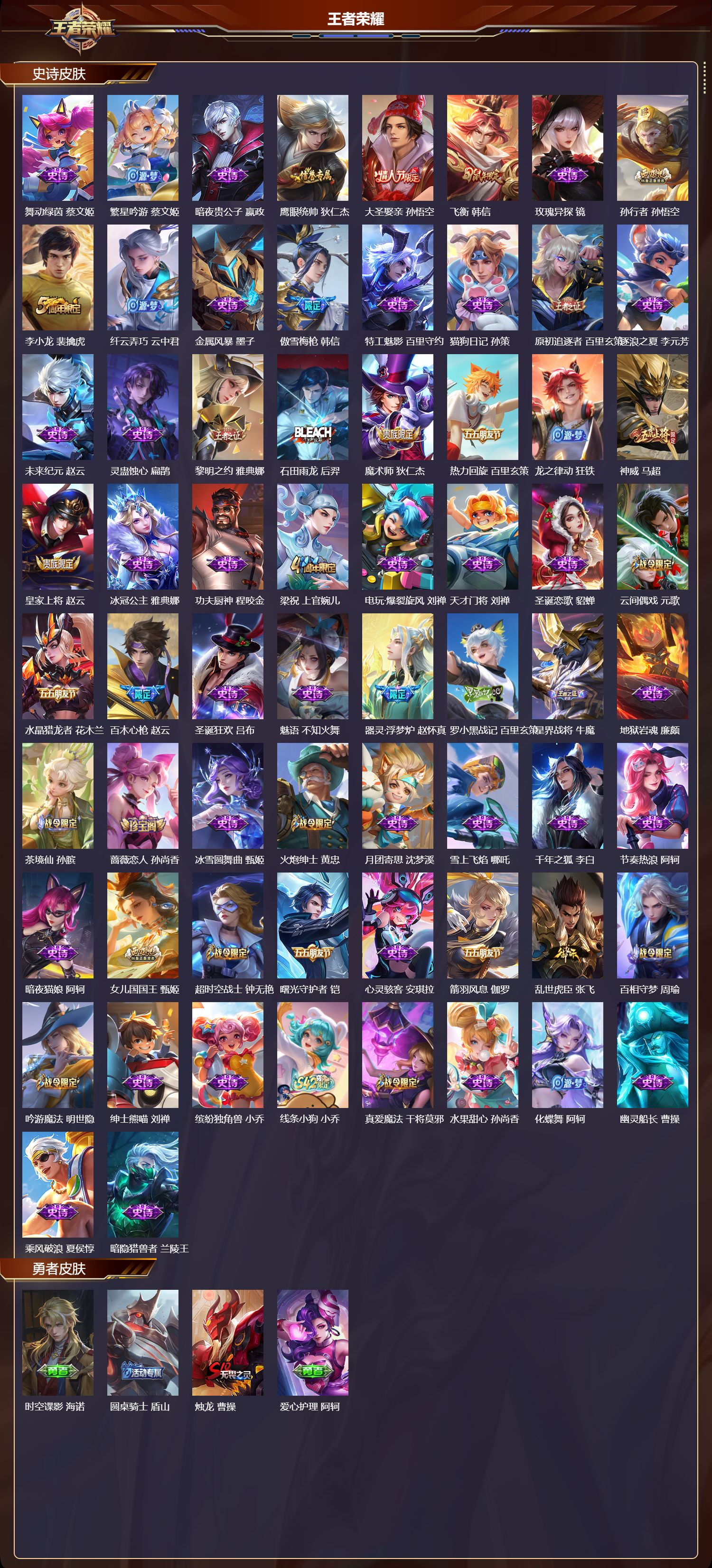 【105,史诗皮肤】,末日机甲,吕布,白昼王子,嬴政,紫霞仙子,露娜,高山流水,庄周,银河之约,李元芳,匿光追影者,镜,狮舞东方,鲁班七号,猫狗日记,大乔,妄想食味,姬小满,德古拉伯爵,刘邦,山海·玄木吟,马可波罗,心灵战警,亚瑟,五谷丰年,鬼谷子,诗语江南,西施,无心,元歌,鬼剑武藏,宫本武藏,百相守梦,黄忠,星夜王子,白起,瓦猫非猫,太乙真人,线条小狗,周瑜,遇见飞天,杨玉环,摇滚巨星,嬴政,电玩高手,狂铁,顽趣,梦奇,冰锋战神,关羽,修罗,橘右京,拒霜思,嫦娥,魅力维加斯,妲己,黄金分割率,诸葛亮,乐园奇幻夜,钟馗,偶像歌手,王昭君,荣光圣徽,蒙恬,女仆咖啡,妲己,赏金猎手,澜,九幽镇关,项羽,星界游侠,暃,晚萤,娜可露露,猪悟能,猪八戒,遇见神鹿,瑶,舞动绿茵,蔡文姬,繁星吟游,蔡文姬,暗夜贵公子,嬴政,鹰眼统帅,狄仁杰,大圣娶亲,孙悟空,飞衡,韩信,玫瑰异探,镜,孙行者,孙悟空,李小龙,裴擒虎,纤云弄巧,云中君,金属风暴,墨子,傲雪梅枪,韩信,特工魅影,百里守约,猫狗日记,孙策,原初追逐者,百里玄策,逐浪之夏,李元芳,未来纪元,赵云,灵蛊蚀心,扁鹊,黎明之约,雅典娜,石田雨龙,后羿,魔术师,狄仁杰,热力回旋,百里玄策,龙之律动,狂铁,神威,马超,皇家上将,赵云,冰冠公主,雅典娜,功夫厨神,程咬金,梁祝,上官婉儿,电玩·爆裂旋风,刘禅,天才门将,刘禅,圣诞恋歌,貂蝉,云间偶戏,元歌,水晶猎龙者,花木兰,百木心枪,赵云,圣诞狂欢,吕布,魅语,不知火舞,器灵·浮梦炉,赵怀真,罗小黑战记,百里玄策,星界战将,牛魔,地狱岩魂,廉颇,茶境仙,孙膑,蔷薇恋人,孙尚香,冰雪圆舞曲,甄姬,火炮绅士,黄忠,月团寄思,沈梦溪,雪上飞焰,哪吒,千年之狐,李白,节奏热浪,阿轲,暗夜猫娘,阿轲,女儿国国王,甄姬,超时空战士,钟无艳,曙光守护者,铠,心灵骇客,安琪拉,箭羽风息,伽罗,乱世虎臣,张飞,百相守梦,周瑜,吟游魔法,明世隐,绅士熊喵,刘禅,缤纷独角兽,小乔,线条小狗,小乔,真爱魔法,干将莫邪,水果甜心,孙尚香,化蝶舞,阿轲,幽灵船长,曹操,乘风破浪,夏侯惇,暗隐猎兽者,兰陵王,