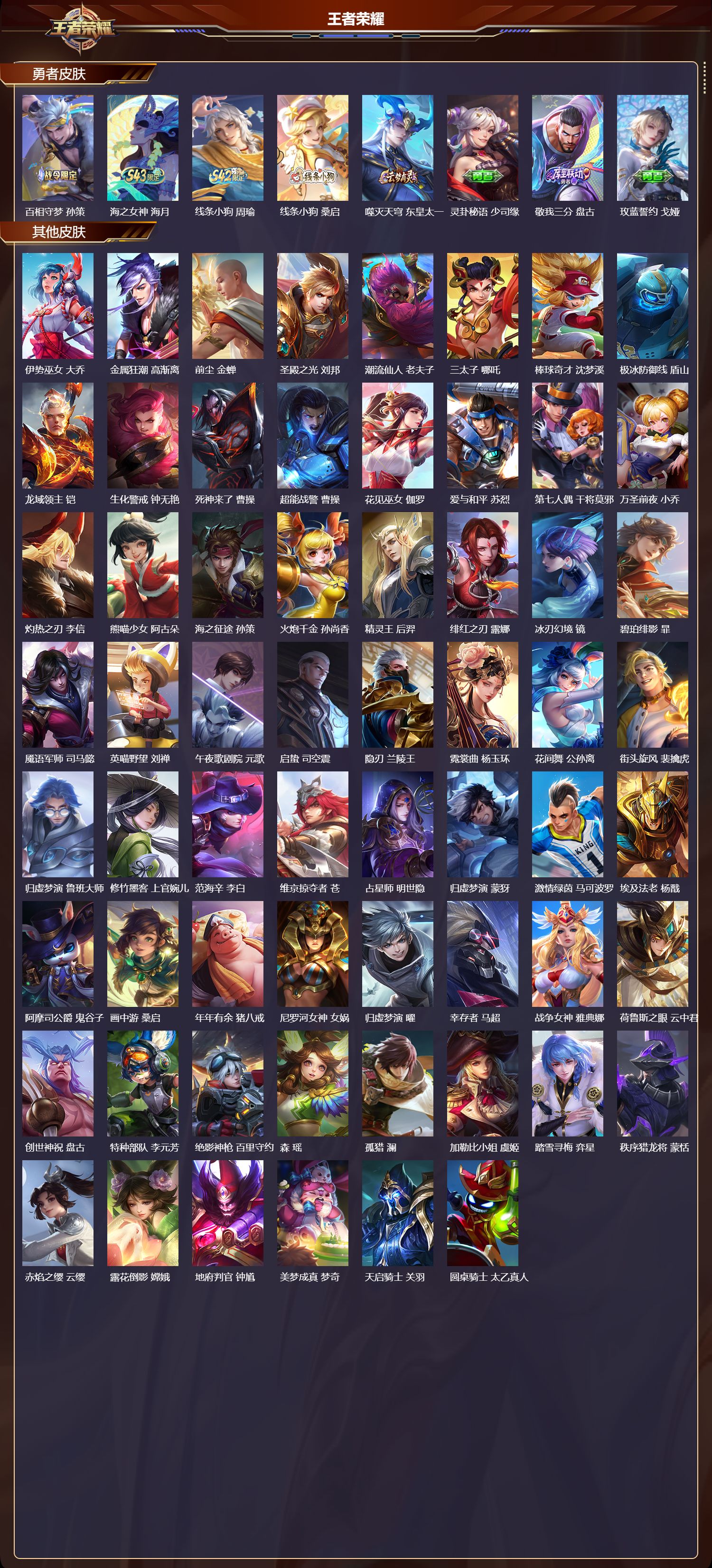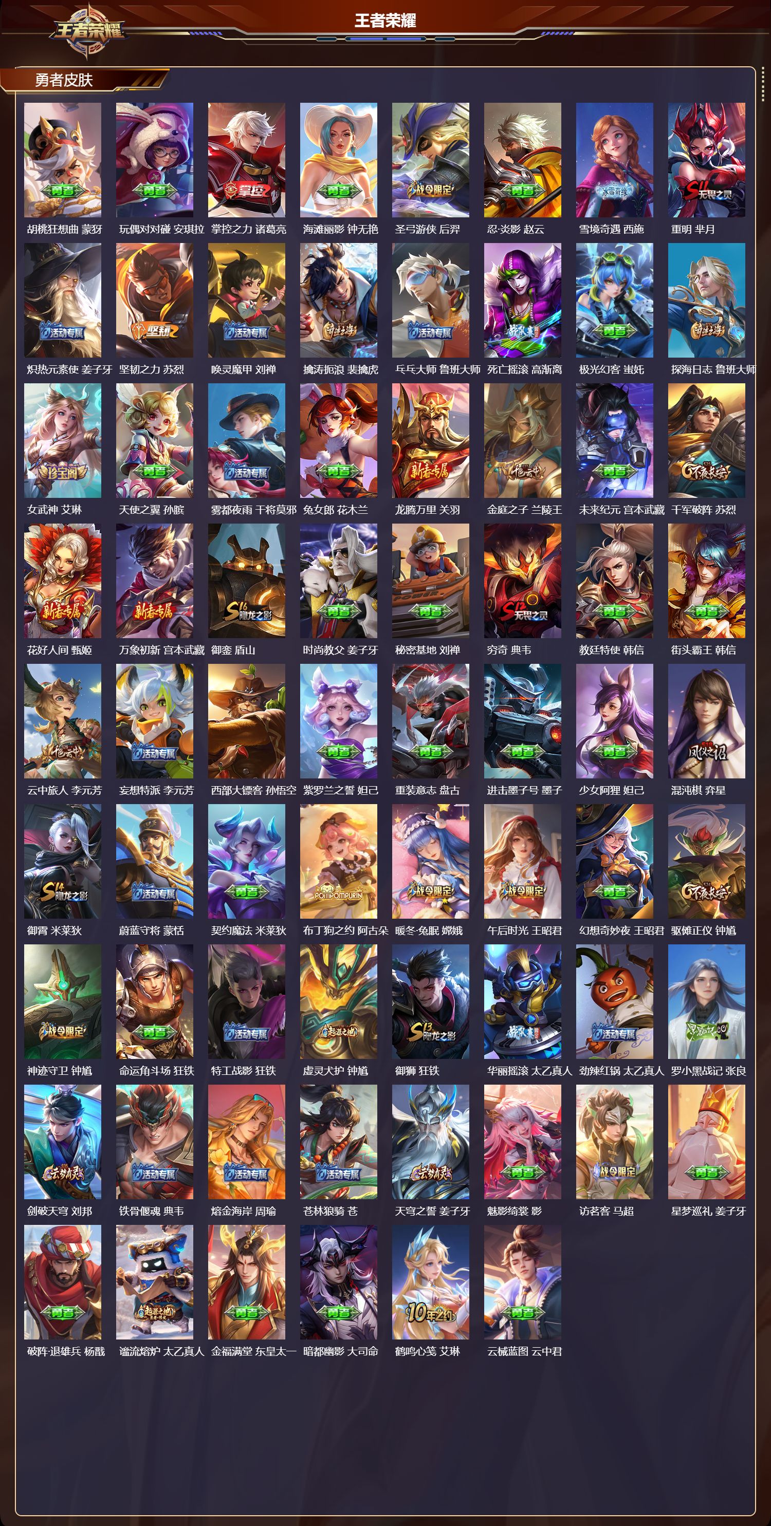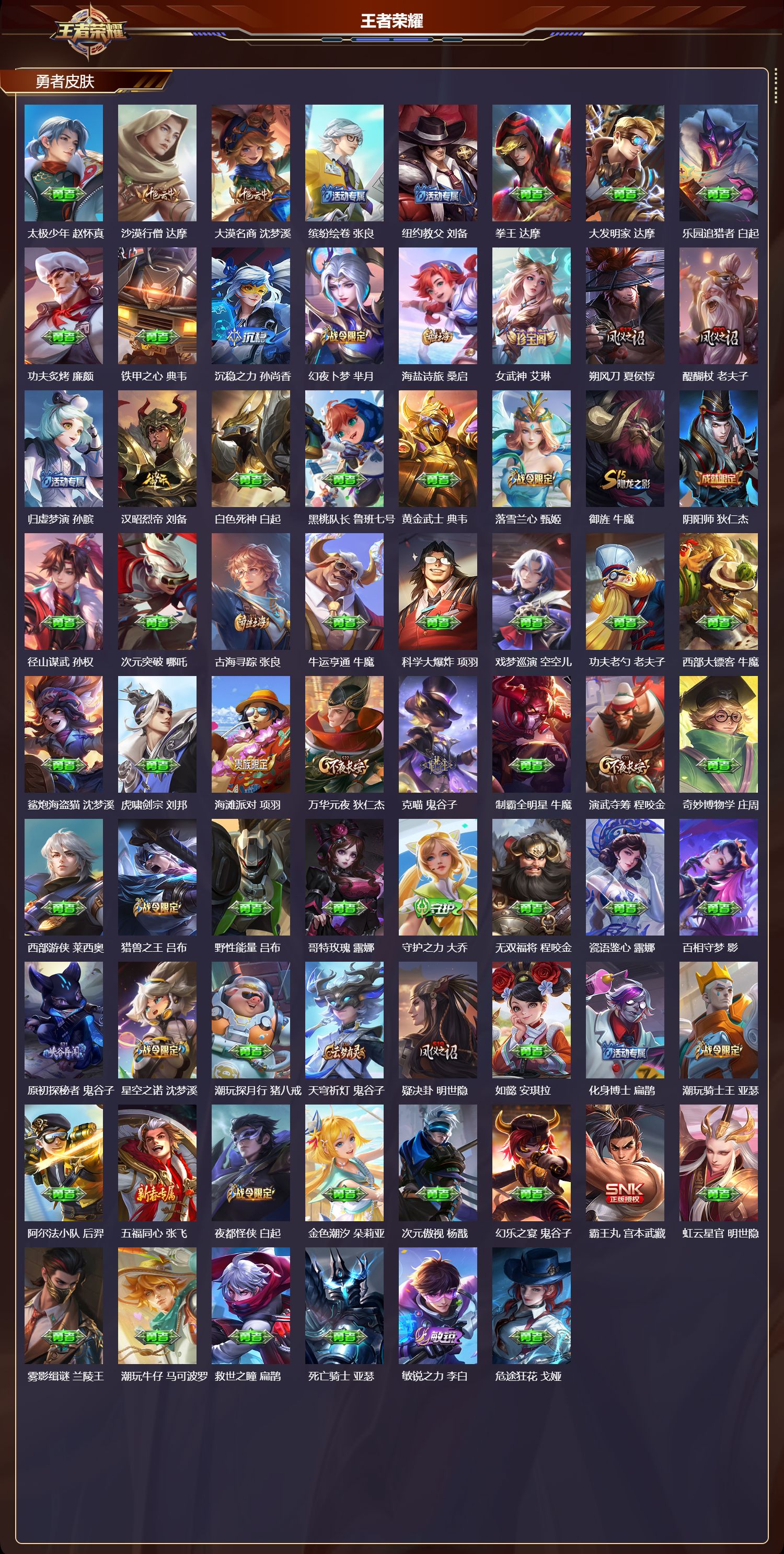 【151,勇者皮肤】,时空谍影,海诺,圆桌骑士,盾山,烛龙,曹操,爱心护理,阿轲,太极少年,赵怀真,沙漠行僧,达摩,大漠名商,沈梦溪,缤纷绘卷,张良,纽约教父,刘备,拳王,达摩,大发明家,达摩,乐园追猎者,白起,功夫炙烤,廉颇,铁甲之心,典韦,沉稳之力,孙尚香,幻夜卜梦,芈月,海盐诗旅,桑启,朔风刀,夏侯惇,醍醐杖,老夫子,归虚梦演,孙膑,汉昭烈帝,刘备,白色死神,白起,黑桃队长,鲁班七号,黄金武士,典韦,落雪兰心,甄姬,御旌,牛魔,阴阳师,狄仁杰,径山谋武,孙权,次元突破,哪吒,古海寻踪,张良,牛运亨通,牛魔,科学大爆炸,项羽,戏梦巡演,空空儿,功夫老勺,老夫子,西部大镖客,牛魔,鲨炮海盗猫,沈梦溪,虎啸剑宗,刘邦,海滩派对,项羽,万华元夜,狄仁杰,克喵,鬼谷子,制霸全明星,牛魔,演武夺筹,程咬金,奇妙博物学,庄周,西部游侠,莱西奥,猎兽之王,吕布,野性能量,吕布,哥特玫瑰,露娜,守护之力,大乔,无双福将,程咬金,瓷语鉴心,露娜,百相守梦,影,原初探秘者,鬼谷子,星空之诺,沈梦溪,潮玩探月行,猪八戒,天穹祈灯,鬼谷子,疑决卦,明世隐,如懿,安琪拉,化身博士,扁鹊,潮玩骑士王,亚瑟,阿尔法小队,后羿,五福同心,张飞,夜都怪侠,白起,金色潮汐,朵莉亚,次元傲视,杨戬,幻乐之宴,鬼谷子,霸王丸,宫本武藏,虹云星官,明世隐,雾影缉谜,兰陵王,潮玩牛仔,马可波罗,救世之瞳,扁鹊,死亡骑士,亚瑟,敏锐之力,李白,危途狂花,戈娅,胡桃狂想曲,蒙犽,玩偶对对碰,安琪拉,掌控之力,诸葛亮,海滩丽影,钟无艳,圣弓游侠,后羿,忍·炎影,赵云,雪境奇遇,西施,重明,芈月,炽热元素使,姜子牙,坚韧之力,苏烈,唤灵魔甲,刘禅,擒涛扼浪,裴擒虎,乓乓大师,鲁班大师,死亡摇滚,高渐离,极光幻客,蚩奼,探海日志,鲁班大师,女武神,艾琳,天使之翼,孙膑,雾都夜雨,干将莫邪,兔女郎,花木兰,龙腾万里,关羽,金庭之子,兰陵王,未来纪元,宫本武藏,千军破阵,苏烈,花好人间,甄姬,万象初新,宫本武藏,御銮,盾山,时尚教父,姜子牙,秘密基地,刘禅,穷奇,典韦,教廷特使,韩信,街头霸王,韩信,云中旅人,李元芳,妄想特派,李元芳,西部大镖客,孙悟空,紫罗兰之誓,妲己,重装意志,盘古,进击墨子号,墨子,少女阿狸,妲己,混沌棋,弈星,御霄,米莱狄,蔚蓝守将,蒙恬,契约魔法,米莱狄,布丁狗之约,阿古朵,暖冬·兔眠,嫦娥,午后时光,王昭君,幻想奇妙夜,王昭君,驱傩正仪,钟馗,神迹守卫,钟馗,命运角斗场,狂铁,特工战影,狂铁,虚灵犬护,钟馗,御狮,狂铁,华丽摇滚,太乙真人,劲辣红锅,太乙真人,罗小黑战记,张良,剑破天穹,刘邦,铁骨偃魂,典韦,熔金海岸,周瑜,苍林狼骑,苍,天穹之誓,姜子牙,魅影绮裳,影,访茗客,马超,星梦巡礼,姜子牙,破阵·退雄兵,杨戬,谧流熔炉,太乙真人,金福满堂,东皇太一,暗都幽影,大司命,鹤鸣心笺,艾琳,云械蓝图,云中君,百相守梦,孙策,海之女神,海月,线条小狗,周瑜,线条小狗,桑启,噬灭天穹,东皇太一,灵卦秘语,少司缘,敬我三分,盘古,玫蓝誓约,戈娅,