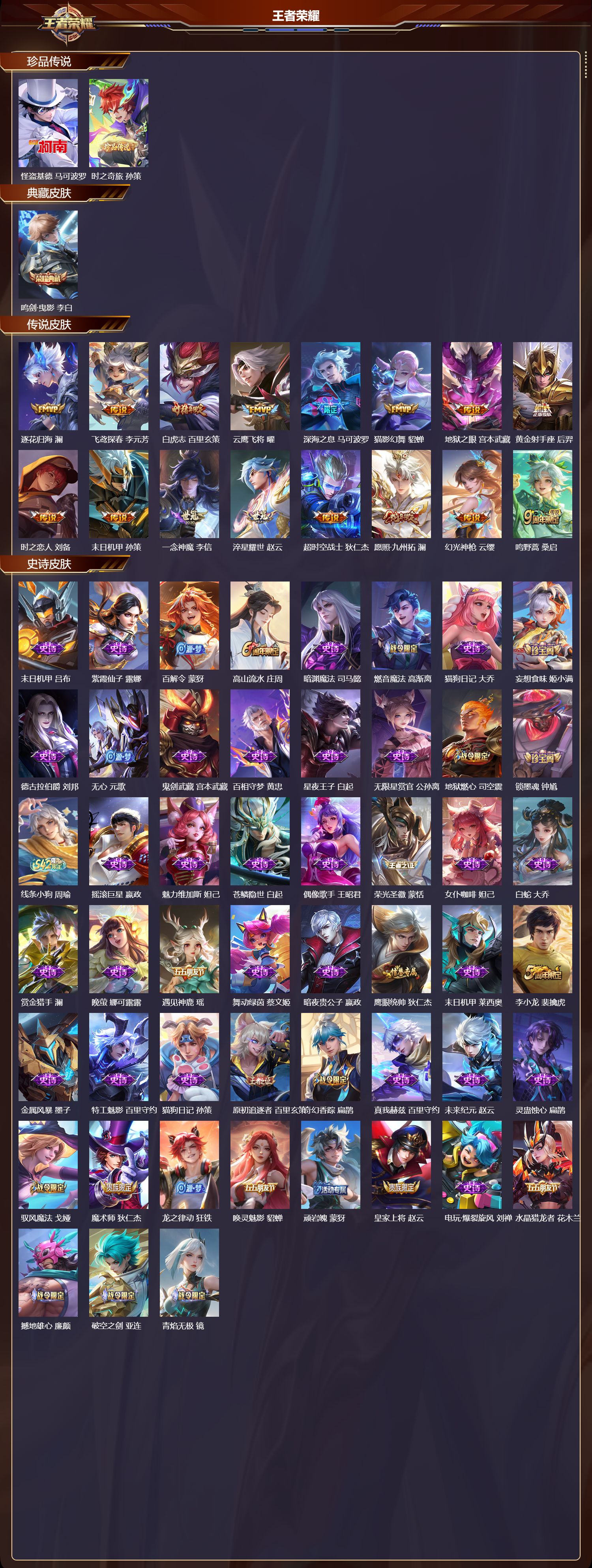 【16,传说皮肤】逐花归海,澜,飞鸢探春,李元芳,白虎志,百里玄策,云鹰飞将,曜,深海之息,马可波罗,猫影幻舞,貂蝉,地狱之眼,宫本武藏,黄金射手座,后羿,时之恋人,刘备,末日机甲,孙策,一念神魔,李信,淬星耀世,赵云,超时空战士,狄仁杰,愿照·九州拓,澜,幻光神枪,云缨,鸣野蒿,桑启,