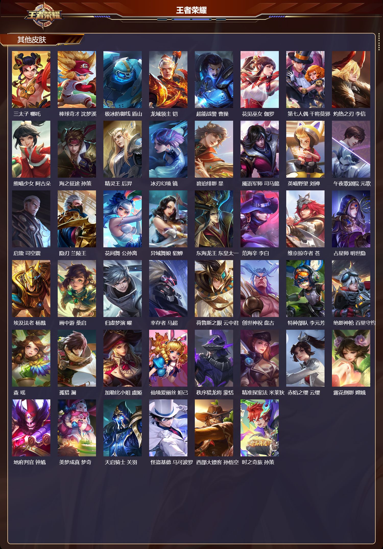 【51,其他皮肤】伊势巫女,大乔,前尘,金蝉,战争骑士,夏侯惇,圣殿之光,刘邦,芝加哥教父,黄忠,三太子,哪吒,棒球奇才,沈梦溪,极冰防御线,盾山,龙域领主,铠,超能战警,曹操,花见巫女,伽罗,第七人偶,干将莫邪,灼热之刃,李信,熊喵少女,阿古朵,海之征途,孙策,精灵王,后羿,冰刃幻境,镜,碧珀绯影,暃,魇语军师,司马懿,英喵野望,刘禅,午夜歌剧院,元歌,启蛰,司空震,隐刃,兰陵王,花间舞,公孙离,异域舞娘,貂蝉,东海龙王,东皇太一,范海辛,李白,维京掠夺者,苍,占星师,明世隐,埃及法老,杨戬,画中游,桑启,归虚梦演,曜,幸存者,马超,荷鲁斯之眼,云中君,创世神祝,盘古,特种部队,李元芳,绝影神枪,百里守约,森,瑶,孤猎,澜,加勒比小姐,虞姬,仙境爱丽丝,妲己,秩序猎龙将,蒙恬,精准探案法,米莱狄,赤焰之缨,云缨,露花倒影,嫦娥,地府判官,钟馗,美梦成真,梦奇,天启骑士,关羽,怪盗基德,马可波罗,西部大镖客,孙悟空,时之奇旅,孙策,