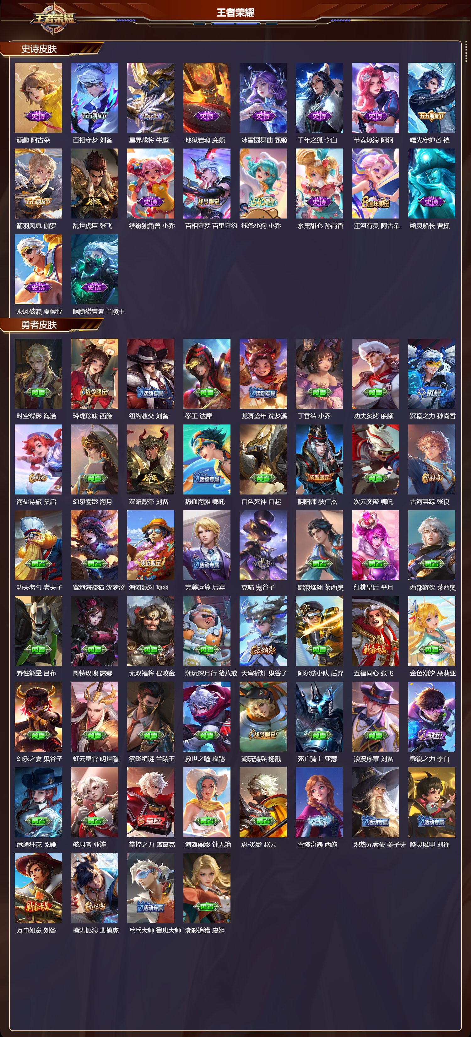 【69,史诗皮肤】末日机甲,吕布,紫霞仙子,露娜,百解令,蒙犽,高山流水,庄周,暗渊魔法,司马懿,燃音魔法,高渐离,猫狗日记,大乔,妄想食味,姬小满,德古拉伯爵,刘邦,无心,元歌,鬼剑武藏,宫本武藏,百相守梦,黄忠,星夜王子,白起,无限星赏官,公孙离,地狱燃心,司空震,锁墨魂,钟馗,线条小狗,周瑜,摇滚巨星,嬴政,魅力维加斯,妲己,苍鳞隐世,白起,偶像歌手,王昭君,荣光圣徽,蒙恬,女仆咖啡,妲己,白蛇,大乔,赏金猎手,澜,晚萤,娜可露露,遇见神鹿,瑶,舞动绿茵,蔡文姬,暗夜贵公子,嬴政,鹰眼统帅,狄仁杰,末日机甲,莱西奥,李小龙,裴擒虎,金属风暴,墨子,特工魅影,百里守约,猫狗日记,孙策,原初追逐者,百里玄策,奇幻香踪,扁鹊,真我赫兹,百里守约,未来纪元,赵云,灵蛊蚀心,扁鹊,驭风魔法,戈娅,魔术师,狄仁杰,龙之律动,狂铁,唤灵魅影,貂蝉,顽岩魄,蒙犽,皇家上将,赵云,电玩·爆裂旋风,刘禅,水晶猎龙者,花木兰,撼地雄心,廉颇,破空之剑,亚连,青焰无极,镜,顽趣,阿古朵,百相守梦,刘备,星界战将,牛魔,地狱岩魂,廉颇,冰雪圆舞曲,甄姬,千年之狐,李白,节奏热浪,阿轲,曙光守护者,铠,箭羽风息,伽罗,乱世虎臣,张飞,缤纷独角兽,小乔,百相守梦,百里守约,线条小狗,小乔,水果甜心,孙尚香,江河有灵,阿古朵,幽灵船长,曹操,乘风破浪,夏侯惇,暗隐猎兽者,兰陵王,