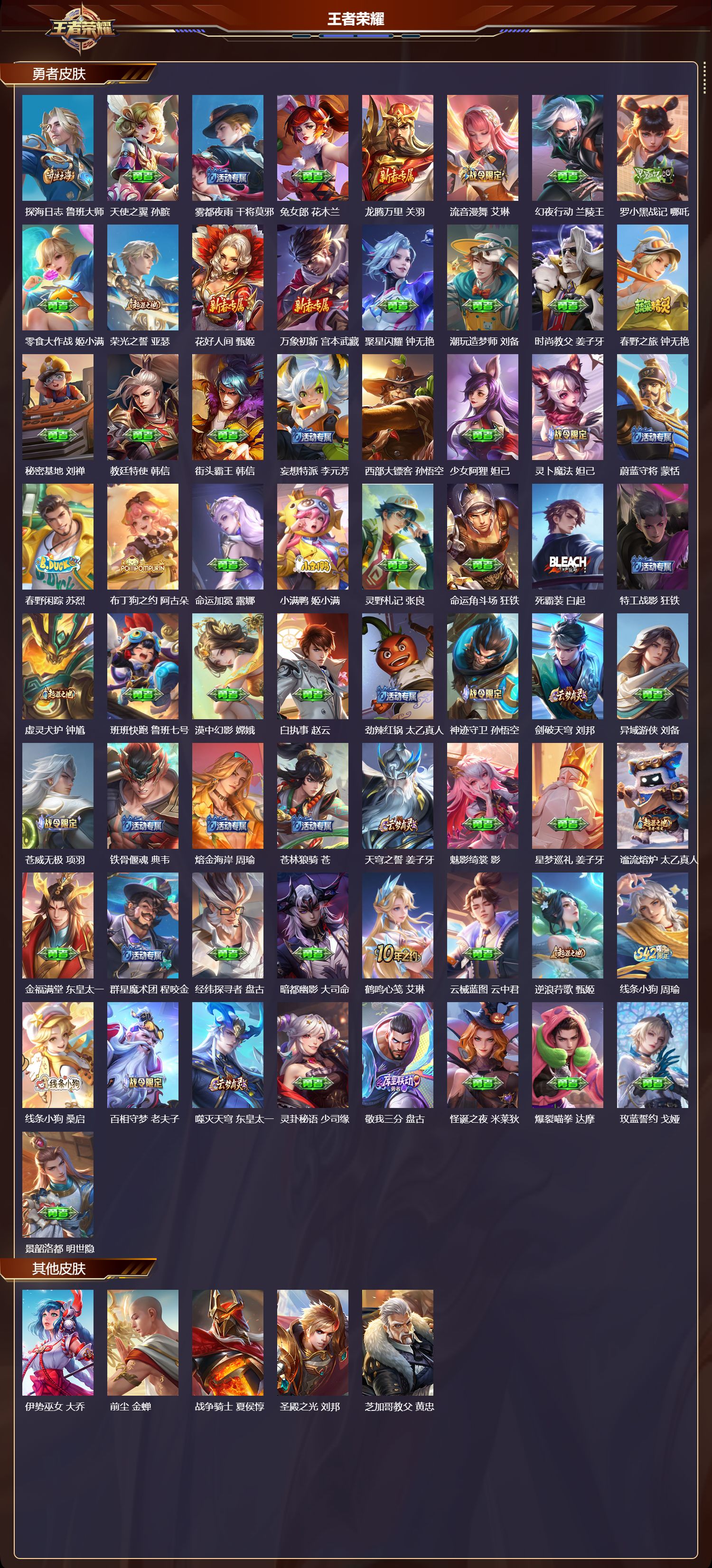 【117,勇者皮肤】时空谍影,海诺,玲珑珍味,西施,纽约教父,刘备,拳王,达摩,龙舞盛年,沈梦溪,丁香结,小乔,功夫炙烤,廉颇,沉稳之力,孙尚香,海盐诗旅,桑启,幻泉雾影,海月,汉昭烈帝,刘备,热血海滩,哪吒,白色死神,白起,阴阳师,狄仁杰,次元突破,哪吒,古海寻踪,张良,功夫老勺,老夫子,鲨炮海盗猫,沈梦溪,海滩派对,项羽,完美运算,后羿,克喵,鬼谷子,踏浪烽翎,莱西奥,红桃皇后,芈月,西部游侠,莱西奥,野性能量,吕布,哥特玫瑰,露娜,无双福将,程咬金,潮玩探月行,猪八戒,天穹祈灯,鬼谷子,阿尔法小队,后羿,五福同心,张飞,金色潮汐,朵莉亚,幻乐之宴,鬼谷子,虹云星官,明世隐,雾影缉谜,兰陵王,救世之瞳,扁鹊,潮玩骑兵,杨戬,死亡骑士,亚瑟,浪漫序章,刘备,敏锐之力,李白,危途狂花,戈娅,破局者,亚连,掌控之力,诸葛亮,海滩丽影,钟无艳,忍·炎影,赵云,雪境奇遇,西施,炽热元素使,姜子牙,唤灵魔甲,刘禅,万事如意,刘备,擒涛扼浪,裴擒虎,乓乓大师,鲁班大师,溯影追猎,虞姬,探海日志,鲁班大师,天使之翼,孙膑,雾都夜雨,干将莫邪,兔女郎,花木兰,龙腾万里,关羽,流音漫舞,艾琳,幻夜行动,兰陵王,罗小黑战记,哪吒,零食大作战,姬小满,荣光之誓,亚瑟,花好人间,甄姬,万象初新,宫本武藏,聚星闪耀,钟无艳,潮玩造梦师,刘备,时尚教父,姜子牙,春野之旅,钟无艳,秘密基地,刘禅,教廷特使,韩信,街头霸王,韩信,妄想特派,李元芳,西部大镖客,孙悟空,少女阿狸,妲己,灵卜魔法,妲己,蔚蓝守将,蒙恬,春野闲踪,苏烈,布丁狗之约,阿古朵,命运加冕,露娜,小满鸭,姬小满,灵野札记,张良,命运角斗场,狂铁,死霸装,白起,特工战影,狂铁,虚灵犬护,钟馗,班班快跑,鲁班七号,漠中幻影,嫦娥,白执事,赵云,劲辣红锅,太乙真人,神迹守卫,孙悟空,剑破天穹,刘邦,异域游侠,刘备,苍威无极,项羽,铁骨偃魂,典韦,熔金海岸,周瑜,苍林狼骑,苍,天穹之誓,姜子牙,魅影绮裳,影,星梦巡礼,姜子牙,谧流熔炉,太乙真人,金福满堂,东皇太一,群星魔术团,程咬金,经纬探寻者,盘古,暗都幽影,大司命,鹤鸣心笺,艾琳,云械蓝图,云中君,逆浪荇歌,甄姬,线条小狗,周瑜,线条小狗,桑启,百相守梦,老夫子,噬灭天穹,东皇太一,灵卦秘语,少司缘,敬我三分,盘古,怪诞之夜,米莱狄,爆裂喵拳,达摩,玫蓝誓约,戈娅,景韶洛都,明世隐,