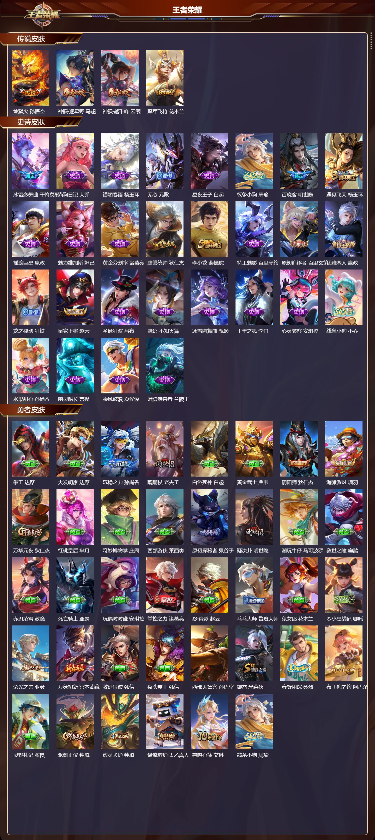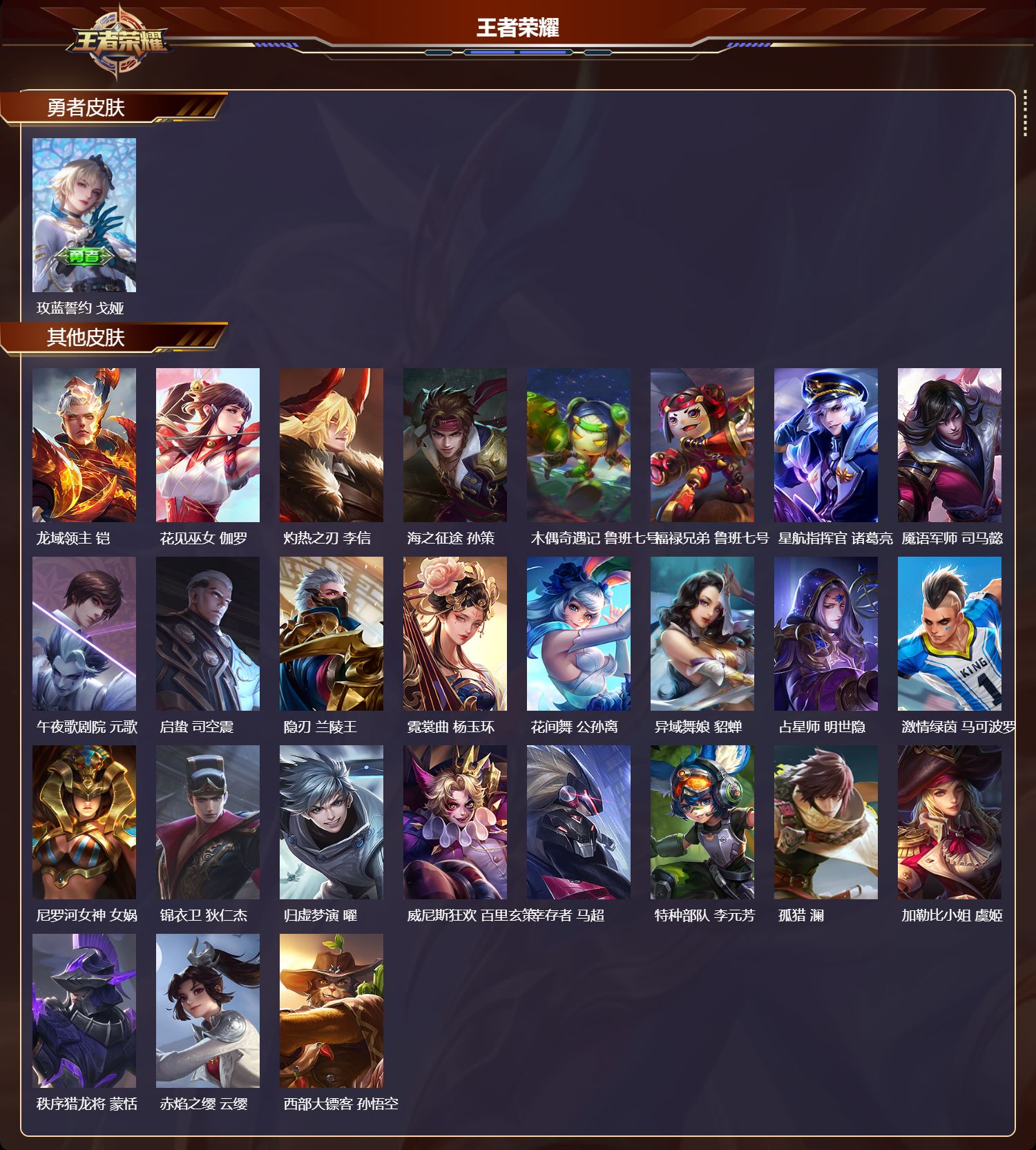 【27,其他皮肤】龙域领主,铠,花见巫女,伽罗,灼热之刃,李信,海之征途,孙策,木偶奇遇记,鲁班七号,福禄兄弟,鲁班七号,星航指挥官,诸葛亮,魇语军师,司马懿,午夜歌剧院,元歌,启蛰,司空震,隐刃,兰陵王,霓裳曲,杨玉环,花间舞,公孙离,异域舞娘,貂蝉,占星师,明世隐,激情绿茵,马可波罗,尼罗河女神,女娲,锦衣卫,狄仁杰,归虚梦演,曜,威尼斯狂欢,百里玄策,幸存者,马超,特种部队,李元芳,孤猎,澜,加勒比小姐,虞姬,秩序猎龙将,蒙恬,赤焰之缨,云缨,西部大镖客,孙悟空,