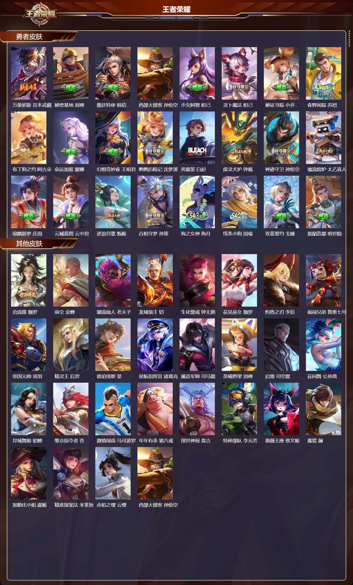 【59,勇者皮肤】时空谍影,海诺,爱心护理,阿轲,拳王,达摩,大发明家,达摩,铁甲之心,典韦,沉稳之力,孙尚香,黄金武士,典韦,阴阳师,狄仁杰,西部大镖客,牛魔,海滩派对,项羽,克喵,鬼谷子,踏浪烽翎,莱西奥,野性能量,吕布,哥特玫瑰,露娜,无双福将,程咬金,百相守梦,影,阿尔法小队,后羿,潮玩牛仔,马可波罗,救世之瞳,扁鹊,赤刃凌霄,敖隐,死亡骑士,亚瑟,掌控之力,诸葛亮,海滩丽影,钟无艳,雪境奇遇,西施,唤灵魔甲,刘禅,万事如意,刘备,苍云破阵,蒙恬,糖果风暴,安琪拉,逐霄之志,曹操,溯影追猎,虞姬,极光幻客,蚩奼,天使之翼,孙膑,兔女郎,花木兰,往忆晖光,明世隐,荣光之誓,亚瑟,万象初新,宫本武藏,秘密基地,刘禅,教廷特使,韩信,西部大镖客,孙悟空,少女阿狸,妲己,灵卜魔法,妲己,秘证寻踪,小乔,春野闲踪,苏烈,布丁狗之约,阿古朵,命运加冕,露娜,幻想奇妙夜,王昭君,鸭鸭历险记,沈梦溪,死霸装,白起,虚灵犬护,钟馗,神迹守卫,孙悟空,谧流熔炉,太乙真人,锦麟游梦,庄周,云械蓝图,云中君,逆浪荇歌,甄姬,百相守梦,孙策,海之女神,海月,线条小狗,周瑜,玫蓝誓约,戈娅,景韶洛都,明世隐,