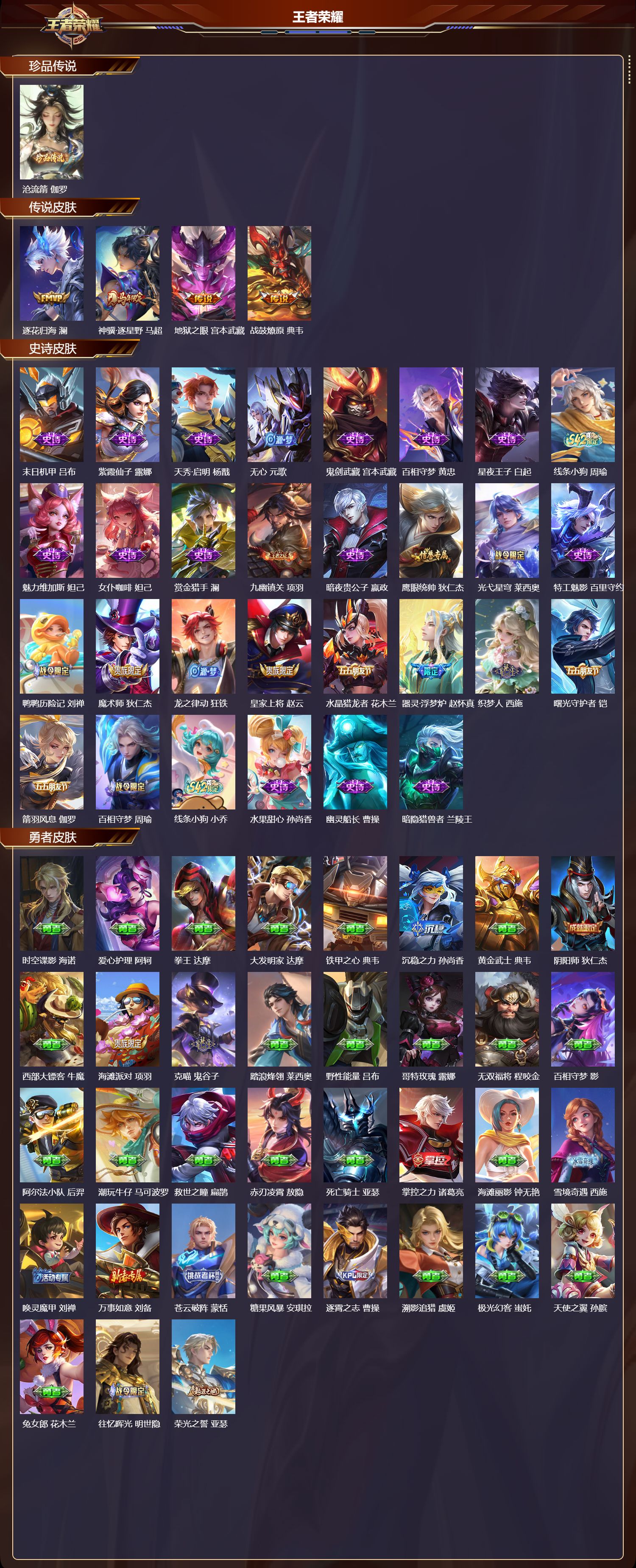 【30,史诗皮肤】末日机甲,吕布,紫霞仙子,露娜,天秀·启明,杨戬,无心,元歌,鬼剑武藏,宫本武藏,百相守梦,黄忠,星夜王子,白起,线条小狗,周瑜,魅力维加斯,妲己,女仆咖啡,妲己,赏金猎手,澜,九幽镇关,项羽,暗夜贵公子,嬴政,鹰眼统帅,狄仁杰,光弋星穹,莱西奥,特工魅影,百里守约,鸭鸭历险记,刘禅,魔术师,狄仁杰,龙之律动,狂铁,皇家上将,赵云,水晶猎龙者,花木兰,器灵·浮梦炉,赵怀真,织梦人,西施,曙光守护者,铠,箭羽风息,伽罗,百相守梦,周瑜,线条小狗,小乔,水果甜心,孙尚香,幽灵船长,曹操,暗隐猎兽者,兰陵王,