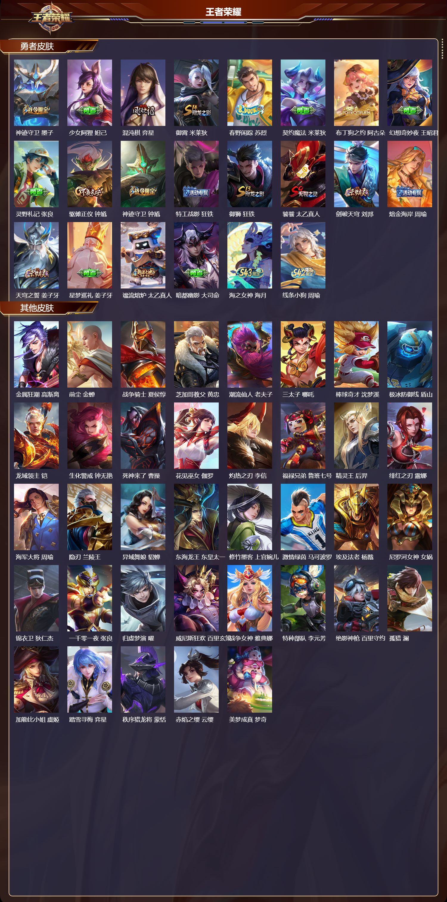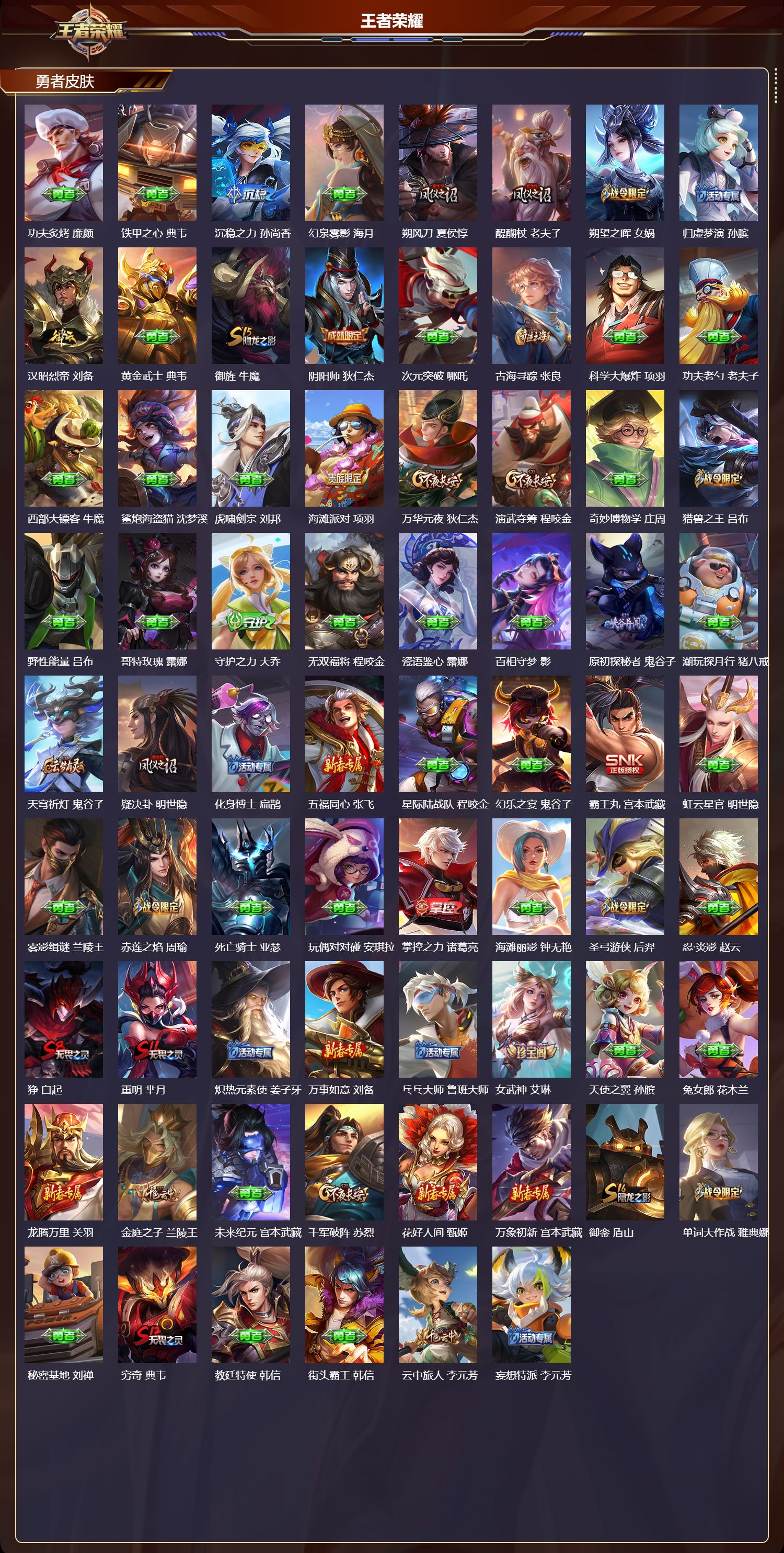 【102,勇者皮肤】圆桌骑士,盾山,烛龙,曹操,星际陆战队,达摩,沙漠行僧,达摩,大漠名商,沈梦溪,暖冬絮语,程咬金,缤纷绘卷,张良,纽约教父,刘备,大发明家,达摩,丁香结,小乔,功夫炙烤,廉颇,铁甲之心,典韦,沉稳之力,孙尚香,幻泉雾影,海月,朔风刀,夏侯惇,醍醐杖,老夫子,朔望之晖,女娲,归虚梦演,孙膑,汉昭烈帝,刘备,黄金武士,典韦,御旌,牛魔,阴阳师,狄仁杰,次元突破,哪吒,古海寻踪,张良,科学大爆炸,项羽,功夫老勺,老夫子,西部大镖客,牛魔,鲨炮海盗猫,沈梦溪,虎啸剑宗,刘邦,海滩派对,项羽,万华元夜,狄仁杰,演武夺筹,程咬金,奇妙博物学,庄周,猎兽之王,吕布,野性能量,吕布,哥特玫瑰,露娜,守护之力,大乔,无双福将,程咬金,瓷语鉴心,露娜,百相守梦,影,原初探秘者,鬼谷子,潮玩探月行,猪八戒,天穹祈灯,鬼谷子,疑决卦,明世隐,化身博士,扁鹊,五福同心,张飞,星际陆战队,程咬金,幻乐之宴,鬼谷子,霸王丸,宫本武藏,虹云星官,明世隐,雾影缉谜,兰陵王,赤莲之焰,周瑜,死亡骑士,亚瑟,玩偶对对碰,安琪拉,掌控之力,诸葛亮,海滩丽影,钟无艳,圣弓游侠,后羿,忍·炎影,赵云,狰,白起,重明,芈月,炽热元素使,姜子牙,万事如意,刘备,乓乓大师,鲁班大师,女武神,艾琳,天使之翼,孙膑,兔女郎,花木兰,龙腾万里,关羽,金庭之子,兰陵王,未来纪元,宫本武藏,千军破阵,苏烈,花好人间,甄姬,万象初新,宫本武藏,御銮,盾山,单词大作战,雅典娜,秘密基地,刘禅,穷奇,典韦,教廷特使,韩信,街头霸王,韩信,云中旅人,李元芳,妄想特派,李元芳,神迹守卫,墨子,少女阿狸,妲己,混沌棋,弈星,御霄,米莱狄,春野闲踪,苏烈,契约魔法,米莱狄,布丁狗之约,阿古朵,幻想奇妙夜,王昭君,灵野札记,张良,驱傩正仪,钟馗,神迹守卫,钟馗,特工战影,狂铁,御狮,狂铁,饕餮,太乙真人,剑破天穹,刘邦,熔金海岸,周瑜,天穹之誓,姜子牙,星梦巡礼,姜子牙,谧流熔炉,太乙真人,暗都幽影,大司命,海之女神,海月,线条小狗,周瑜,