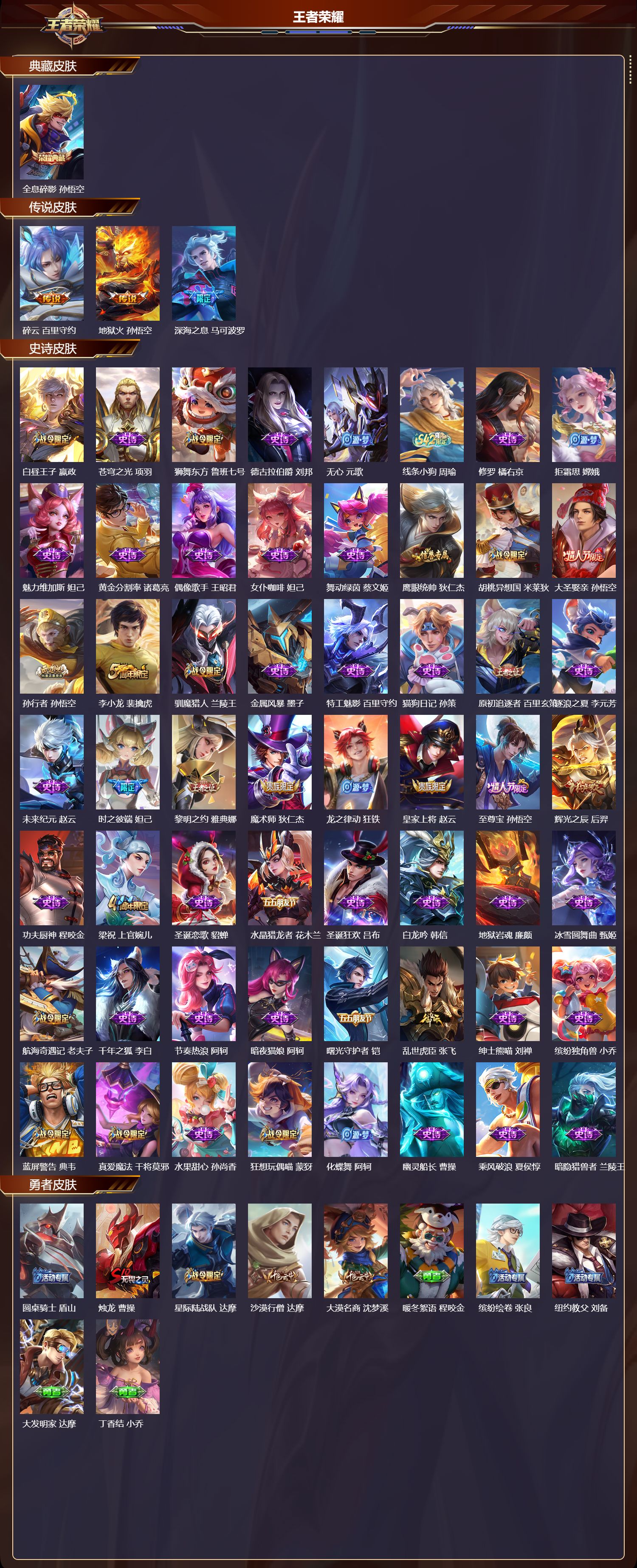 【56,史诗皮肤】白昼王子,嬴政,苍穹之光,项羽,狮舞东方,鲁班七号,德古拉伯爵,刘邦,无心,元歌,线条小狗,周瑜,修罗,橘右京,拒霜思,嫦娥,魅力维加斯,妲己,黄金分割率,诸葛亮,偶像歌手,王昭君,女仆咖啡,妲己,舞动绿茵,蔡文姬,鹰眼统帅,狄仁杰,胡桃异想国,米莱狄,大圣娶亲,孙悟空,孙行者,孙悟空,李小龙,裴擒虎,驯魔猎人,兰陵王,金属风暴,墨子,特工魅影,百里守约,猫狗日记,孙策,原初追逐者,百里玄策,逐浪之夏,李元芳,未来纪元,赵云,时之彼端,妲己,黎明之约,雅典娜,魔术师,狄仁杰,龙之律动,狂铁,皇家上将,赵云,至尊宝,孙悟空,辉光之辰,后羿,功夫厨神,程咬金,梁祝,上官婉儿,圣诞恋歌,貂蝉,水晶猎龙者,花木兰,圣诞狂欢,吕布,白龙吟,韩信,地狱岩魂,廉颇,冰雪圆舞曲,甄姬,航海奇遇记,老夫子,千年之狐,李白,节奏热浪,阿轲,暗夜猫娘,阿轲,曙光守护者,铠,乱世虎臣,张飞,绅士熊喵,刘禅,缤纷独角兽,小乔,蓝屏警告,典韦,真爱魔法,干将莫邪,水果甜心,孙尚香,狂想玩偶喵,蒙犽,化蝶舞,阿轲,幽灵船长,曹操,乘风破浪,夏侯惇,暗隐猎兽者,兰陵王,