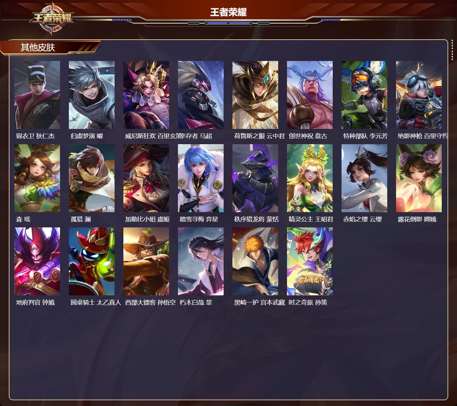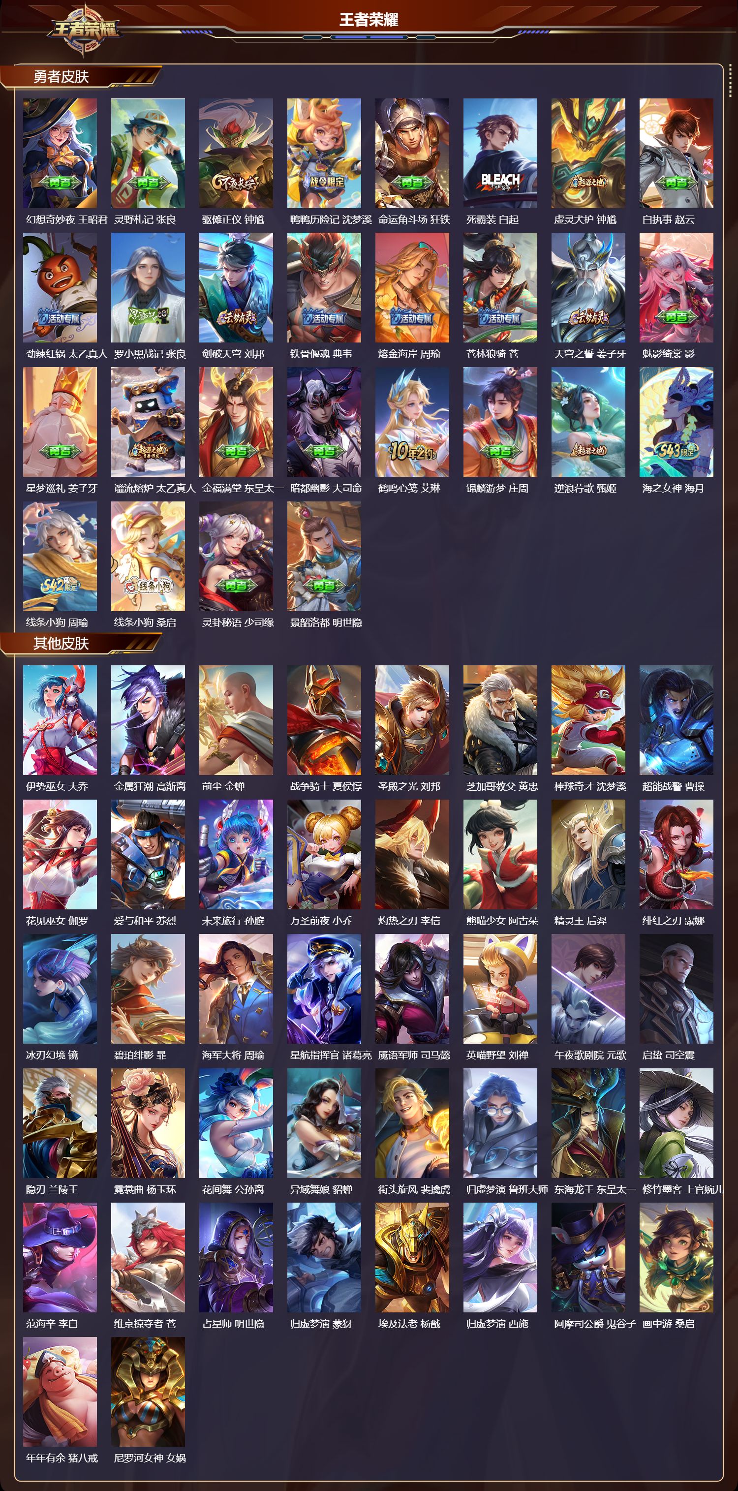 【64,其他皮肤】伊势巫女,大乔,金属狂潮,高渐离,前尘,金蝉,战争骑士,夏侯惇,圣殿之光,刘邦,芝加哥教父,黄忠,棒球奇才,沈梦溪,超能战警,曹操,花见巫女,伽罗,爱与和平,苏烈,未来旅行,孙膑,万圣前夜,小乔,灼热之刃,李信,熊喵少女,阿古朵,精灵王,后羿,绯红之刃,露娜,冰刃幻境,镜,碧珀绯影,暃,海军大将,周瑜,星航指挥官,诸葛亮,魇语军师,司马懿,英喵野望,刘禅,午夜歌剧院,元歌,启蛰,司空震,隐刃,兰陵王,霓裳曲,杨玉环,花间舞,公孙离,异域舞娘,貂蝉,街头旋风,裴擒虎,归虚梦演,鲁班大师,东海龙王,东皇太一,修竹墨客,上官婉儿,范海辛,李白,维京掠夺者,苍,占星师,明世隐,归虚梦演,蒙犽,埃及法老,杨戬,归虚梦演,西施,阿摩司公爵,鬼谷子,画中游,桑启,年年有余,猪八戒,尼罗河女神,女娲,锦衣卫,狄仁杰,归虚梦演,曜,威尼斯狂欢,百里玄策,幸存者,马超,荷鲁斯之眼,云中君,创世神祝,盘古,特种部队,李元芳,绝影神枪,百里守约,森,瑶,孤猎,澜,加勒比小姐,虞姬,踏雪寻梅,弈星,秩序猎龙将,蒙恬,精灵公主,王昭君,赤焰之缨,云缨,露花倒影,嫦娥,地府判官,钟馗,圆桌骑士,太乙真人,西部大镖客,孙悟空,朽木白哉,暃,黑崎一护,宫本武藏,时之奇旅,孙策,
