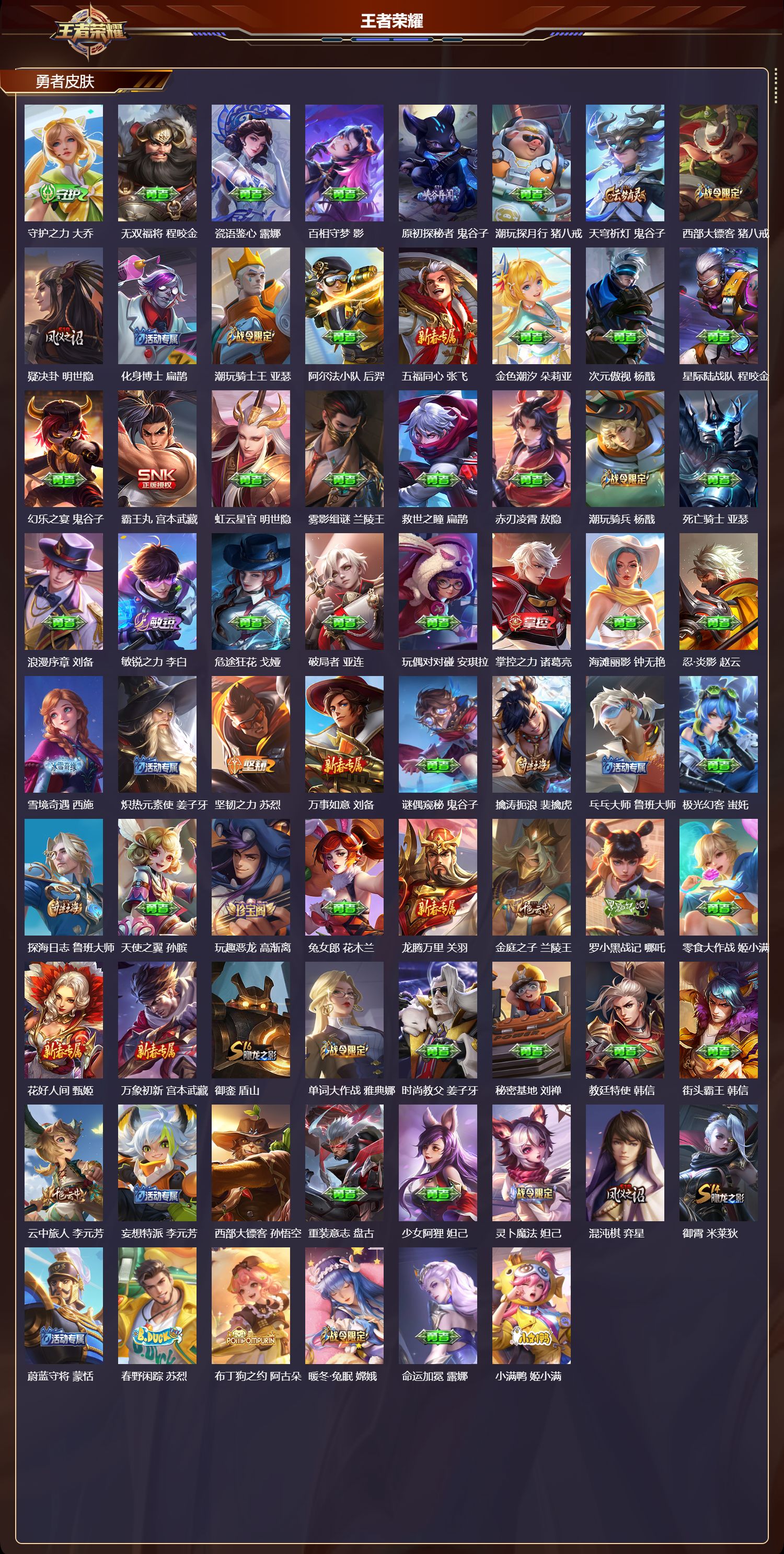 【141,勇者皮肤】时空谍影,海诺,玲珑珍味,西施,太极少年,赵怀真,星际陆战队,达摩,缤纷绘卷,张良,纽约教父,刘备,拳王,达摩,大发明家,达摩,乐园追猎者,白起,功夫炙烤,廉颇,沉稳之力,孙尚香,海盐诗旅,桑启,朔风刀,夏侯惇,醍醐杖,老夫子,归虚梦演,孙膑,汉昭烈帝,刘备,热血海滩,哪吒,白色死神,白起,黑桃队长,鲁班七号,黄金武士,典韦,御旌,牛魔,阴阳师,狄仁杰,径山谋武,孙权,次元突破,哪吒,古海寻踪,张良,科学大爆炸,项羽,戏梦巡演,空空儿,功夫老勺,老夫子,西部大镖客,牛魔,鲨炮海盗猫,沈梦溪,海滩派对,项羽,完美运算,后羿,万华元夜,狄仁杰,克喵,鬼谷子,制霸全明星,牛魔,踏浪烽翎,莱西奥,演武夺筹,程咬金,红桃皇后,芈月,奇妙博物学,庄周,西部游侠,莱西奥,猎兽之王,吕布,野性能量,吕布,哥特玫瑰,露娜,守护之力,大乔,无双福将,程咬金,瓷语鉴心,露娜,百相守梦,影,原初探秘者,鬼谷子,潮玩探月行,猪八戒,天穹祈灯,鬼谷子,西部大镖客,猪八戒,疑决卦,明世隐,化身博士,扁鹊,潮玩骑士王,亚瑟,阿尔法小队,后羿,五福同心,张飞,金色潮汐,朵莉亚,次元傲视,杨戬,星际陆战队,程咬金,幻乐之宴,鬼谷子,霸王丸,宫本武藏,虹云星官,明世隐,雾影缉谜,兰陵王,救世之瞳,扁鹊,赤刃凌霄,敖隐,潮玩骑兵,杨戬,死亡骑士,亚瑟,浪漫序章,刘备,敏锐之力,李白,危途狂花,戈娅,破局者,亚连,玩偶对对碰,安琪拉,掌控之力,诸葛亮,海滩丽影,钟无艳,忍·炎影,赵云,雪境奇遇,西施,炽热元素使,姜子牙,坚韧之力,苏烈,万事如意,刘备,谜偶窥秘,鬼谷子,擒涛扼浪,裴擒虎,乓乓大师,鲁班大师,极光幻客,蚩奼,探海日志,鲁班大师,天使之翼,孙膑,玩趣恶龙,高渐离,兔女郎,花木兰,龙腾万里,关羽,金庭之子,兰陵王,罗小黑战记,哪吒,零食大作战,姬小满,花好人间,甄姬,万象初新,宫本武藏,御銮,盾山,单词大作战,雅典娜,时尚教父,姜子牙,秘密基地,刘禅,教廷特使,韩信,街头霸王,韩信,云中旅人,李元芳,妄想特派,李元芳,西部大镖客,孙悟空,重装意志,盘古,少女阿狸,妲己,灵卜魔法,妲己,混沌棋,弈星,御霄,米莱狄,蔚蓝守将,蒙恬,春野闲踪,苏烈,布丁狗之约,阿古朵,暖冬·兔眠,嫦娥,命运加冕,露娜,小满鸭,姬小满,幻想奇妙夜,王昭君,灵野札记,张良,驱傩正仪,钟馗,鸭鸭历险记,沈梦溪,命运角斗场,狂铁,死霸装,白起,虚灵犬护,钟馗,白执事,赵云,劲辣红锅,太乙真人,罗小黑战记,张良,剑破天穹,刘邦,铁骨偃魂,典韦,熔金海岸,周瑜,苍林狼骑,苍,天穹之誓,姜子牙,魅影绮裳,影,星梦巡礼,姜子牙,谧流熔炉,太乙真人,金福满堂,东皇太一,暗都幽影,大司命,鹤鸣心笺,艾琳,锦麟游梦,庄周,逆浪荇歌,甄姬,海之女神,海月,线条小狗,周瑜,线条小狗,桑启,灵卦秘语,少司缘,景韶洛都,明世隐,