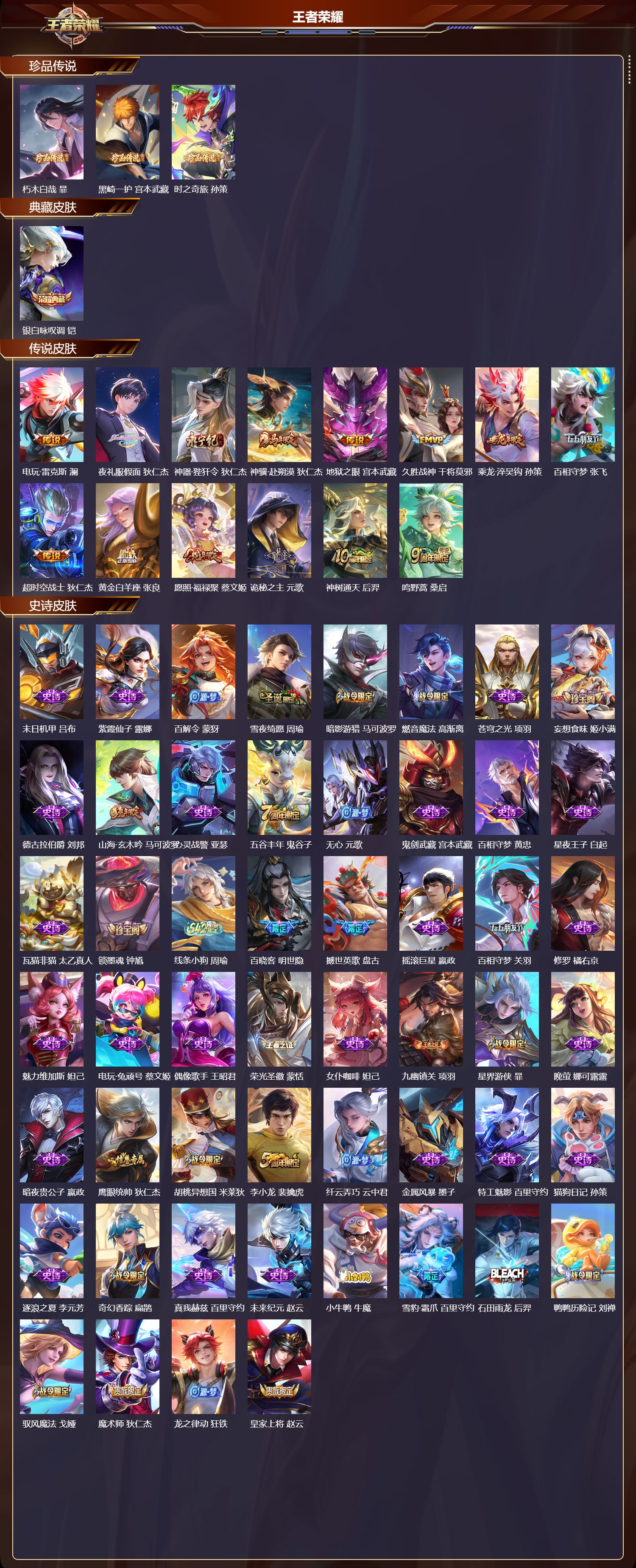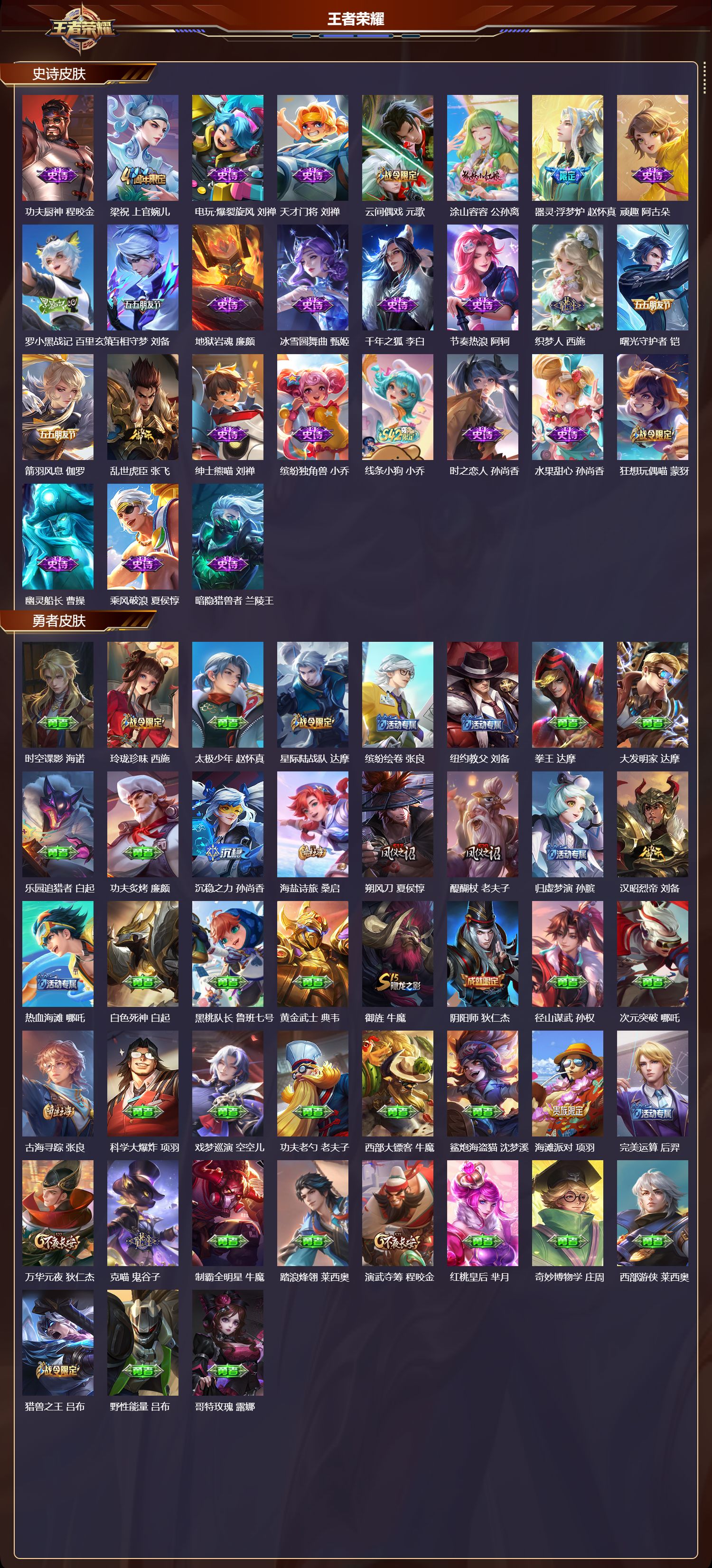 【79,史诗皮肤】末日机甲,吕布,紫霞仙子,露娜,百解令,蒙犽,雪夜绮愿,周瑜,暗影游猎,马可波罗,燃音魔法,高渐离,苍穹之光,项羽,妄想食味,姬小满,德古拉伯爵,刘邦,山海·玄木吟,马可波罗,心灵战警,亚瑟,五谷丰年,鬼谷子,无心,元歌,鬼剑武藏,宫本武藏,百相守梦,黄忠,星夜王子,白起,瓦猫非猫,太乙真人,锁墨魂,钟馗,线条小狗,周瑜,百晓客,明世隐,撼世英歌,盘古,摇滚巨星,嬴政,百相守梦,关羽,修罗,橘右京,魅力维加斯,妲己,电玩·兔顽号,蔡文姬,偶像歌手,王昭君,荣光圣徽,蒙恬,女仆咖啡,妲己,九幽镇关,项羽,星界游侠,暃,晚萤,娜可露露,暗夜贵公子,嬴政,鹰眼统帅,狄仁杰,胡桃异想国,米莱狄,李小龙,裴擒虎,纤云弄巧,云中君,金属风暴,墨子,特工魅影,百里守约,猫狗日记,孙策,逐浪之夏,李元芳,奇幻香踪,扁鹊,真我赫兹,百里守约,未来纪元,赵云,小牛鸭,牛魔,雪豹·霜爪,百里守约,石田雨龙,后羿,鸭鸭历险记,刘禅,驭风魔法,戈娅,魔术师,狄仁杰,龙之律动,狂铁,皇家上将,赵云,功夫厨神,程咬金,梁祝,上官婉儿,电玩·爆裂旋风,刘禅,天才门将,刘禅,云间偶戏,元歌,涂山容容,公孙离,器灵·浮梦炉,赵怀真,顽趣,阿古朵,罗小黑战记,百里玄策,百相守梦,刘备,地狱岩魂,廉颇,冰雪圆舞曲,甄姬,千年之狐,李白,节奏热浪,阿轲,织梦人,西施,曙光守护者,铠,箭羽风息,伽罗,乱世虎臣,张飞,绅士熊喵,刘禅,缤纷独角兽,小乔,线条小狗,小乔,时之恋人,孙尚香,水果甜心,孙尚香,狂想玩偶喵,蒙犽,幽灵船长,曹操,乘风破浪,夏侯惇,暗隐猎兽者,兰陵王,