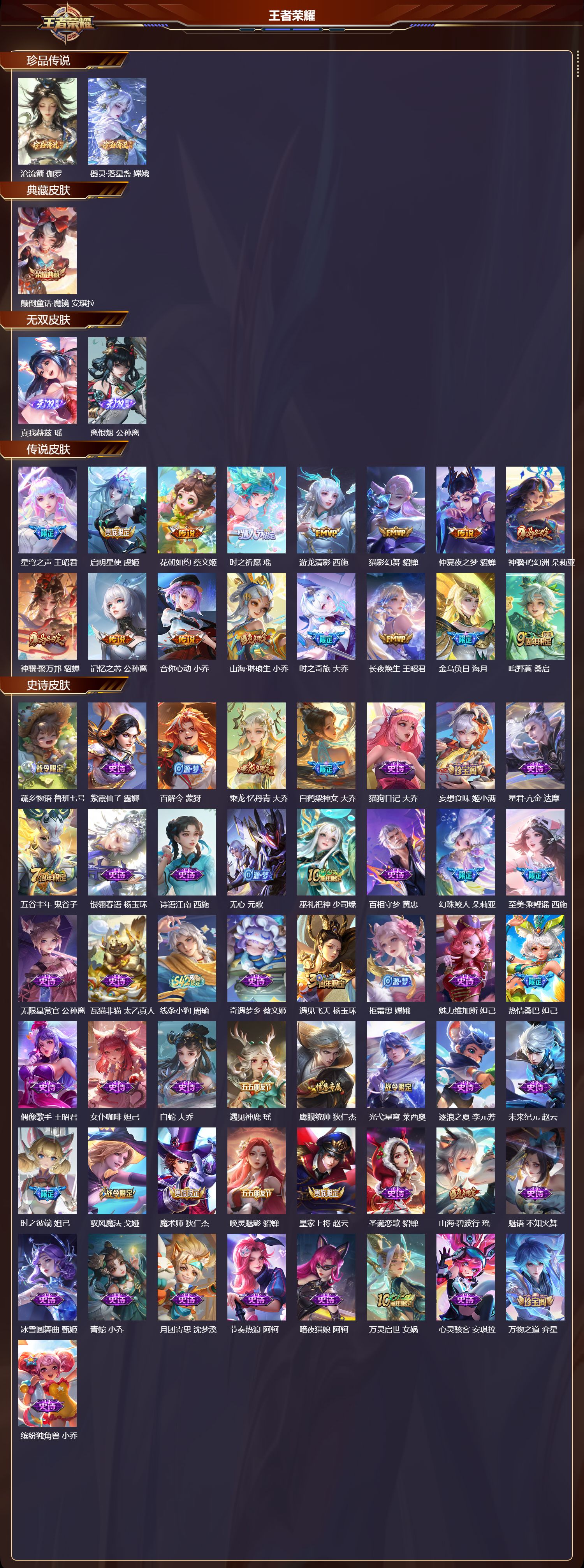 【53,史诗皮肤】蔬乡物语,鲁班七号,紫霞仙子,露娜,百解令,蒙犽,乘龙·忆丹青,大乔,白鹤梁神女,大乔,猫狗日记,大乔,妄想食味,姬小满,星君·亢金,达摩,五谷丰年,鬼谷子,银翎春语,杨玉环,诗语江南,西施,无心,元歌,巫礼祀神,少司缘,百相守梦,黄忠,幻珠鲛人,朵莉亚,至美·乘鲤谣,西施,无限星赏官,公孙离,瓦猫非猫,太乙真人,线条小狗,周瑜,奇遇梦乡,蔡文姬,遇见飞天,杨玉环,拒霜思,嫦娥,魅力维加斯,妲己,热情桑巴,妲己,偶像歌手,王昭君,女仆咖啡,妲己,白蛇,大乔,遇见神鹿,瑶,鹰眼统帅,狄仁杰,光弋星穹,莱西奥,逐浪之夏,李元芳,未来纪元,赵云,时之彼端,妲己,驭风魔法,戈娅,魔术师,狄仁杰,唤灵魅影,貂蝉,皇家上将,赵云,圣诞恋歌,貂蝉,山海·碧波行,瑶,魅语,不知火舞,冰雪圆舞曲,甄姬,青蛇,小乔,月团寄思,沈梦溪,节奏热浪,阿轲,暗夜猫娘,阿轲,万灵启世,女娲,心灵骇客,安琪拉,万物之道,弈星,缤纷独角兽,小乔,线条小狗,小乔,水果甜心,孙尚香,江河有灵,阿古朵,幽灵船长,曹操,