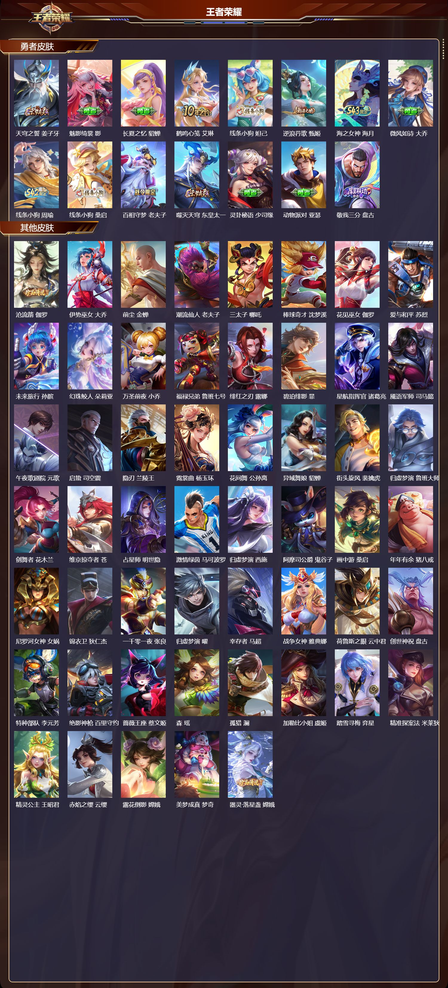 【53,其他皮肤】沧流箭,伽罗,伊势巫女,大乔,前尘,金蝉,潮流仙人,老夫子,三太子,哪吒,棒球奇才,沈梦溪,花见巫女,伽罗,爱与和平,苏烈,未来旅行,孙膑,幻珠鲛人,朵莉亚,万圣前夜,小乔,福禄兄弟,鲁班七号,绯红之刃,露娜,碧珀绯影,暃,星航指挥官,诸葛亮,魇语军师,司马懿,午夜歌剧院,元歌,启蛰,司空震,隐刃,兰陵王,霓裳曲,杨玉环,花间舞,公孙离,异域舞娘,貂蝉,街头旋风,裴擒虎,归虚梦演,鲁班大师,剑舞者,花木兰,维京掠夺者,苍,占星师,明世隐,激情绿茵,马可波罗,归虚梦演,西施,阿摩司公爵,鬼谷子,画中游,桑启,年年有余,猪八戒,尼罗河女神,女娲,锦衣卫,狄仁杰,一千零一夜,张良,归虚梦演,曜,幸存者,马超,战争女神,雅典娜,荷鲁斯之眼,云中君,创世神祝,盘古,特种部队,李元芳,绝影神枪,百里守约,蔷薇王座,蔡文姬,森,瑶,孤猎,澜,加勒比小姐,虞姬,踏雪寻梅,弈星,精准探案法,米莱狄,精灵公主,王昭君,赤焰之缨,云缨,露花倒影,嫦娥,美梦成真,梦奇,器灵·落星盏,嫦娥,