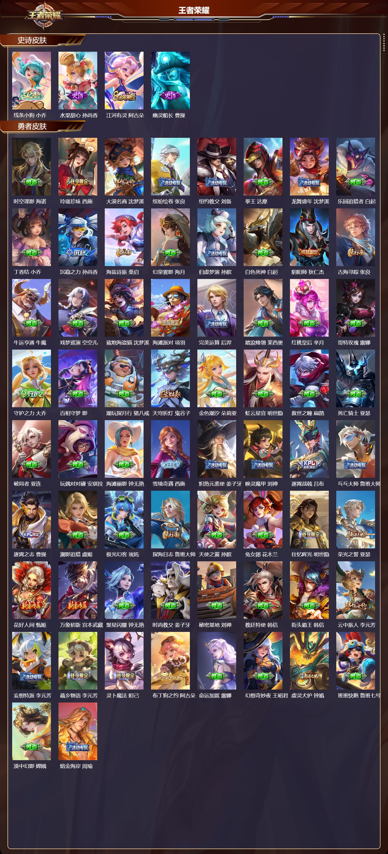 【81,勇者皮肤】时空谍影,海诺,玲珑珍味,西施,大漠名商,沈梦溪,缤纷绘卷,张良,纽约教父,刘备,拳王,达摩,龙舞盛年,沈梦溪,乐园追猎者,白起,丁香结,小乔,沉稳之力,孙尚香,海盐诗旅,桑启,幻泉雾影,海月,归虚梦演,孙膑,白色死神,白起,阴阳师,狄仁杰,古海寻踪,张良,牛运亨通,牛魔,戏梦巡演,空空儿,鲨炮海盗猫,沈梦溪,海滩派对,项羽,完美运算,后羿,踏浪烽翎,莱西奥,红桃皇后,芈月,哥特玫瑰,露娜,守护之力,大乔,百相守梦,影,潮玩探月行,猪八戒,天穹祈灯,鬼谷子,金色潮汐,朵莉亚,虹云星官,明世隐,救世之瞳,扁鹊,死亡骑士,亚瑟,破局者,亚连,玩偶对对碰,安琪拉,海滩丽影,钟无艳,雪境奇遇,西施,炽热元素使,姜子牙,唤灵魔甲,刘禅,逐霄战戟,吕布,乓乓大师,鲁班大师,逐霄之志,曹操,溯影追猎,虞姬,极光幻客,蚩奼,探海日志,鲁班大师,天使之翼,孙膑,兔女郎,花木兰,往忆晖光,明世隐,荣光之誓,亚瑟,花好人间,甄姬,万象初新,宫本武藏,聚星闪耀,钟无艳,时尚教父,姜子牙,秘密基地,刘禅,教廷特使,韩信,街头霸王,韩信,云中旅人,李元芳,妄想特派,李元芳,蔬乡物语,李元芳,灵卜魔法,妲己,布丁狗之约,阿古朵,命运加冕,露娜,幻想奇妙夜,王昭君,虚灵犬护,钟馗,班班快跑,鲁班七号,漠中幻影,嫦娥,熔金海岸,周瑜,天穹之誓,姜子牙,魅影绮裳,影,长夏之忆,貂蝉,鹤鸣心笺,艾琳,线条小狗,妲己,逆浪荇歌,甄姬,海之女神,海月,微风如诗,大乔,线条小狗,周瑜,线条小狗,桑启,百相守梦,老夫子,噬灭天穹,东皇太一,灵卦秘语,少司缘,动物派对,亚瑟,敬我三分,盘古,