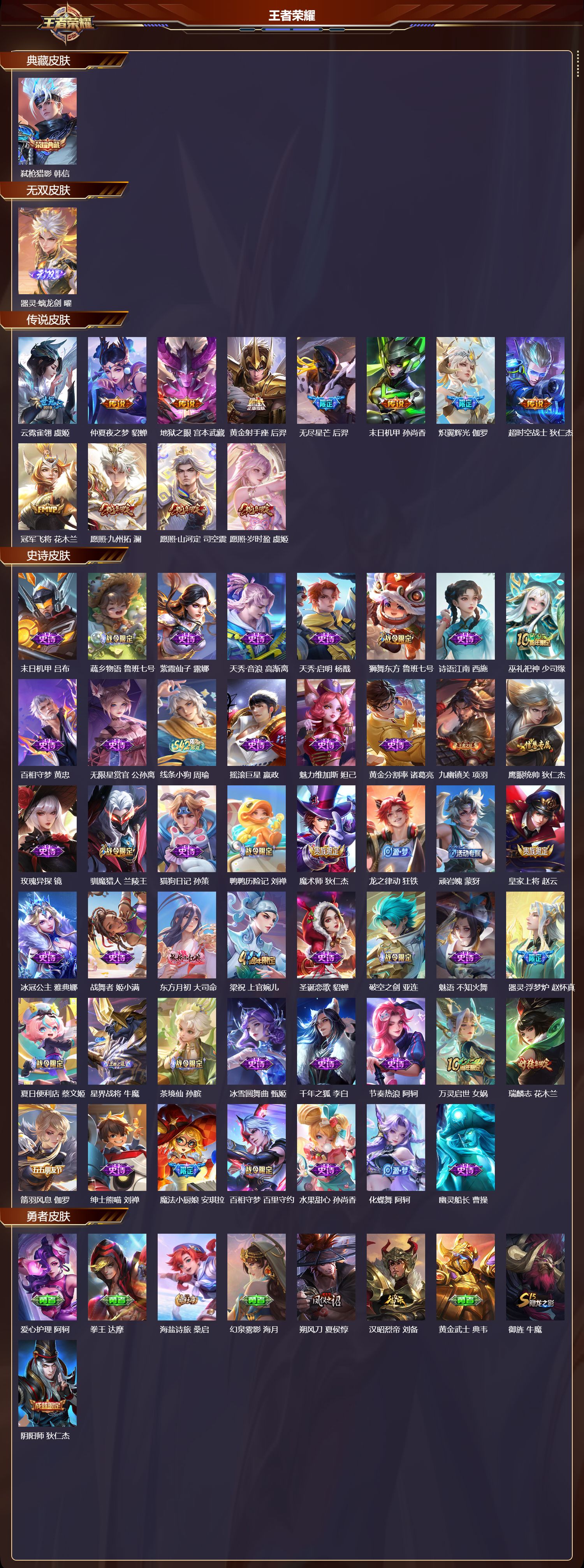 【47,史诗皮肤】末日机甲,吕布,蔬乡物语,鲁班七号,紫霞仙子,露娜,天秀·音浪,高渐离,天秀·启明,杨戬,狮舞东方,鲁班七号,诗语江南,西施,巫礼祀神,少司缘,百相守梦,黄忠,无限星赏官,公孙离,线条小狗,周瑜,摇滚巨星,嬴政,魅力维加斯,妲己,黄金分割率,诸葛亮,九幽镇关,项羽,鹰眼统帅,狄仁杰,玫瑰异探,镜,驯魔猎人,兰陵王,猫狗日记,孙策,鸭鸭历险记,刘禅,魔术师,狄仁杰,龙之律动,狂铁,顽岩魄,蒙犽,皇家上将,赵云,冰冠公主,雅典娜,战舞者,姬小满,东方月初,大司命,梁祝,上官婉儿,圣诞恋歌,貂蝉,破空之剑,亚连,魅语,不知火舞,器灵·浮梦炉,赵怀真,夏日便利店,蔡文姬,星界战将,牛魔,茶境仙,孙膑,冰雪圆舞曲,甄姬,千年之狐,李白,节奏热浪,阿轲,万灵启世,女娲,瑞麟志,花木兰,箭羽风息,伽罗,绅士熊喵,刘禅,魔法小厨娘,安琪拉,百相守梦,百里守约,水果甜心,孙尚香,化蝶舞,阿轲,幽灵船长,曹操,