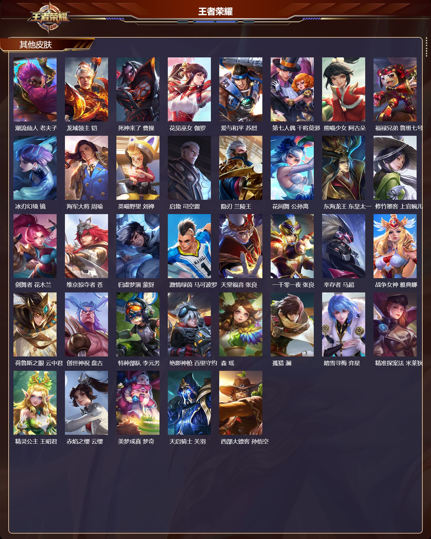 【39,其他皮肤】前尘,金蝉,战争骑士,夏侯惇,潮流仙人,老夫子,龙域领主,铠,死神来了,曹操,花见巫女,伽罗,爱与和平,苏烈,第七人偶,干将莫邪,熊喵少女,阿古朵,福禄兄弟,鲁班七号,冰刃幻境,镜,海军大将,周瑜,英喵野望,刘禅,启蛰,司空震,隐刃,兰陵王,花间舞,公孙离,东海龙王,东皇太一,修竹墨客,上官婉儿,剑舞者,花木兰,维京掠夺者,苍,归虚梦演,蒙犽,激情绿茵,马可波罗,天堂福音,张良,一千零一夜,张良,幸存者,马超,战争女神,雅典娜,荷鲁斯之眼,云中君,创世神祝,盘古,特种部队,李元芳,绝影神枪,百里守约,森,瑶,孤猎,澜,踏雪寻梅,弈星,精准探案法,米莱狄,精灵公主,王昭君,赤焰之缨,云缨,美梦成真,梦奇,天启骑士,关羽,西部大镖客,孙悟空,