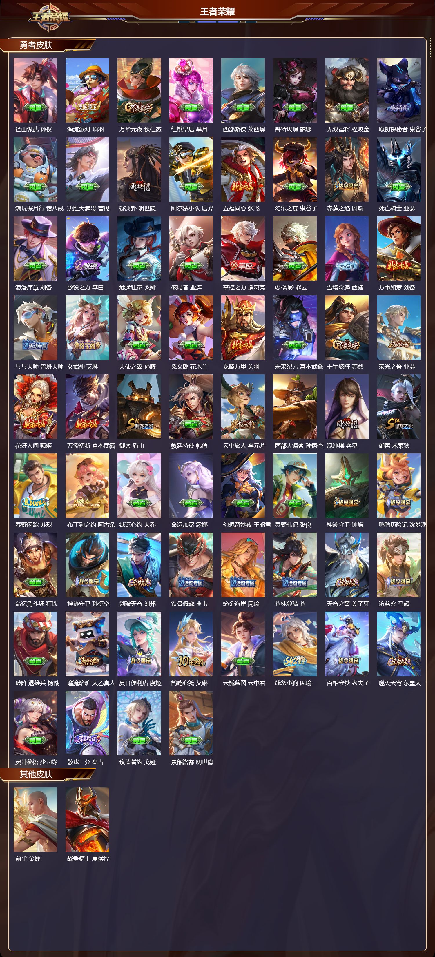 【77,勇者皮肤】爱心护理,阿轲,拳王,达摩,海盐诗旅,桑启,幻泉雾影,海月,朔风刀,夏侯惇,汉昭烈帝,刘备,黄金武士,典韦,御旌,牛魔,阴阳师,狄仁杰,径山谋武,孙权,海滩派对,项羽,万华元夜,狄仁杰,红桃皇后,芈月,西部游侠,莱西奥,哥特玫瑰,露娜,无双福将,程咬金,原初探秘者,鬼谷子,潮玩探月行,猪八戒,决胜大满贯,曹操,疑决卦,明世隐,阿尔法小队,后羿,五福同心,张飞,幻乐之宴,鬼谷子,赤莲之焰,周瑜,死亡骑士,亚瑟,浪漫序章,刘备,敏锐之力,李白,危途狂花,戈娅,破局者,亚连,掌控之力,诸葛亮,忍·炎影,赵云,雪境奇遇,西施,万事如意,刘备,乓乓大师,鲁班大师,女武神,艾琳,天使之翼,孙膑,兔女郎,花木兰,龙腾万里,关羽,未来纪元,宫本武藏,千军破阵,苏烈,荣光之誓,亚瑟,花好人间,甄姬,万象初新,宫本武藏,御銮,盾山,教廷特使,韩信,云中旅人,李元芳,西部大镖客,孙悟空,混沌棋,弈星,御霄,米莱狄,春野闲踪,苏烈,布丁狗之约,阿古朵,绒语心约,大乔,命运加冕,露娜,幻想奇妙夜,王昭君,灵野札记,张良,神迹守卫,钟馗,鸭鸭历险记,沈梦溪,命运角斗场,狂铁,神迹守卫,孙悟空,剑破天穹,刘邦,铁骨偃魂,典韦,熔金海岸,周瑜,苍林狼骑,苍,天穹之誓,姜子牙,访茗客,马超,破阵·退雄兵,杨戬,谧流熔炉,太乙真人,夏日便利店,虞姬,鹤鸣心笺,艾琳,云械蓝图,云中君,线条小狗,周瑜,百相守梦,老夫子,噬灭天穹,东皇太一,灵卦秘语,少司缘,敬我三分,盘古,玫蓝誓约,戈娅,景韶洛都,明世隐,