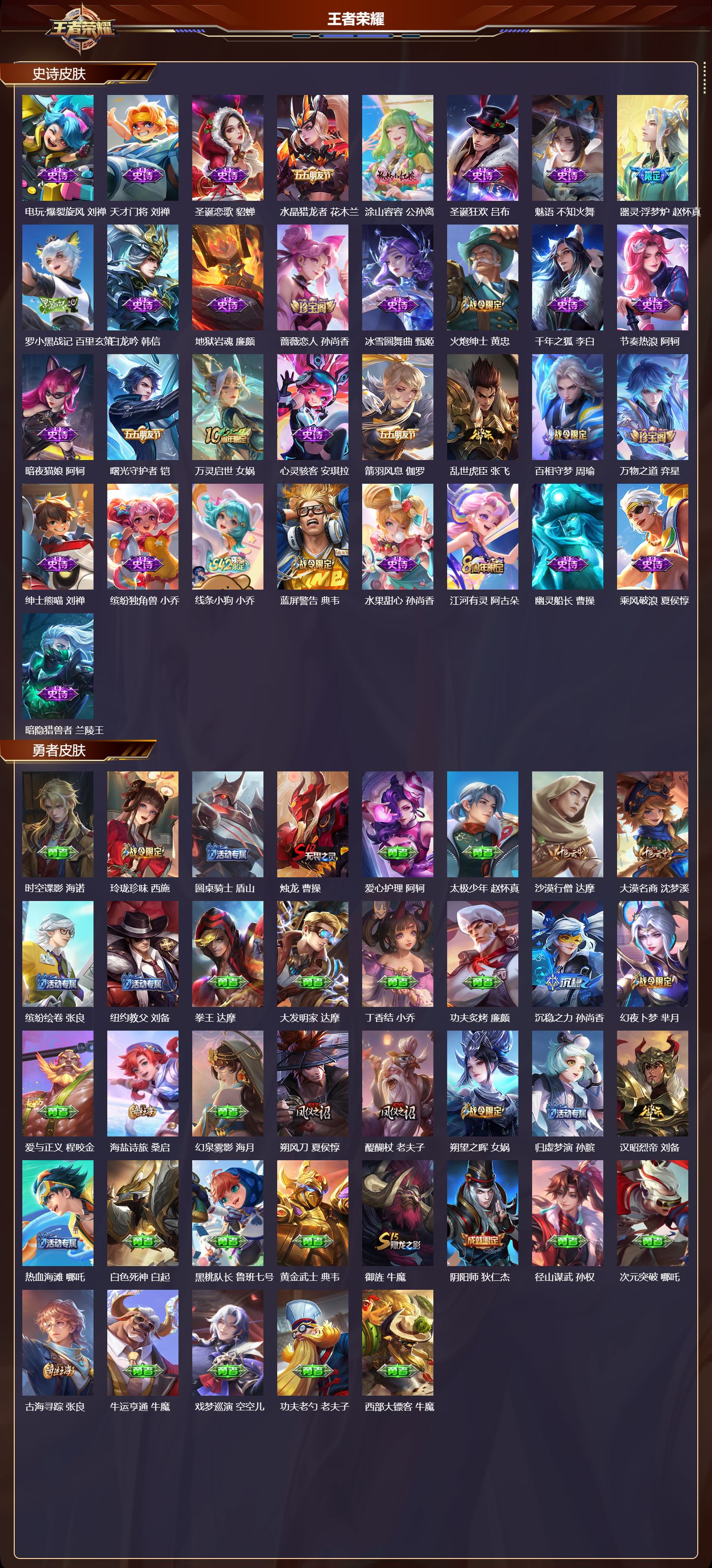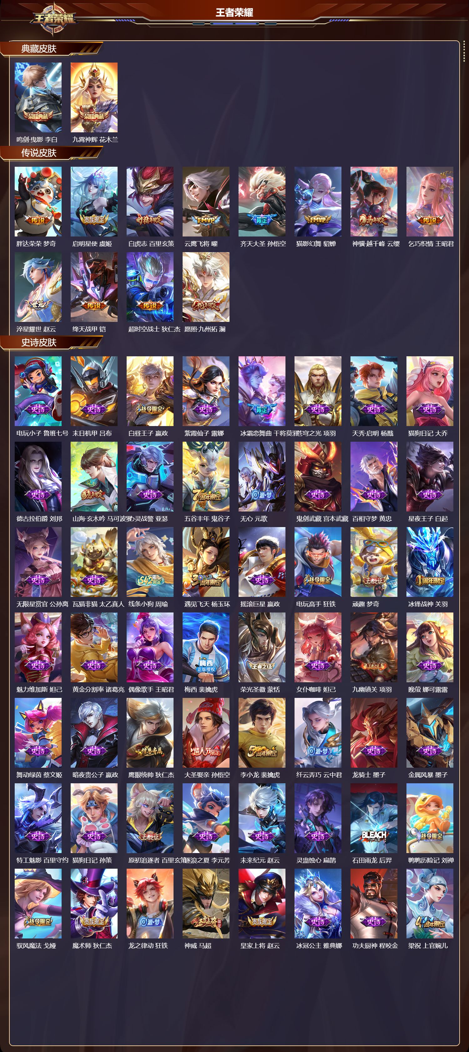 【89,史诗皮肤】电玩小子,鲁班七号,末日机甲,吕布,白昼王子,嬴政,紫霞仙子,露娜,冰霜恋舞曲,干将莫邪,苍穹之光,项羽,天秀·启明,杨戬,猫狗日记,大乔,德古拉伯爵,刘邦,山海·玄木吟,马可波罗,心灵战警,亚瑟,五谷丰年,鬼谷子,无心,元歌,鬼剑武藏,宫本武藏,百相守梦,黄忠,星夜王子,白起,无限星赏官,公孙离,瓦猫非猫,太乙真人,线条小狗,周瑜,遇见飞天,杨玉环,摇滚巨星,嬴政,电玩高手,狂铁,顽趣,梦奇,冰锋战神,关羽,魅力维加斯,妲己,黄金分割率,诸葛亮,偶像歌手,王昭君,梅西,裴擒虎,荣光圣徽,蒙恬,女仆咖啡,妲己,九幽镇关,项羽,晚萤,娜可露露,舞动绿茵,蔡文姬,暗夜贵公子,嬴政,鹰眼统帅,狄仁杰,大圣娶亲,孙悟空,李小龙,裴擒虎,纤云弄巧,云中君,龙骑士,墨子,金属风暴,墨子,特工魅影,百里守约,猫狗日记,孙策,原初追逐者,百里玄策,逐浪之夏,李元芳,未来纪元,赵云,灵蛊蚀心,扁鹊,石田雨龙,后羿,鸭鸭历险记,刘禅,驭风魔法,戈娅,魔术师,狄仁杰,龙之律动,狂铁,神威,马超,皇家上将,赵云,冰冠公主,雅典娜,功夫厨神,程咬金,梁祝,上官婉儿,电玩·爆裂旋风,刘禅,天才门将,刘禅,圣诞恋歌,貂蝉,水晶猎龙者,花木兰,涂山容容,公孙离,圣诞狂欢,吕布,魅语,不知火舞,器灵·浮梦炉,赵怀真,罗小黑战记,百里玄策,白龙吟,韩信,地狱岩魂,廉颇,蔷薇恋人,孙尚香,冰雪圆舞曲,甄姬,火炮绅士,黄忠,千年之狐,李白,节奏热浪,阿轲,暗夜猫娘,阿轲,曙光守护者,铠,万灵启世,女娲,心灵骇客,安琪拉,箭羽风息,伽罗,乱世虎臣,张飞,百相守梦,周瑜,万物之道,弈星,绅士熊喵,刘禅,缤纷独角兽,小乔,线条小狗,小乔,蓝屏警告,典韦,水果甜心,孙尚香,江河有灵,阿古朵,幽灵船长,曹操,乘风破浪,夏侯惇,暗隐猎兽者,兰陵王,