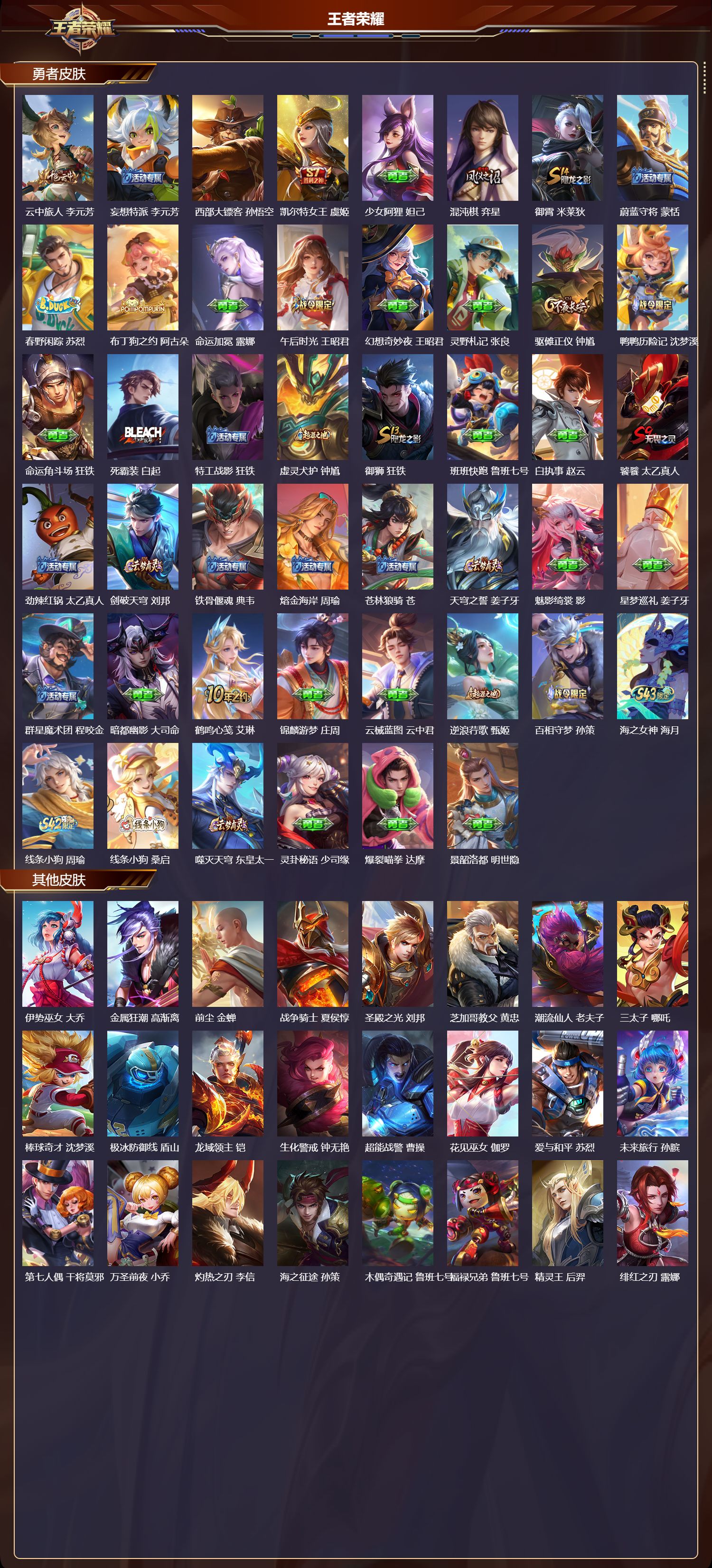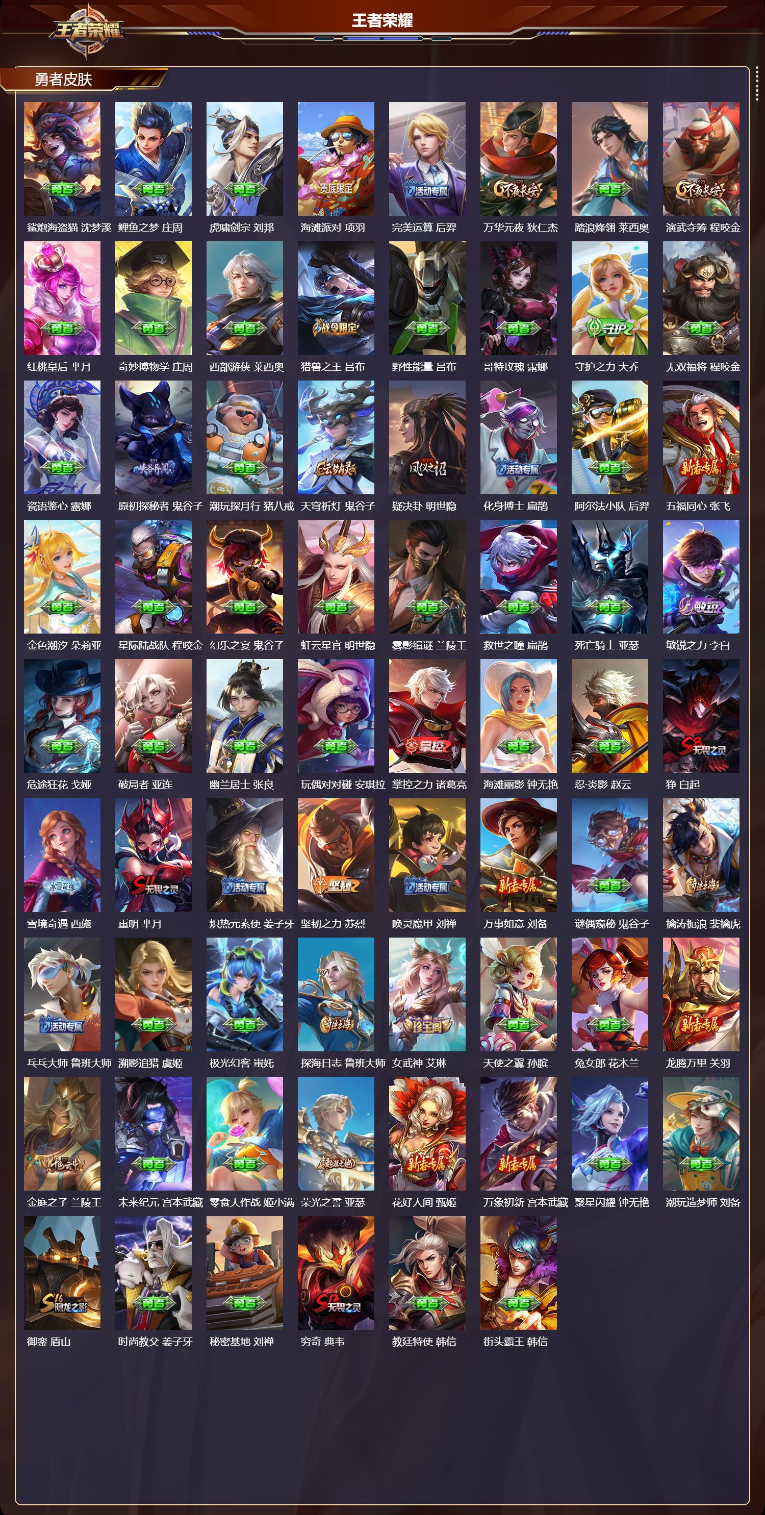 【153,勇者皮肤】时空谍影,海诺,玲珑珍味,西施,圆桌骑士,盾山,烛龙,曹操,爱心护理,阿轲,太极少年,赵怀真,沙漠行僧,达摩,大漠名商,沈梦溪,缤纷绘卷,张良,纽约教父,刘备,拳王,达摩,大发明家,达摩,丁香结,小乔,功夫炙烤,廉颇,沉稳之力,孙尚香,幻夜卜梦,芈月,爱与正义,程咬金,海盐诗旅,桑启,幻泉雾影,海月,朔风刀,夏侯惇,醍醐杖,老夫子,朔望之晖,女娲,归虚梦演,孙膑,汉昭烈帝,刘备,热血海滩,哪吒,白色死神,白起,黑桃队长,鲁班七号,黄金武士,典韦,御旌,牛魔,阴阳师,狄仁杰,径山谋武,孙权,次元突破,哪吒,古海寻踪,张良,牛运亨通,牛魔,戏梦巡演,空空儿,功夫老勺,老夫子,西部大镖客,牛魔,鲨炮海盗猫,沈梦溪,鲤鱼之梦,庄周,虎啸剑宗,刘邦,海滩派对,项羽,完美运算,后羿,万华元夜,狄仁杰,踏浪烽翎,莱西奥,演武夺筹,程咬金,红桃皇后,芈月,奇妙博物学,庄周,西部游侠,莱西奥,猎兽之王,吕布,野性能量,吕布,哥特玫瑰,露娜,守护之力,大乔,无双福将,程咬金,瓷语鉴心,露娜,原初探秘者,鬼谷子,潮玩探月行,猪八戒,天穹祈灯,鬼谷子,疑决卦,明世隐,化身博士,扁鹊,阿尔法小队,后羿,五福同心,张飞,金色潮汐,朵莉亚,星际陆战队,程咬金,幻乐之宴,鬼谷子,虹云星官,明世隐,雾影缉谜,兰陵王,救世之瞳,扁鹊,死亡骑士,亚瑟,敏锐之力,李白,危途狂花,戈娅,破局者,亚连,幽兰居士,张良,玩偶对对碰,安琪拉,掌控之力,诸葛亮,海滩丽影,钟无艳,忍·炎影,赵云,狰,白起,雪境奇遇,西施,重明,芈月,炽热元素使,姜子牙,坚韧之力,苏烈,唤灵魔甲,刘禅,万事如意,刘备,谜偶窥秘,鬼谷子,擒涛扼浪,裴擒虎,乓乓大师,鲁班大师,溯影追猎,虞姬,极光幻客,蚩奼,探海日志,鲁班大师,女武神,艾琳,天使之翼,孙膑,兔女郎,花木兰,龙腾万里,关羽,金庭之子,兰陵王,未来纪元,宫本武藏,零食大作战,姬小满,荣光之誓,亚瑟,花好人间,甄姬,万象初新,宫本武藏,聚星闪耀,钟无艳,潮玩造梦师,刘备,御銮,盾山,时尚教父,姜子牙,秘密基地,刘禅,穷奇,典韦,教廷特使,韩信,街头霸王,韩信,云中旅人,李元芳,妄想特派,李元芳,西部大镖客,孙悟空,凯尔特女王,虞姬,少女阿狸,妲己,混沌棋,弈星,御霄,米莱狄,蔚蓝守将,蒙恬,春野闲踪,苏烈,布丁狗之约,阿古朵,命运加冕,露娜,午后时光,王昭君,幻想奇妙夜,王昭君,灵野札记,张良,驱傩正仪,钟馗,鸭鸭历险记,沈梦溪,命运角斗场,狂铁,死霸装,白起,特工战影,狂铁,虚灵犬护,钟馗,御狮,狂铁,班班快跑,鲁班七号,白执事,赵云,饕餮,太乙真人,劲辣红锅,太乙真人,剑破天穹,刘邦,铁骨偃魂,典韦,熔金海岸,周瑜,苍林狼骑,苍,天穹之誓,姜子牙,魅影绮裳,影,星梦巡礼,姜子牙,群星魔术团,程咬金,暗都幽影,大司命,鹤鸣心笺,艾琳,锦麟游梦,庄周,云械蓝图,云中君,逆浪荇歌,甄姬,百相守梦,孙策,海之女神,海月,线条小狗,周瑜,线条小狗,桑启,噬灭天穹,东皇太一,灵卦秘语,少司缘,爆裂喵拳,达摩,景韶洛都,明世隐,