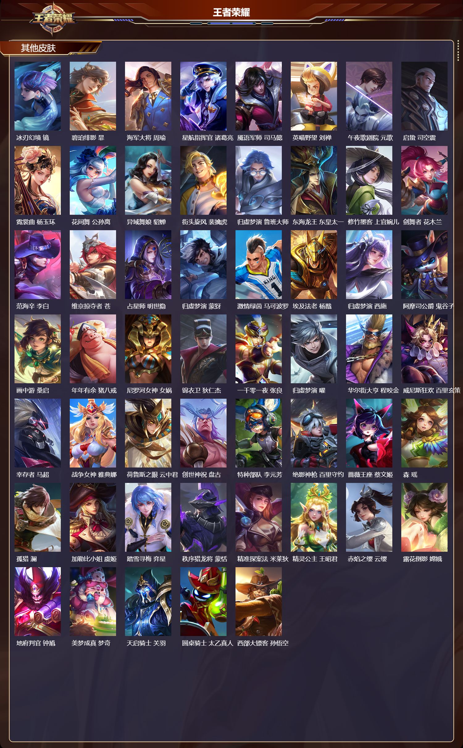 【77,其他皮肤】伊势巫女,大乔,金属狂潮,高渐离,前尘,金蝉,战争骑士,夏侯惇,圣殿之光,刘邦,芝加哥教父,黄忠,潮流仙人,老夫子,三太子,哪吒,棒球奇才,沈梦溪,极冰防御线,盾山,龙域领主,铠,生化警戒,钟无艳,超能战警,曹操,花见巫女,伽罗,爱与和平,苏烈,未来旅行,孙膑,第七人偶,干将莫邪,万圣前夜,小乔,灼热之刃,李信,海之征途,孙策,木偶奇遇记,鲁班七号,福禄兄弟,鲁班七号,精灵王,后羿,绯红之刃,露娜,冰刃幻境,镜,碧珀绯影,暃,海军大将,周瑜,星航指挥官,诸葛亮,魇语军师,司马懿,英喵野望,刘禅,午夜歌剧院,元歌,启蛰,司空震,霓裳曲,杨玉环,花间舞,公孙离,异域舞娘,貂蝉,街头旋风,裴擒虎,归虚梦演,鲁班大师,东海龙王,东皇太一,修竹墨客,上官婉儿,剑舞者,花木兰,范海辛,李白,维京掠夺者,苍,占星师,明世隐,归虚梦演,蒙犽,激情绿茵,马可波罗,埃及法老,杨戬,归虚梦演,西施,阿摩司公爵,鬼谷子,画中游,桑启,年年有余,猪八戒,尼罗河女神,女娲,锦衣卫,狄仁杰,一千零一夜,张良,归虚梦演,曜,华尔街大亨,程咬金,威尼斯狂欢,百里玄策,幸存者,马超,战争女神,雅典娜,荷鲁斯之眼,云中君,创世神祝,盘古,特种部队,李元芳,绝影神枪,百里守约,蔷薇王座,蔡文姬,森,瑶,孤猎,澜,加勒比小姐,虞姬,踏雪寻梅,弈星,秩序猎龙将,蒙恬,精准探案法,米莱狄,精灵公主,王昭君,赤焰之缨,云缨,露花倒影,嫦娥,地府判官,钟馗,美梦成真,梦奇,天启骑士,关羽,圆桌骑士,太乙真人,西部大镖客,孙悟空,