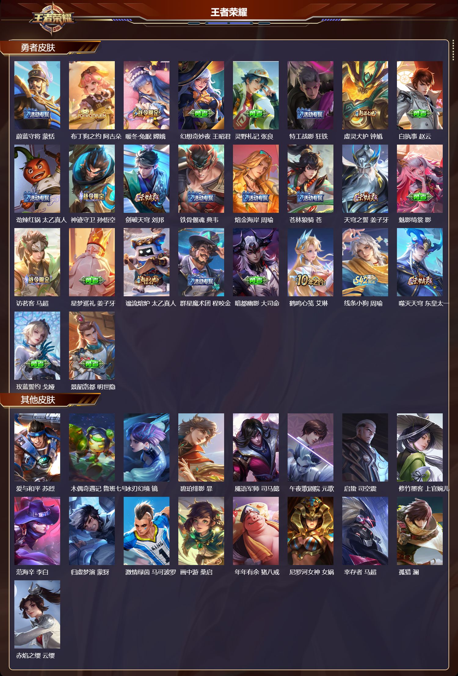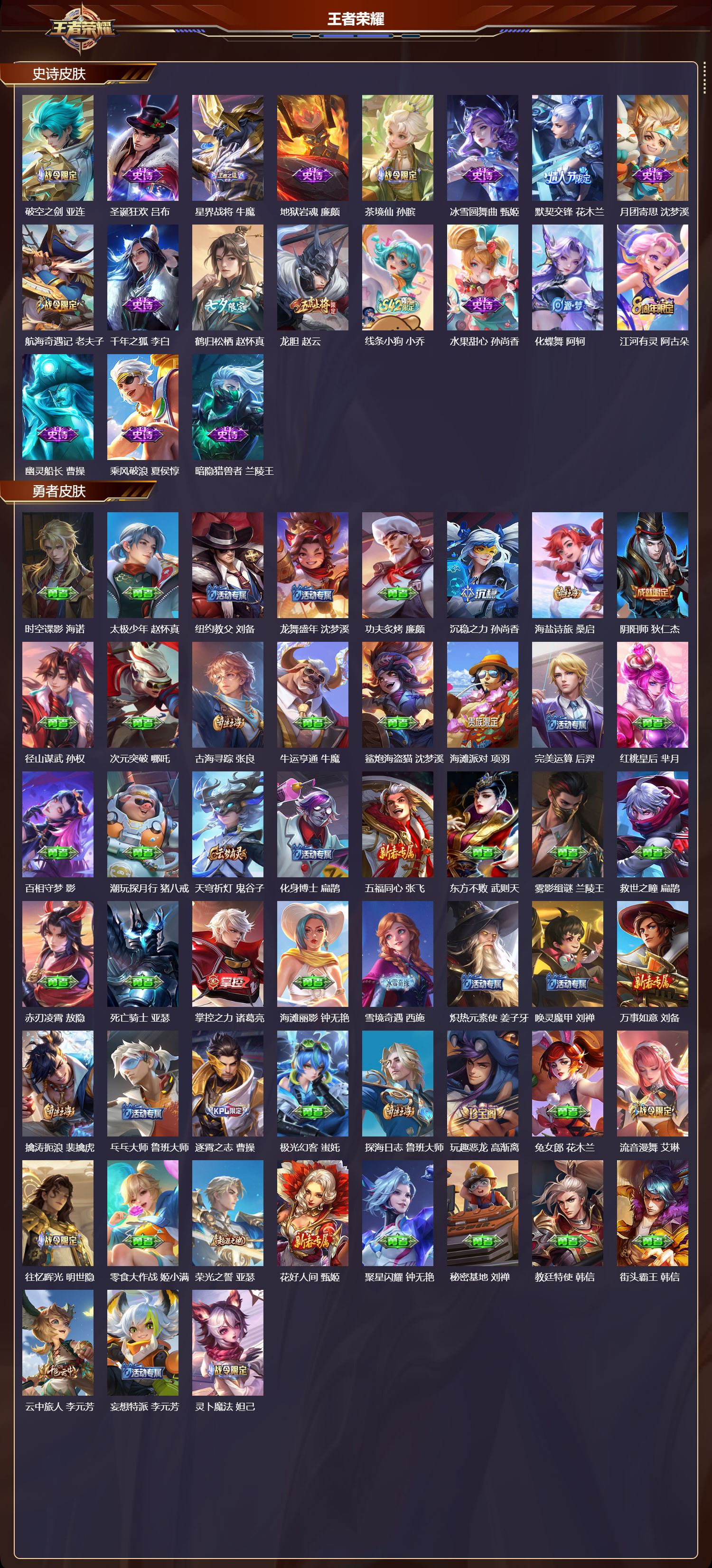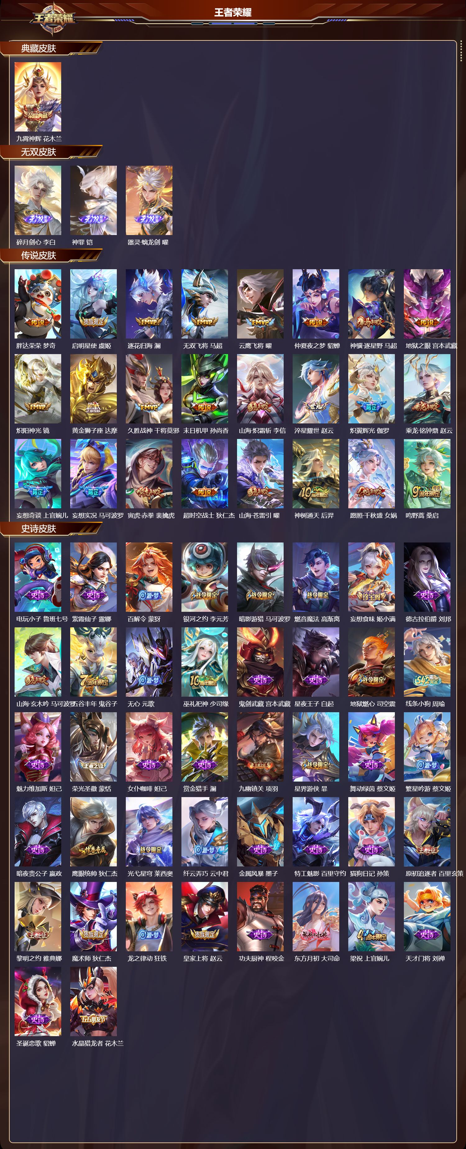 【61,史诗皮肤】电玩小子,鲁班七号,紫霞仙子,露娜,百解令,蒙犽,银河之约,李元芳,暗影游猎,马可波罗,燃音魔法,高渐离,妄想食味,姬小满,德古拉伯爵,刘邦,山海·玄木吟,马可波罗,五谷丰年,鬼谷子,无心,元歌,巫礼祀神,少司缘,鬼剑武藏,宫本武藏,星夜王子,白起,地狱燃心,司空震,线条小狗,周瑜,魅力维加斯,妲己,荣光圣徽,蒙恬,女仆咖啡,妲己,赏金猎手,澜,九幽镇关,项羽,星界游侠,暃,舞动绿茵,蔡文姬,繁星吟游,蔡文姬,暗夜贵公子,嬴政,鹰眼统帅,狄仁杰,光弋星穹,莱西奥,纤云弄巧,云中君,金属风暴,墨子,特工魅影,百里守约,猫狗日记,孙策,原初追逐者,百里玄策,黎明之约,雅典娜,魔术师,狄仁杰,龙之律动,狂铁,皇家上将,赵云,功夫厨神,程咬金,东方月初,大司命,梁祝,上官婉儿,天才门将,刘禅,圣诞恋歌,貂蝉,水晶猎龙者,花木兰,破空之剑,亚连,圣诞狂欢,吕布,星界战将,牛魔,地狱岩魂,廉颇,茶境仙,孙膑,冰雪圆舞曲,甄姬,默契交锋,花木兰,月团寄思,沈梦溪,航海奇遇记,老夫子,千年之狐,李白,鹤归松栖,赵怀真,龙胆,赵云,线条小狗,小乔,水果甜心,孙尚香,化蝶舞,阿轲,江河有灵,阿古朵,幽灵船长,曹操,乘风破浪,夏侯惇,暗隐猎兽者,兰陵王,