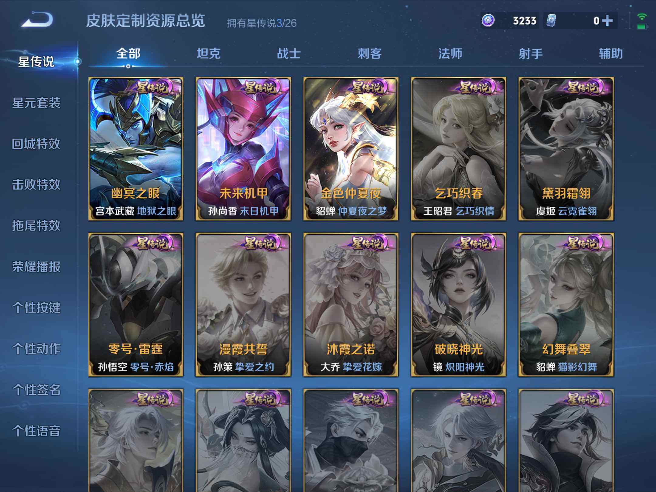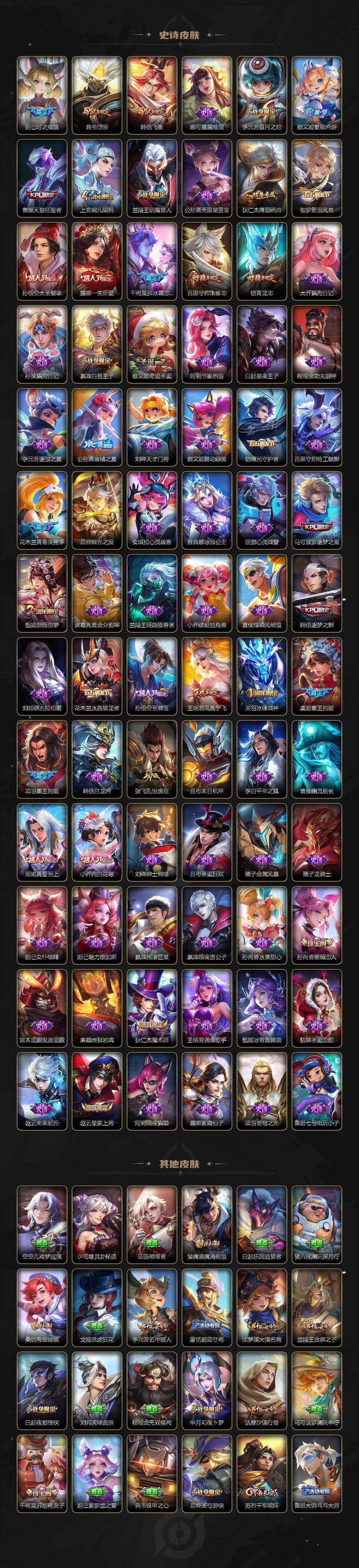 【传说皮肤】:艾琳觅芳踪,裴擒虎寅虎赤拳,鲁班七号寅虎瑞焰,孙尚香异界灵契,貂蝉遇见胡旋,王昭君乞巧织情,西施游龙清影,曜李逍遥,,李元芳飞鸢探春,兰陵王默契交锋,公孙离祈雪灵祝,诸葛亮时雨天司,铠绛天战甲,镜炽阳神光,虞姬启明星使,孙悟空零号赤焰,关羽武圣,曜云鹰飞将,李信一念神魔,刘备时之恋人,伽罗太华,貂蝉猫影幻舞,张良黄金白羊座,虞姬云霓雀翎,达摩黄金狮子座,百里玄策白虎志,花木兰冠军飞将,后羿黄金射手座,杨戬永曜之星,貂蝉仲夏夜之梦,李白凤求凰,孙尚香末日机甲,宫本武藏地狱之眼,孙悟空地狱火,吕布天魔缭乱,狄仁杰超时空战士