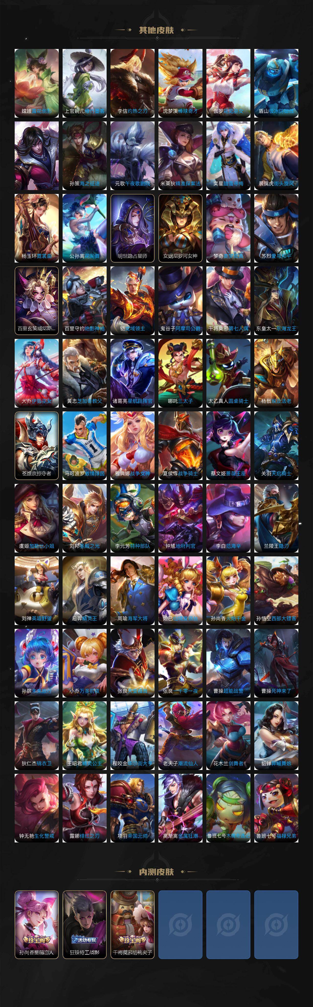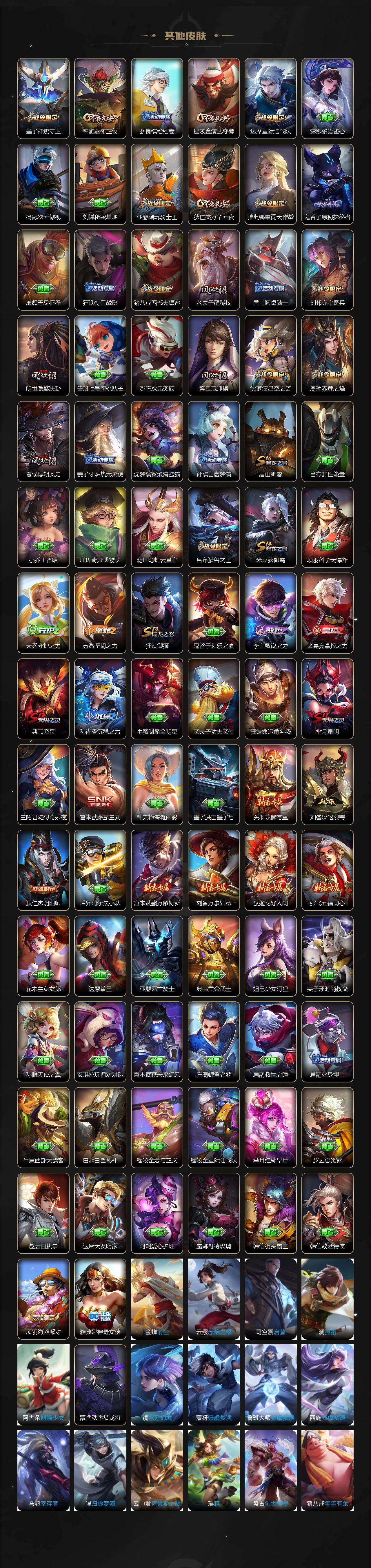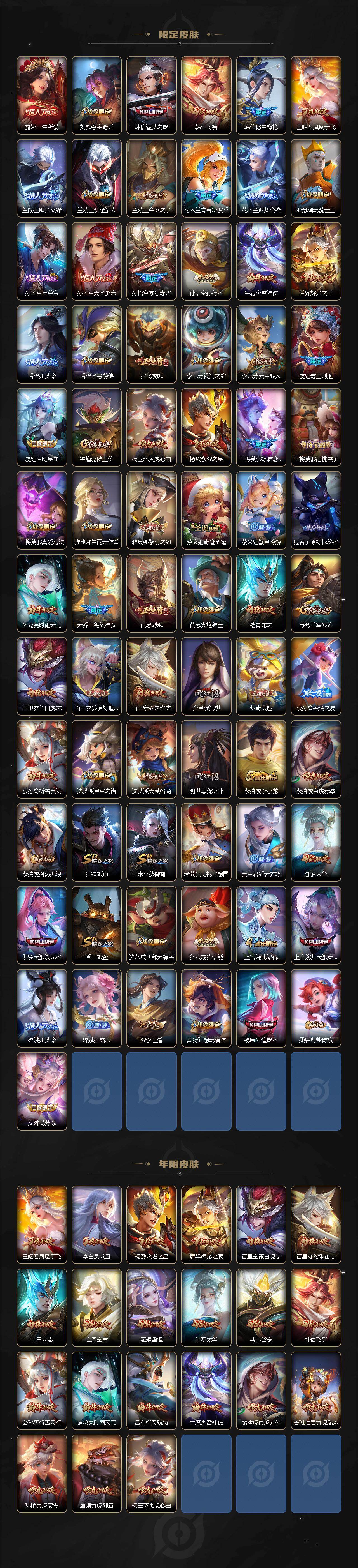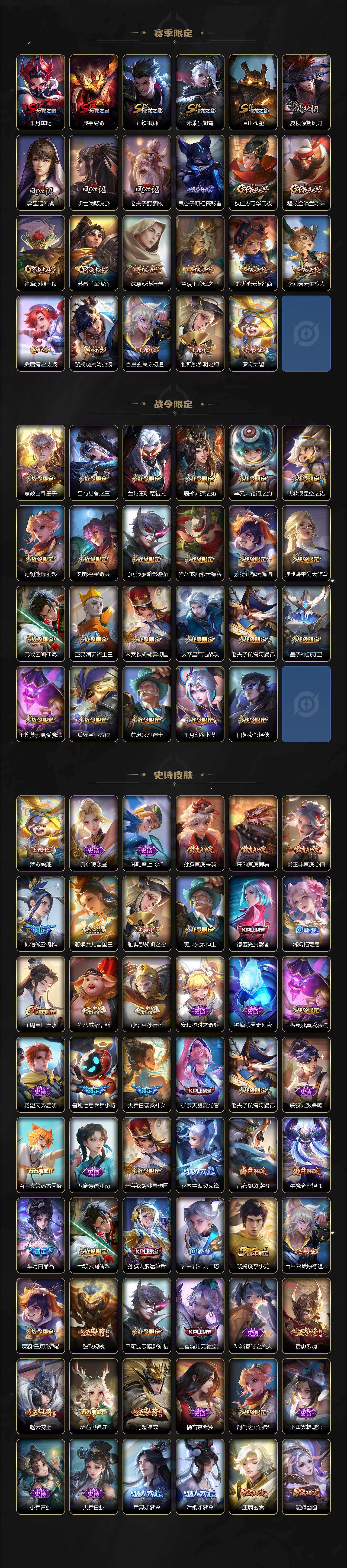 【限定皮肤】:狄仁杰阴阳师,小乔纯白花嫁,廉颇寅虎御盾,赵云皇家上将,赵云龙胆,墨子神迹守卫,妲己时之彼端,嬴政白昼王子,孙尚香蔷薇恋人,孙尚香异界灵契,鲁班七号乒乒小将,鲁班七号寅虎瑞焰,庄周玄嵩,庄周高山流水,阿轲迷踪丽影,孙膑天狼运算者,孙膑寅虎展翼,白起夜都怪侠,芈月重明,芈月白晶晶,芈月幻夜卜梦,吕布天魔缭乱,吕布猎兽之王,吕布御风骁将,周瑜真爱至上,周瑜赤莲之焰,元歌云间偶戏,夏侯惇朔风刀,甄姬幽恒,甄姬女儿国国王,甄姬游园惊梦,曹操天狼征服者,典韦穷奇,典韦岱宗,马可波罗逐梦之星,马可波罗暗影游猎,狄仁杰魔术师,狄仁杰万华元夜,达摩星际陆战队,达摩沙漠行僧,项羽海滩派对,项羽霸王别姬,老夫子醍醐杖,老夫子航海奇遇记,关羽冰锋战神,关羽武圣,貂蝉遇见胡旋,程咬金演武夺筹,露娜一生所爱,刘邦夺宝奇兵,韩信逐梦之影,韩信飞衡,韩信傲雪梅枪,王昭君凤凰于飞,兰陵王默契交锋,兰陵王驯魔猎人,兰陵王金庭之子,花木兰青春决赛季,花木兰默契交锋,亚瑟潮玩骑士王,孙悟空至尊宝,孙悟空大圣娶亲,孙悟空零号赤焰,孙悟空孙行者,牛魔奔雷神使,后羿辉光之辰,后羿如梦令,后羿圣弓游侠,张飞虎魄,李元芳银河之约,李元芳云中旅人,虞姬霸王别姬,虞姬启明星使,钟馗驱傩正仪,杨玉环寅虎心曲,杨戬永曜之星,干将莫邪冰霜恋舞曲,干将莫邪胡桃夹子,干将莫邪真爱魔法,