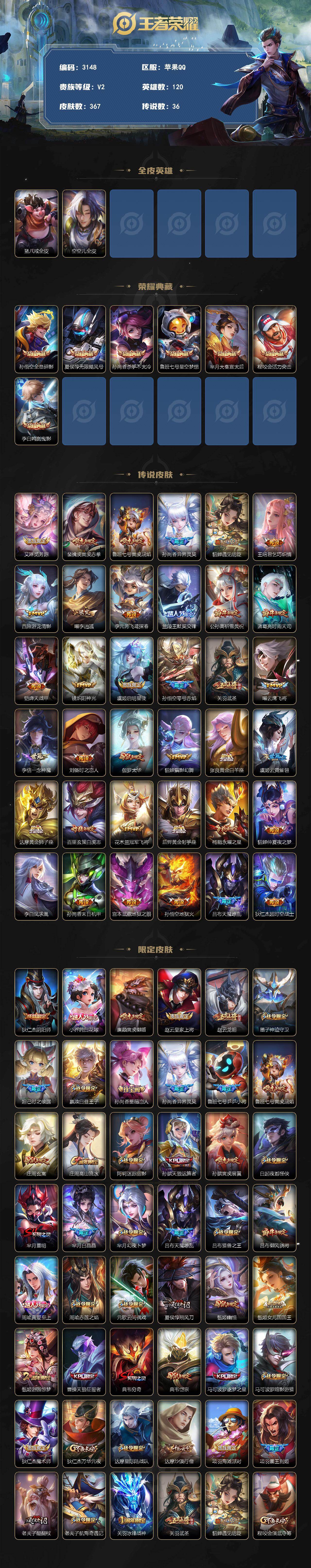 PX_2576972-?,3星传说,7典藏.0违规,可二次,苹果Q-V10-荣耀黄金IV段位-120英雄-367皮肤-7典藏皮肤-36传说-132史诗