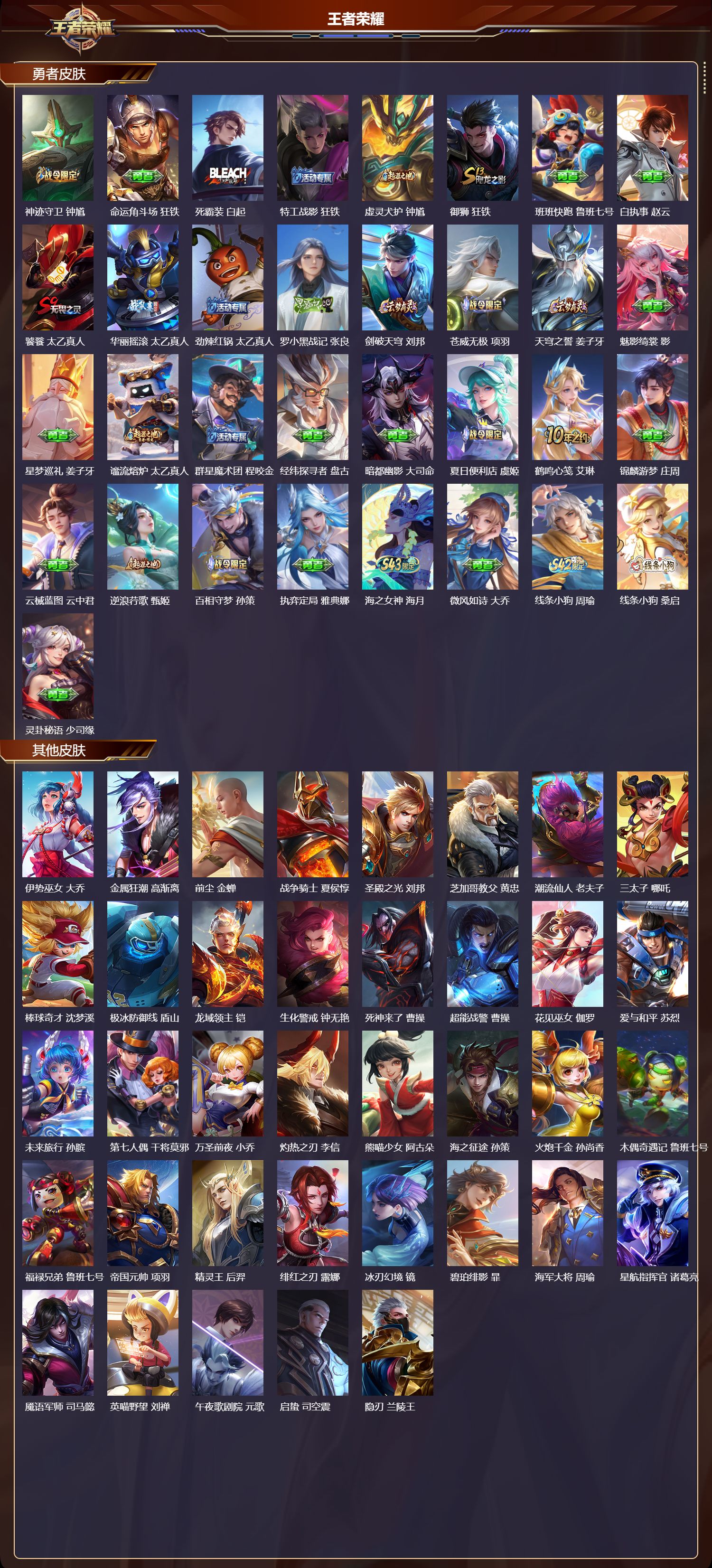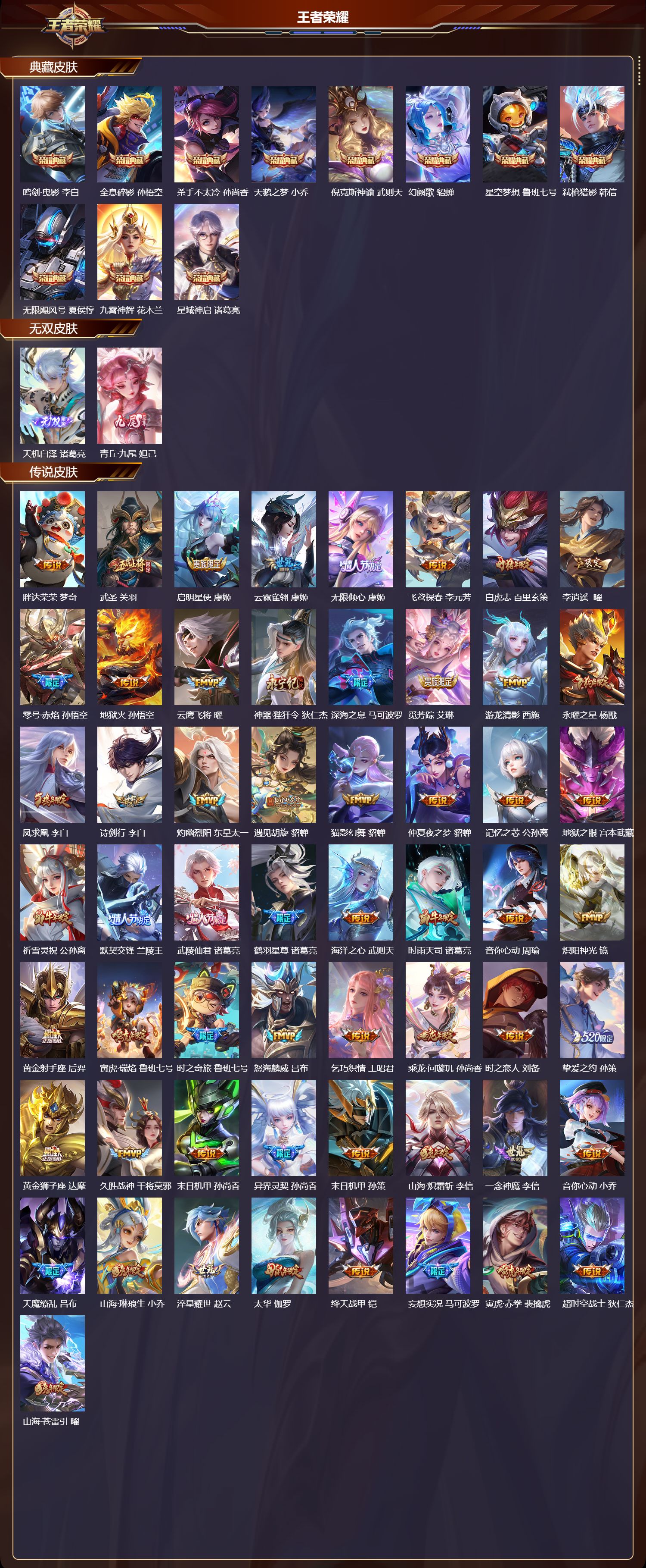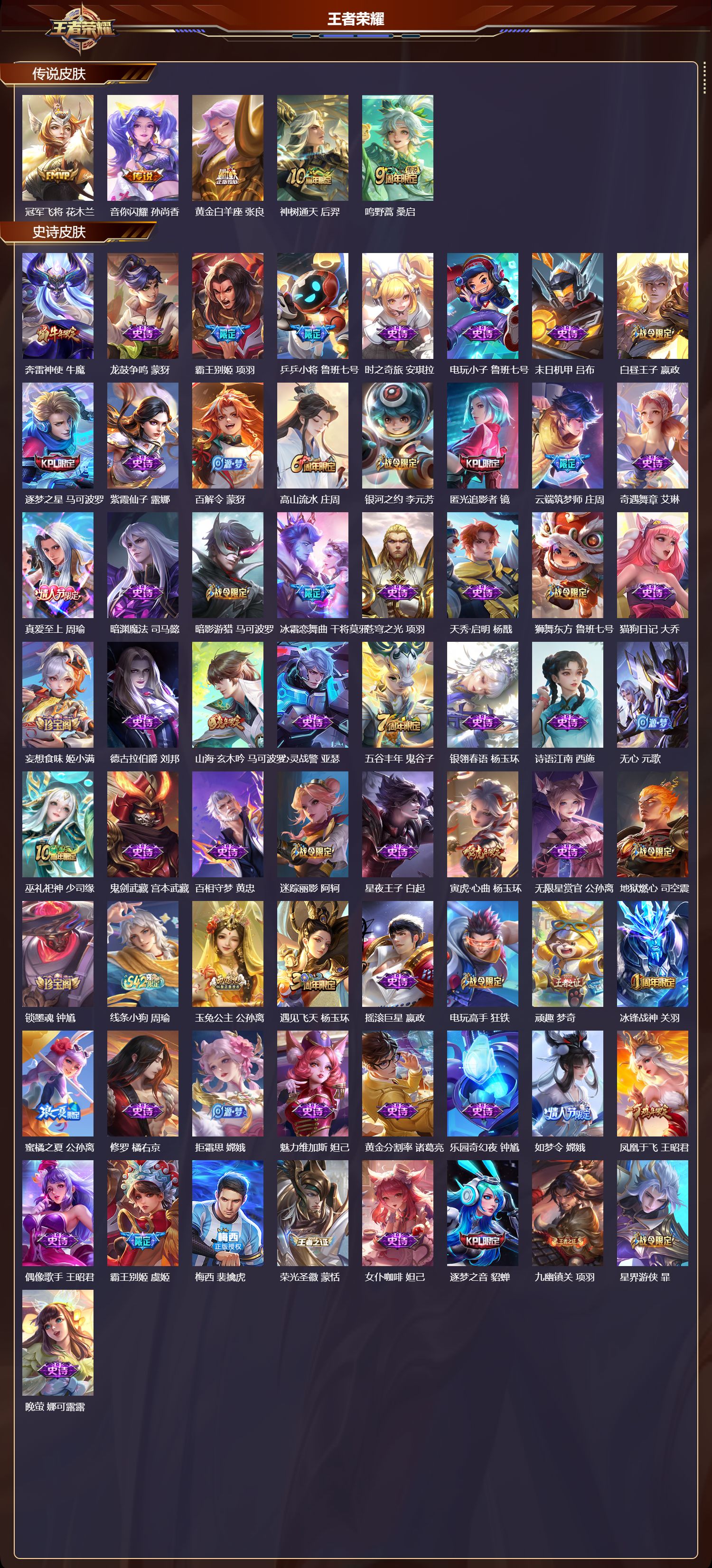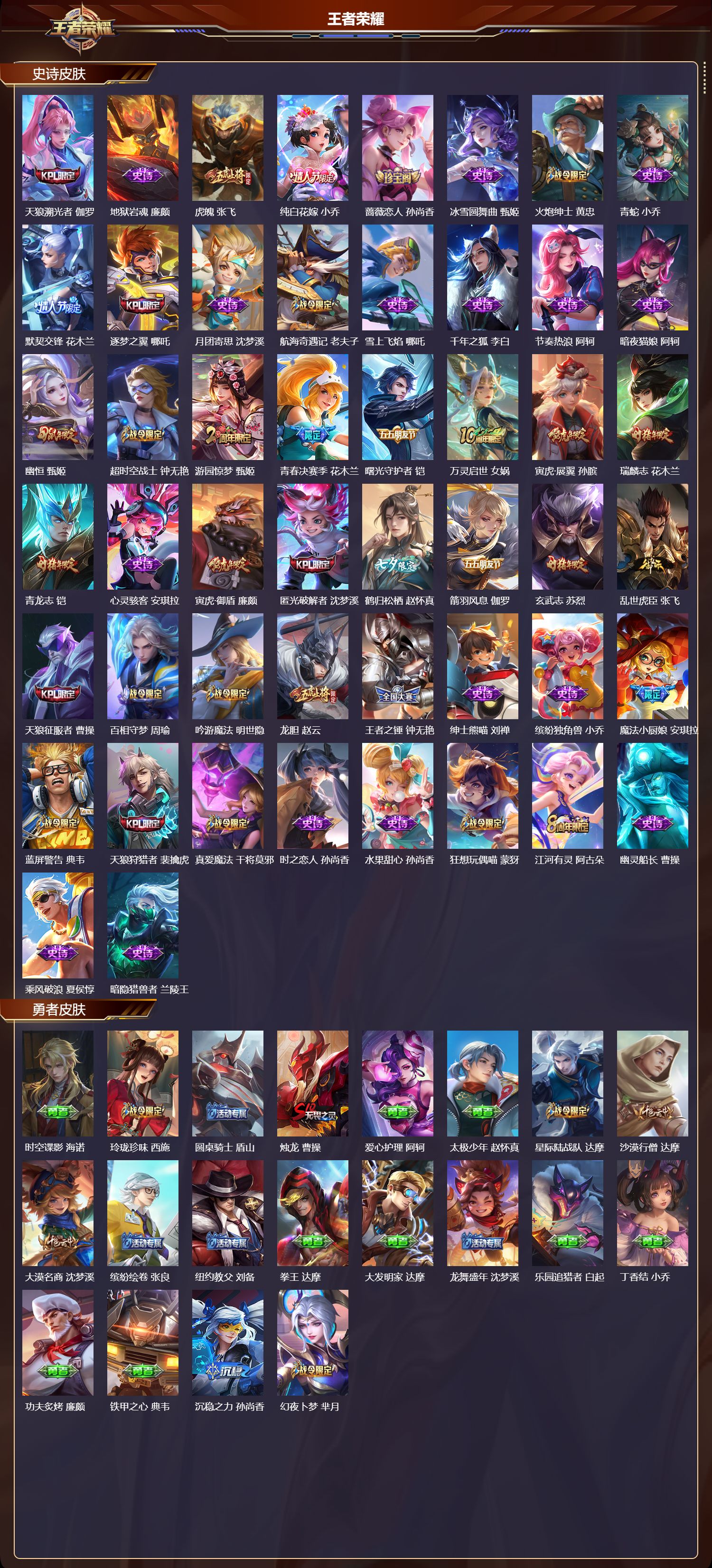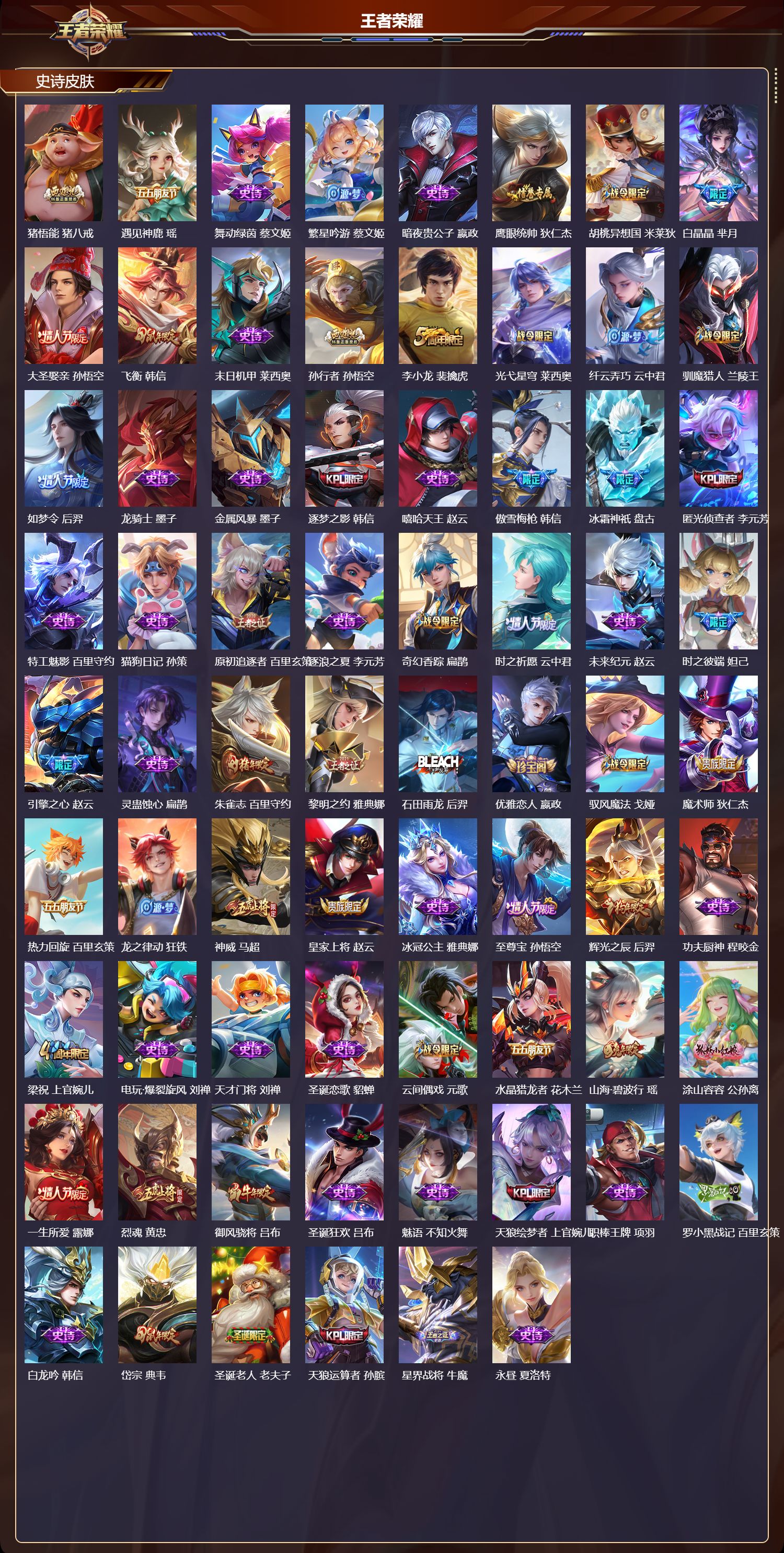 【185,史诗皮肤】奔雷神使,牛魔,龙鼓争鸣,蒙犽,霸王别姬,项羽,乒乒小将,鲁班七号,时之奇旅,安琪拉,电玩小子,鲁班七号,末日机甲,吕布,白昼王子,嬴政,逐梦之星,马可波罗,紫霞仙子,露娜,百解令,蒙犽,高山流水,庄周,银河之约,李元芳,匿光追影者,镜,云端筑梦师,庄周,奇遇舞章,艾琳,真爱至上,周瑜,暗渊魔法,司马懿,暗影游猎,马可波罗,冰霜恋舞曲,干将莫邪,苍穹之光,项羽,天秀·启明,杨戬,狮舞东方,鲁班七号,猫狗日记,大乔,妄想食味,姬小满,德古拉伯爵,刘邦,山海·玄木吟,马可波罗,心灵战警,亚瑟,五谷丰年,鬼谷子,银翎春语,杨玉环,诗语江南,西施,无心,元歌,巫礼祀神,少司缘,鬼剑武藏,宫本武藏,百相守梦,黄忠,迷踪丽影,阿轲,星夜王子,白起,寅虎·心曲,杨玉环,无限星赏官,公孙离,地狱燃心,司空震,锁墨魂,钟馗,线条小狗,周瑜,玉兔公主,公孙离,遇见飞天,杨玉环,摇滚巨星,嬴政,电玩高手,狂铁,顽趣,梦奇,冰锋战神,关羽,蜜橘之夏,公孙离,修罗,橘右京,拒霜思,嫦娥,魅力维加斯,妲己,黄金分割率,诸葛亮,乐园奇幻夜,钟馗,如梦令,嫦娥,凤凰于飞,王昭君,偶像歌手,王昭君,霸王别姬,虞姬,梅西,裴擒虎,荣光圣徽,蒙恬,女仆咖啡,妲己,逐梦之音,貂蝉,九幽镇关,项羽,星界游侠,暃,晚萤,娜可露露,猪悟能,猪八戒,遇见神鹿,瑶,舞动绿茵,蔡文姬,繁星吟游,蔡文姬,暗夜贵公子,嬴政,鹰眼统帅,狄仁杰,胡桃异想国,米莱狄,白晶晶,芈月,大圣娶亲,孙悟空,飞衡,韩信,末日机甲,莱西奥,孙行者,孙悟空,李小龙,裴擒虎,光弋星穹,莱西奥,纤云弄巧,云中君,驯魔猎人,兰陵王,如梦令,后羿,龙骑士,墨子,金属风暴,墨子,逐梦之影,韩信,嘻哈天王,赵云,傲雪梅枪,韩信,冰霜神祇,盘古,匿光侦查者,李元芳,特工魅影,百里守约,猫狗日记,孙策,原初追逐者,百里玄策,逐浪之夏,李元芳,奇幻香踪,扁鹊,时之祈愿,云中君,未来纪元,赵云,时之彼端,妲己,引擎之心,赵云,灵蛊蚀心,扁鹊,朱雀志,百里守约,黎明之约,雅典娜,石田雨龙,后羿,优雅恋人,嬴政,驭风魔法,戈娅,魔术师,狄仁杰,热力回旋,百里玄策,龙之律动,狂铁,神威,马超,皇家上将,赵云,冰冠公主,雅典娜,至尊宝,孙悟空,辉光之辰,后羿,功夫厨神,程咬金,梁祝,上官婉儿,电玩·爆裂旋风,刘禅,天才门将,刘禅,圣诞恋歌,貂蝉,云间偶戏,元歌,水晶猎龙者,花木兰,山海·碧波行,瑶,涂山容容,公孙离,一生所爱,露娜,烈魂,黄忠,御风骁将,吕布,圣诞狂欢,吕布,魅语,不知火舞,天狼绘梦者,上官婉儿,职棒王牌,项羽,罗小黑战记,百里玄策,白龙吟,韩信,岱宗,典韦,圣诞老人,老夫子,天狼运算者,孙膑,星界战将,牛魔,永昼,夏洛特,天狼溯光者,伽罗,地狱岩魂,廉颇,虎魄,张飞,纯白花嫁,小乔,蔷薇恋人,孙尚香,冰雪圆舞曲,甄姬,火炮绅士,黄忠,青蛇,小乔,默契交锋,花木兰,逐梦之翼,哪吒,月团寄思,沈梦溪,航海奇遇记,老夫子,雪上飞焰,哪吒,千年之狐,李白,节奏热浪,阿轲,暗夜猫娘,阿轲,幽恒,甄姬,超时空战士,钟无艳,游园惊梦,甄姬,青春决赛季,花木兰,曙光守护者,铠,万灵启世,女娲,寅虎·展翼,孙膑,瑞麟志,花木兰,青龙志,铠,心灵骇客,安琪拉,寅虎·御盾,廉颇,匿光破解者,沈梦溪,鹤归松栖,赵怀真,箭羽风息,伽罗,玄武志,苏烈,乱世虎臣,张飞,天狼征服者,曹操,百相守梦,周瑜,吟游魔法,明世隐,龙胆,赵云,王者之锤,钟无艳,绅士熊喵,刘禅,缤纷独角兽,小乔,魔法小厨娘,安琪拉,蓝屏警告,典韦,天狼狩猎者,裴擒虎,真爱魔法,干将莫邪,时之恋人,孙尚香,水果甜心,孙尚香,狂想玩偶喵,蒙犽,江河有灵,阿古朵,幽灵船长,曹操,乘风破浪,夏侯惇,暗隐猎兽者,兰陵王,