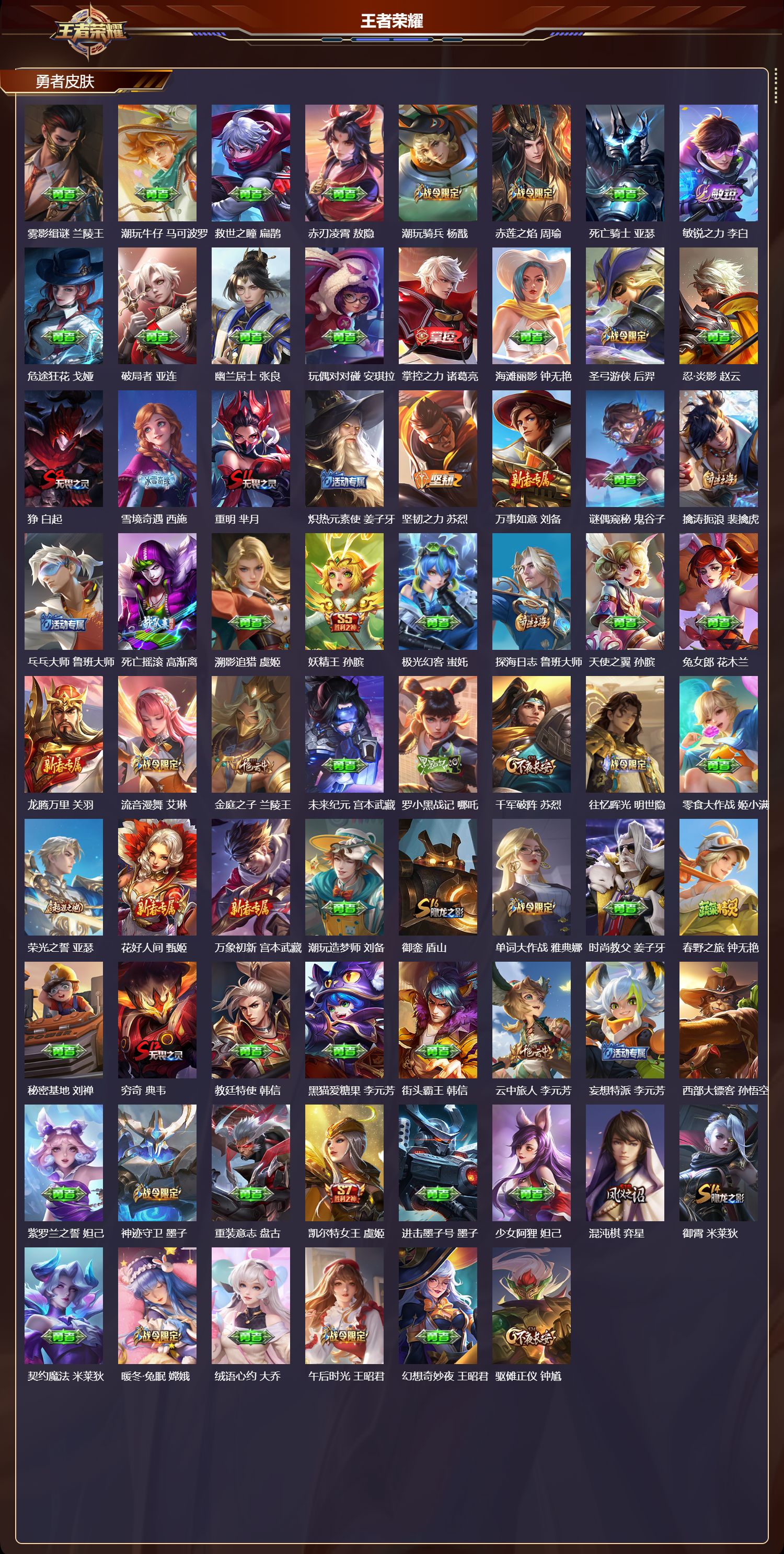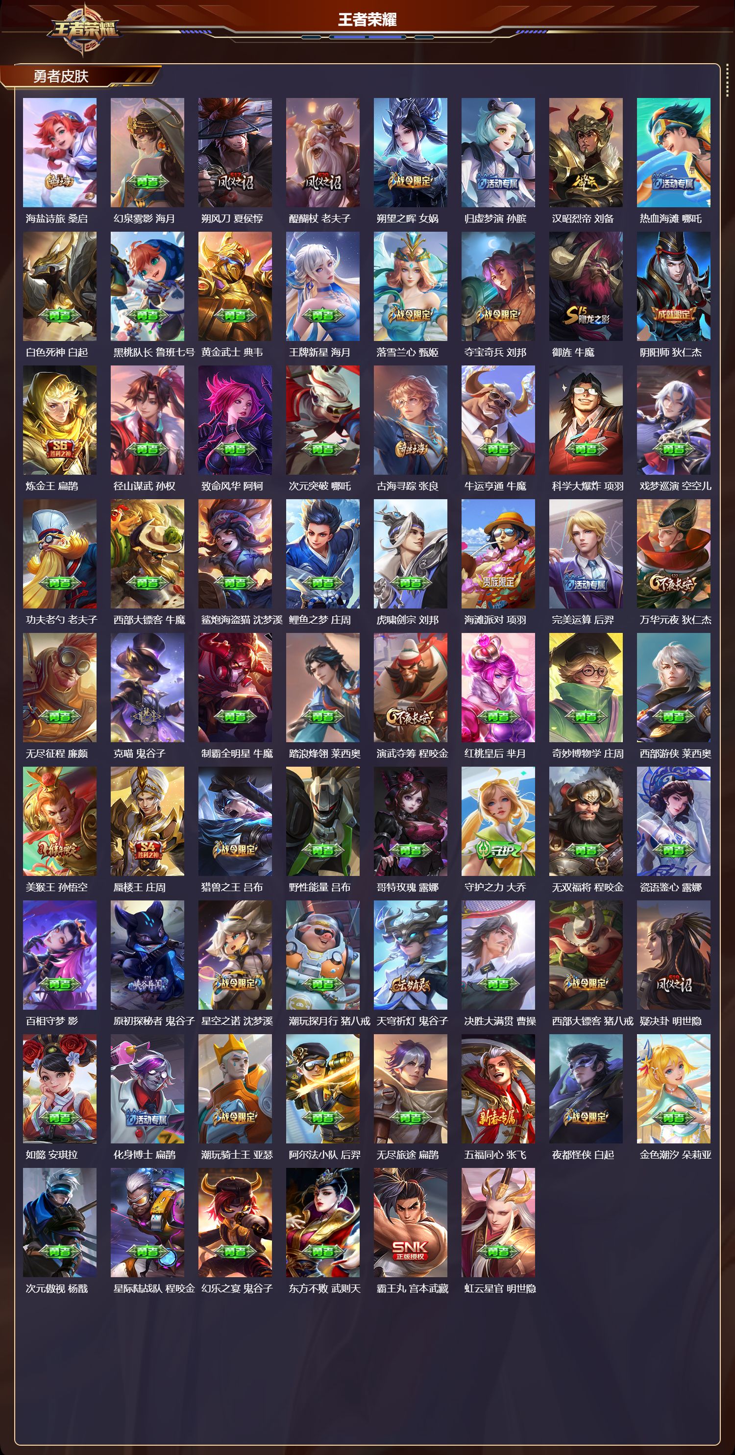 【193,勇者皮肤】时空谍影,海诺,玲珑珍味,西施,圆桌骑士,盾山,烛龙,曹操,爱心护理,阿轲,太极少年,赵怀真,星际陆战队,达摩,沙漠行僧,达摩,大漠名商,沈梦溪,缤纷绘卷,张良,纽约教父,刘备,拳王,达摩,大发明家,达摩,龙舞盛年,沈梦溪,乐园追猎者,白起,丁香结,小乔,功夫炙烤,廉颇,铁甲之心,典韦,沉稳之力,孙尚香,幻夜卜梦,芈月,海盐诗旅,桑启,幻泉雾影,海月,朔风刀,夏侯惇,醍醐杖,老夫子,朔望之晖,女娲,归虚梦演,孙膑,汉昭烈帝,刘备,热血海滩,哪吒,白色死神,白起,黑桃队长,鲁班七号,黄金武士,典韦,王牌新星,海月,落雪兰心,甄姬,夺宝奇兵,刘邦,御旌,牛魔,阴阳师,狄仁杰,炼金王,扁鹊,径山谋武,孙权,致命风华,阿轲,次元突破,哪吒,古海寻踪,张良,牛运亨通,牛魔,科学大爆炸,项羽,戏梦巡演,空空儿,功夫老勺,老夫子,西部大镖客,牛魔,鲨炮海盗猫,沈梦溪,鲤鱼之梦,庄周,虎啸剑宗,刘邦,海滩派对,项羽,完美运算,后羿,万华元夜,狄仁杰,无尽征程,廉颇,克喵,鬼谷子,制霸全明星,牛魔,踏浪烽翎,莱西奥,演武夺筹,程咬金,红桃皇后,芈月,奇妙博物学,庄周,西部游侠,莱西奥,美猴王,孙悟空,蜃楼王,庄周,猎兽之王,吕布,野性能量,吕布,哥特玫瑰,露娜,守护之力,大乔,无双福将,程咬金,瓷语鉴心,露娜,百相守梦,影,原初探秘者,鬼谷子,星空之诺,沈梦溪,潮玩探月行,猪八戒,天穹祈灯,鬼谷子,决胜大满贯,曹操,西部大镖客,猪八戒,疑决卦,明世隐,如懿,安琪拉,化身博士,扁鹊,潮玩骑士王,亚瑟,阿尔法小队,后羿,无尽旅途,扁鹊,五福同心,张飞,夜都怪侠,白起,金色潮汐,朵莉亚,次元傲视,杨戬,星际陆战队,程咬金,幻乐之宴,鬼谷子,东方不败,武则天,霸王丸,宫本武藏,虹云星官,明世隐,雾影缉谜,兰陵王,潮玩牛仔,马可波罗,救世之瞳,扁鹊,赤刃凌霄,敖隐,潮玩骑兵,杨戬,赤莲之焰,周瑜,死亡骑士,亚瑟,敏锐之力,李白,危途狂花,戈娅,破局者,亚连,幽兰居士,张良,玩偶对对碰,安琪拉,掌控之力,诸葛亮,海滩丽影,钟无艳,圣弓游侠,后羿,忍·炎影,赵云,狰,白起,雪境奇遇,西施,重明,芈月,炽热元素使,姜子牙,坚韧之力,苏烈,万事如意,刘备,谜偶窥秘,鬼谷子,擒涛扼浪,裴擒虎,乓乓大师,鲁班大师,死亡摇滚,高渐离,溯影追猎,虞姬,妖精王,孙膑,极光幻客,蚩奼,探海日志,鲁班大师,天使之翼,孙膑,兔女郎,花木兰,龙腾万里,关羽,流音漫舞,艾琳,金庭之子,兰陵王,未来纪元,宫本武藏,罗小黑战记,哪吒,千军破阵,苏烈,往忆晖光,明世隐,零食大作战,姬小满,荣光之誓,亚瑟,花好人间,甄姬,万象初新,宫本武藏,潮玩造梦师,刘备,御銮,盾山,单词大作战,雅典娜,时尚教父,姜子牙,春野之旅,钟无艳,秘密基地,刘禅,穷奇,典韦,教廷特使,韩信,黑猫爱糖果,李元芳,街头霸王,韩信,云中旅人,李元芳,妄想特派,李元芳,西部大镖客,孙悟空,紫罗兰之誓,妲己,神迹守卫,墨子,重装意志,盘古,凯尔特女王,虞姬,进击墨子号,墨子,少女阿狸,妲己,混沌棋,弈星,御霄,米莱狄,契约魔法,米莱狄,暖冬·兔眠,嫦娥,绒语心约,大乔,午后时光,王昭君,幻想奇妙夜,王昭君,驱傩正仪,钟馗,神迹守卫,钟馗,命运角斗场,狂铁,死霸装,白起,特工战影,狂铁,虚灵犬护,钟馗,御狮,狂铁,班班快跑,鲁班七号,白执事,赵云,饕餮,太乙真人,华丽摇滚,太乙真人,劲辣红锅,太乙真人,罗小黑战记,张良,剑破天穹,刘邦,苍威无极,项羽,天穹之誓,姜子牙,魅影绮裳,影,星梦巡礼,姜子牙,谧流熔炉,太乙真人,群星魔术团,程咬金,经纬探寻者,盘古,暗都幽影,大司命,夏日便利店,虞姬,鹤鸣心笺,艾琳,锦麟游梦,庄周,云械蓝图,云中君,逆浪荇歌,甄姬,百相守梦,孙策,执弈定局,雅典娜,海之女神,海月,微风如诗,大乔,线条小狗,周瑜,线条小狗,桑启,灵卦秘语,少司缘,