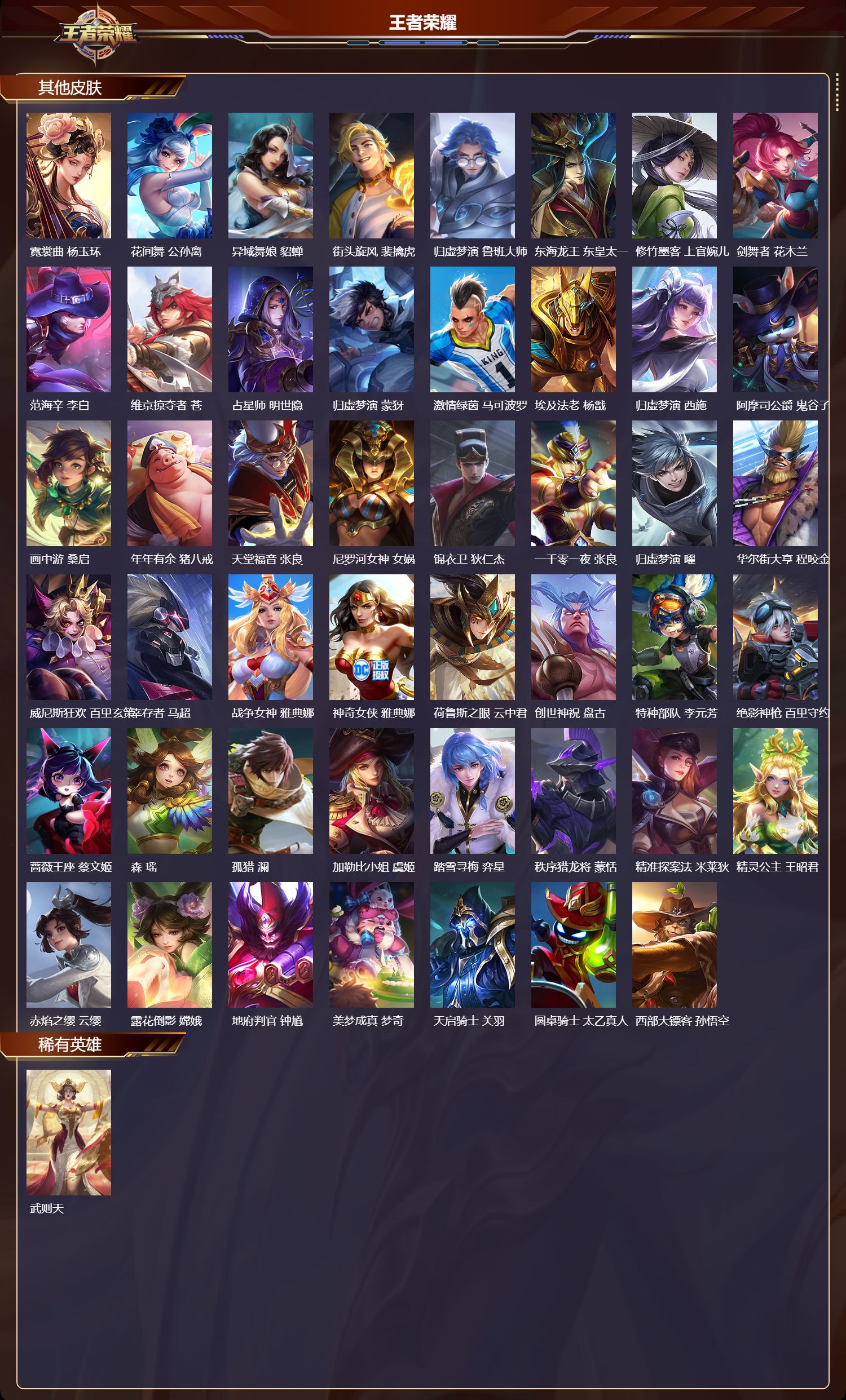 【84,其他皮肤】伊势巫女,大乔,金属狂潮,高渐离,前尘,金蝉,战争骑士,夏侯惇,圣殿之光,刘邦,芝加哥教父,黄忠,潮流仙人,老夫子,三太子,哪吒,棒球奇才,沈梦溪,极冰防御线,盾山,龙域领主,铠,生化警戒,钟无艳,死神来了,曹操,超能战警,曹操,花见巫女,伽罗,爱与和平,苏烈,未来旅行,孙膑,第七人偶,干将莫邪,万圣前夜,小乔,灼热之刃,李信,熊喵少女,阿古朵,海之征途,孙策,火炮千金,孙尚香,木偶奇遇记,鲁班七号,福禄兄弟,鲁班七号,帝国元帅,项羽,精灵王,后羿,绯红之刃,露娜,冰刃幻境,镜,碧珀绯影,暃,海军大将,周瑜,星航指挥官,诸葛亮,魇语军师,司马懿,英喵野望,刘禅,午夜歌剧院,元歌,启蛰,司空震,隐刃,兰陵王,霓裳曲,杨玉环,花间舞,公孙离,异域舞娘,貂蝉,街头旋风,裴擒虎,归虚梦演,鲁班大师,东海龙王,东皇太一,修竹墨客,上官婉儿,剑舞者,花木兰,范海辛,李白,维京掠夺者,苍,占星师,明世隐,归虚梦演,蒙犽,激情绿茵,马可波罗,埃及法老,杨戬,归虚梦演,西施,阿摩司公爵,鬼谷子,画中游,桑启,年年有余,猪八戒,天堂福音,张良,尼罗河女神,女娲,锦衣卫,狄仁杰,一千零一夜,张良,归虚梦演,曜,华尔街大亨,程咬金,威尼斯狂欢,百里玄策,幸存者,马超,战争女神,雅典娜,神奇女侠,雅典娜,荷鲁斯之眼,云中君,创世神祝,盘古,特种部队,李元芳,绝影神枪,百里守约,蔷薇王座,蔡文姬,森,瑶,孤猎,澜,加勒比小姐,虞姬,踏雪寻梅,弈星,秩序猎龙将,蒙恬,精准探案法,米莱狄,精灵公主,王昭君,赤焰之缨,云缨,露花倒影,嫦娥,地府判官,钟馗,美梦成真,梦奇,天启骑士,关羽,圆桌骑士,太乙真人,西部大镖客,孙悟空,