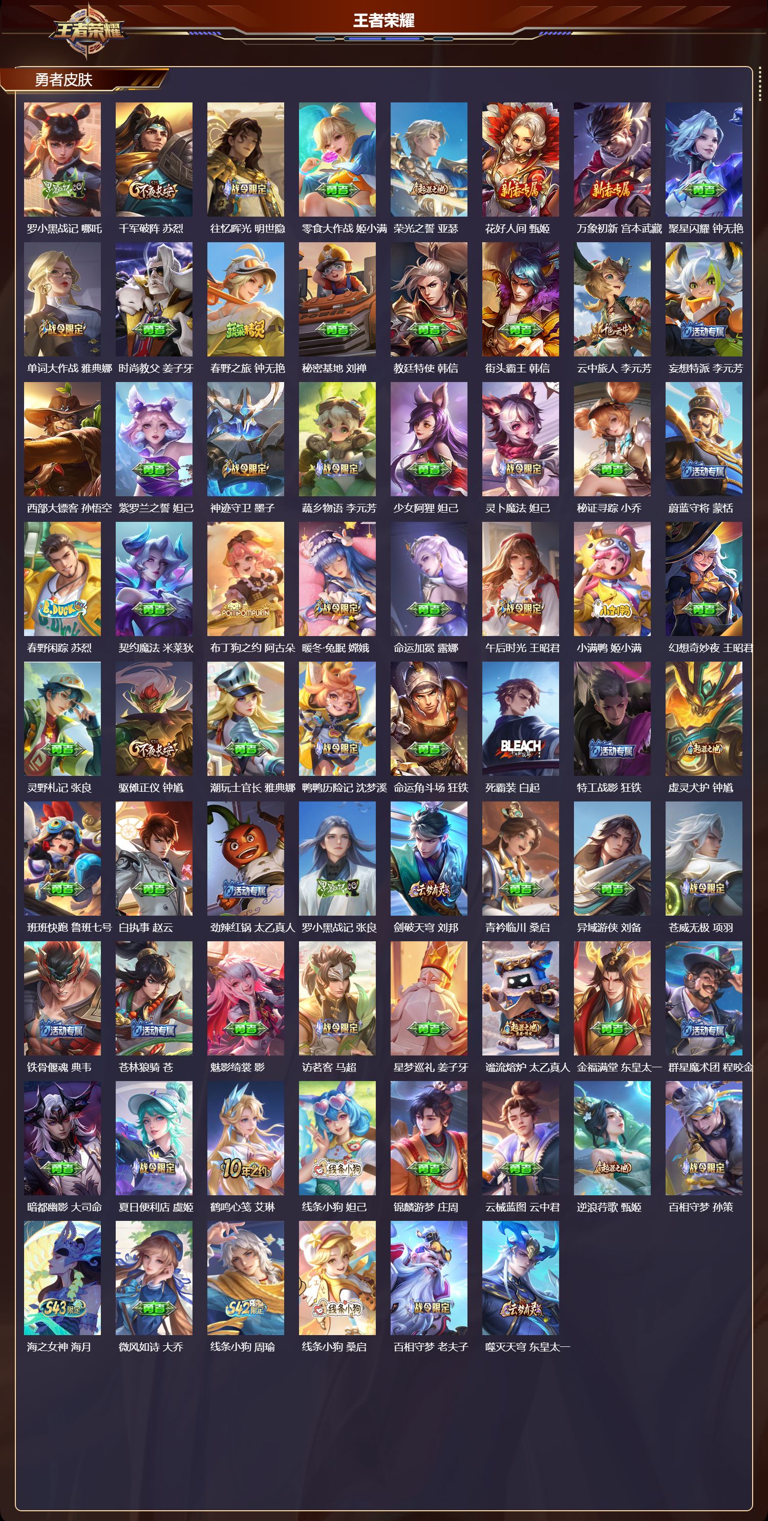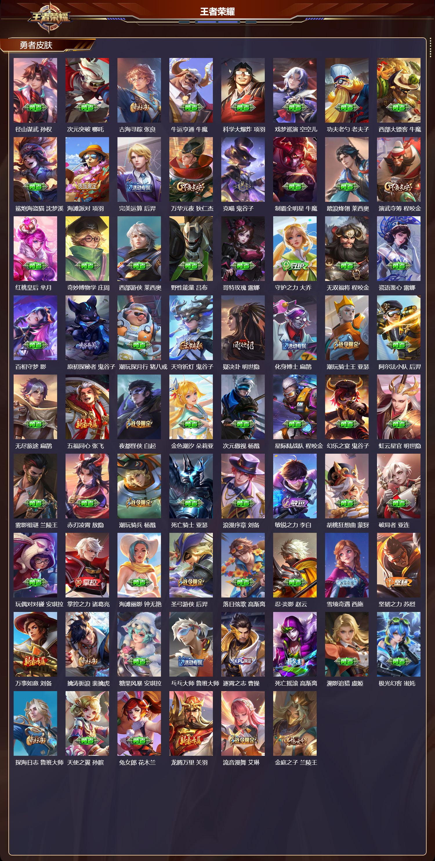 【169,勇者皮肤】时空谍影,海诺,玲珑珍味,西施,圆桌骑士,盾山,爱心护理,阿轲,太极少年,赵怀真,星际陆战队,达摩,沙漠行僧,达摩,大漠名商,沈梦溪,缤纷绘卷,张良,纽约教父,刘备,拳王,达摩,大发明家,达摩,丁香结,小乔,功夫炙烤,廉颇,沉稳之力,孙尚香,幻夜卜梦,芈月,海盐诗旅,桑启,幻泉雾影,海月,醍醐杖,老夫子,朔望之晖,女娲,归虚梦演,孙膑,汉昭烈帝,刘备,白色死神,白起,黄金武士,典韦,落雪兰心,甄姬,阴阳师,狄仁杰,径山谋武,孙权,次元突破,哪吒,古海寻踪,张良,牛运亨通,牛魔,科学大爆炸,项羽,戏梦巡演,空空儿,功夫老勺,老夫子,西部大镖客,牛魔,鲨炮海盗猫,沈梦溪,海滩派对,项羽,完美运算,后羿,万华元夜,狄仁杰,克喵,鬼谷子,制霸全明星,牛魔,踏浪烽翎,莱西奥,演武夺筹,程咬金,红桃皇后,芈月,奇妙博物学,庄周,西部游侠,莱西奥,野性能量,吕布,哥特玫瑰,露娜,守护之力,大乔,无双福将,程咬金,瓷语鉴心,露娜,百相守梦,影,原初探秘者,鬼谷子,潮玩探月行,猪八戒,天穹祈灯,鬼谷子,疑决卦,明世隐,化身博士,扁鹊,潮玩骑士王,亚瑟,阿尔法小队,后羿,无尽旅途,扁鹊,五福同心,张飞,夜都怪侠,白起,金色潮汐,朵莉亚,次元傲视,杨戬,星际陆战队,程咬金,幻乐之宴,鬼谷子,虹云星官,明世隐,雾影缉谜,兰陵王,赤刃凌霄,敖隐,潮玩骑兵,杨戬,死亡骑士,亚瑟,浪漫序章,刘备,敏锐之力,李白,胡桃狂想曲,蒙犽,破局者,亚连,玩偶对对碰,安琪拉,掌控之力,诸葛亮,海滩丽影,钟无艳,圣弓游侠,后羿,落日弦歌,高渐离,忍·炎影,赵云,雪境奇遇,西施,坚韧之力,苏烈,万事如意,刘备,擒涛扼浪,裴擒虎,糖果风暴,安琪拉,乓乓大师,鲁班大师,逐霄之志,曹操,死亡摇滚,高渐离,溯影追猎,虞姬,极光幻客,蚩奼,探海日志,鲁班大师,天使之翼,孙膑,兔女郎,花木兰,龙腾万里,关羽,流音漫舞,艾琳,金庭之子,兰陵王,罗小黑战记,哪吒,千军破阵,苏烈,往忆晖光,明世隐,零食大作战,姬小满,荣光之誓,亚瑟,花好人间,甄姬,万象初新,宫本武藏,聚星闪耀,钟无艳,单词大作战,雅典娜,时尚教父,姜子牙,春野之旅,钟无艳,秘密基地,刘禅,教廷特使,韩信,街头霸王,韩信,云中旅人,李元芳,妄想特派,李元芳,西部大镖客,孙悟空,紫罗兰之誓,妲己,神迹守卫,墨子,蔬乡物语,李元芳,少女阿狸,妲己,灵卜魔法,妲己,秘证寻踪,小乔,蔚蓝守将,蒙恬,春野闲踪,苏烈,契约魔法,米莱狄,布丁狗之约,阿古朵,暖冬·兔眠,嫦娥,命运加冕,露娜,午后时光,王昭君,小满鸭,姬小满,幻想奇妙夜,王昭君,灵野札记,张良,驱傩正仪,钟馗,潮玩士官长,雅典娜,鸭鸭历险记,沈梦溪,命运角斗场,狂铁,死霸装,白起,特工战影,狂铁,虚灵犬护,钟馗,班班快跑,鲁班七号,白执事,赵云,劲辣红锅,太乙真人,罗小黑战记,张良,剑破天穹,刘邦,青衿临川,桑启,异域游侠,刘备,苍威无极,项羽,铁骨偃魂,典韦,苍林狼骑,苍,魅影绮裳,影,访茗客,马超,星梦巡礼,姜子牙,谧流熔炉,太乙真人,金福满堂,东皇太一,群星魔术团,程咬金,暗都幽影,大司命,夏日便利店,虞姬,鹤鸣心笺,艾琳,线条小狗,妲己,锦麟游梦,庄周,云械蓝图,云中君,逆浪荇歌,甄姬,百相守梦,孙策,海之女神,海月,微风如诗,大乔,线条小狗,周瑜,线条小狗,桑启,百相守梦,老夫子,噬灭天穹,东皇太一,灵卦秘语,少司缘,玫蓝誓约,戈娅,景韶洛都,明世隐,