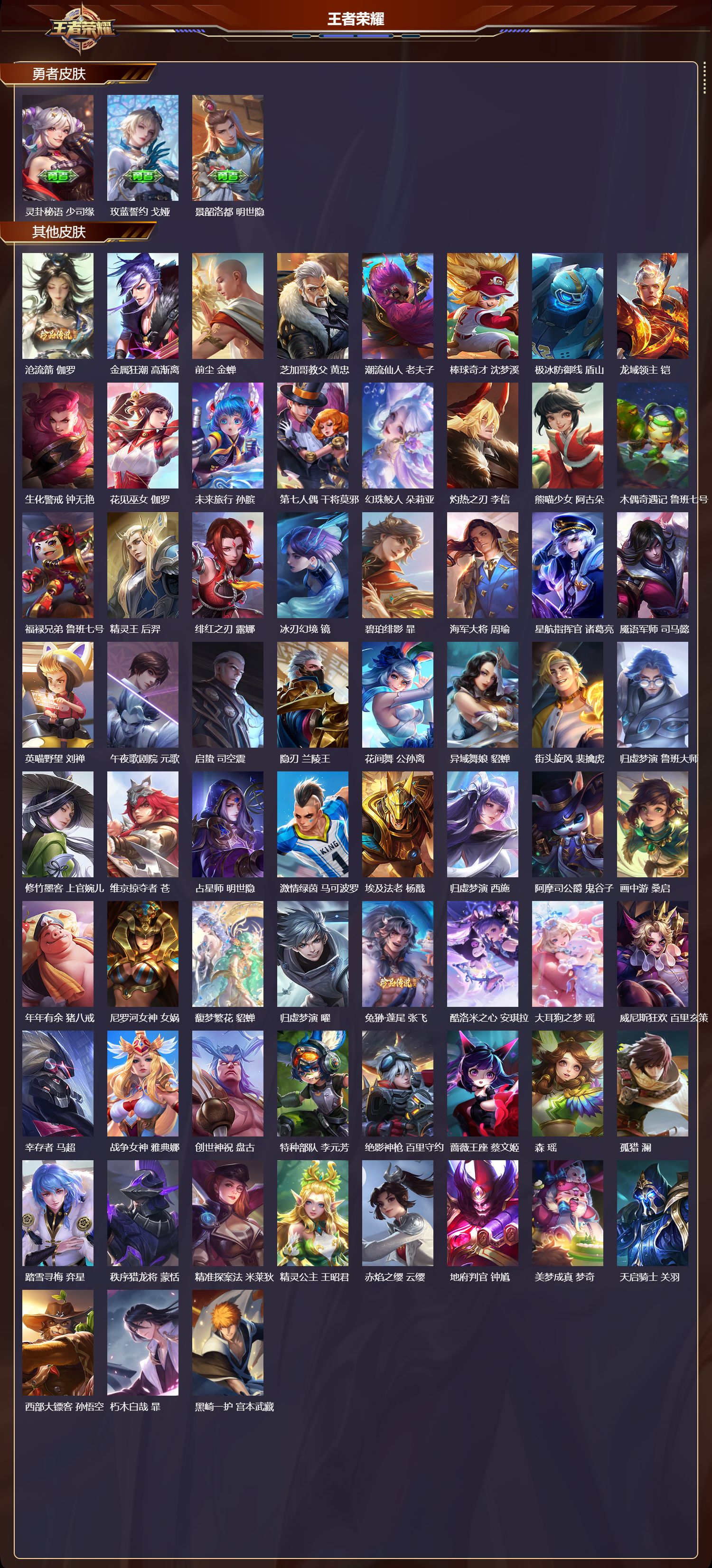 【69,其他皮肤】沧流箭,伽罗,金属狂潮,高渐离,前尘,金蝉,芝加哥教父,黄忠,潮流仙人,老夫子,棒球奇才,沈梦溪,极冰防御线,盾山,龙域领主,铠,生化警戒,钟无艳,花见巫女,伽罗,未来旅行,孙膑,第七人偶,干将莫邪,幻珠鲛人,朵莉亚,灼热之刃,李信,熊喵少女,阿古朵,木偶奇遇记,鲁班七号,福禄兄弟,鲁班七号,精灵王,后羿,绯红之刃,露娜,冰刃幻境,镜,碧珀绯影,暃,海军大将,周瑜,星航指挥官,诸葛亮,魇语军师,司马懿,英喵野望,刘禅,午夜歌剧院,元歌,启蛰,司空震,隐刃,兰陵王,花间舞,公孙离,异域舞娘,貂蝉,街头旋风,裴擒虎,归虚梦演,鲁班大师,修竹墨客,上官婉儿,维京掠夺者,苍,占星师,明世隐,激情绿茵,马可波罗,埃及法老,杨戬,归虚梦演,西施,阿摩司公爵,鬼谷子,画中游,桑启,年年有余,猪八戒,尼罗河女神,女娲,馥梦繁花,貂蝉,归虚梦演,曜,兔狲·蓬尾,张飞,酷洛米之心,安琪拉,大耳狗之梦,瑶,威尼斯狂欢,百里玄策,幸存者,马超,战争女神,雅典娜,创世神祝,盘古,特种部队,李元芳,绝影神枪,百里守约,蔷薇王座,蔡文姬,森,瑶,孤猎,澜,踏雪寻梅,弈星,秩序猎龙将,蒙恬,精准探案法,米莱狄,精灵公主,王昭君,赤焰之缨,云缨,地府判官,钟馗,美梦成真,梦奇,天启骑士,关羽,西部大镖客,孙悟空,朽木白哉,暃,黑崎一护,宫本武藏,器灵·落星盏,嫦娥,时之奇旅,孙策,
