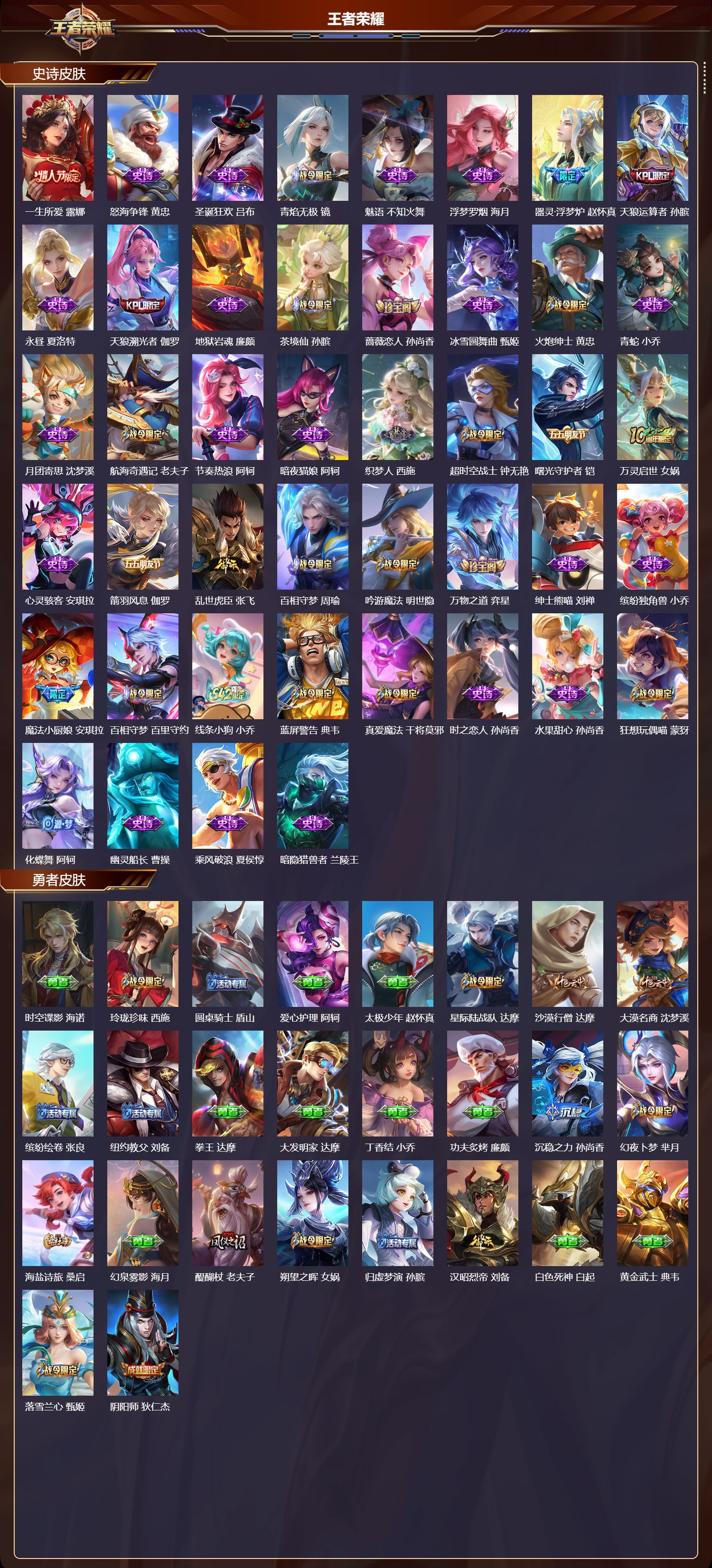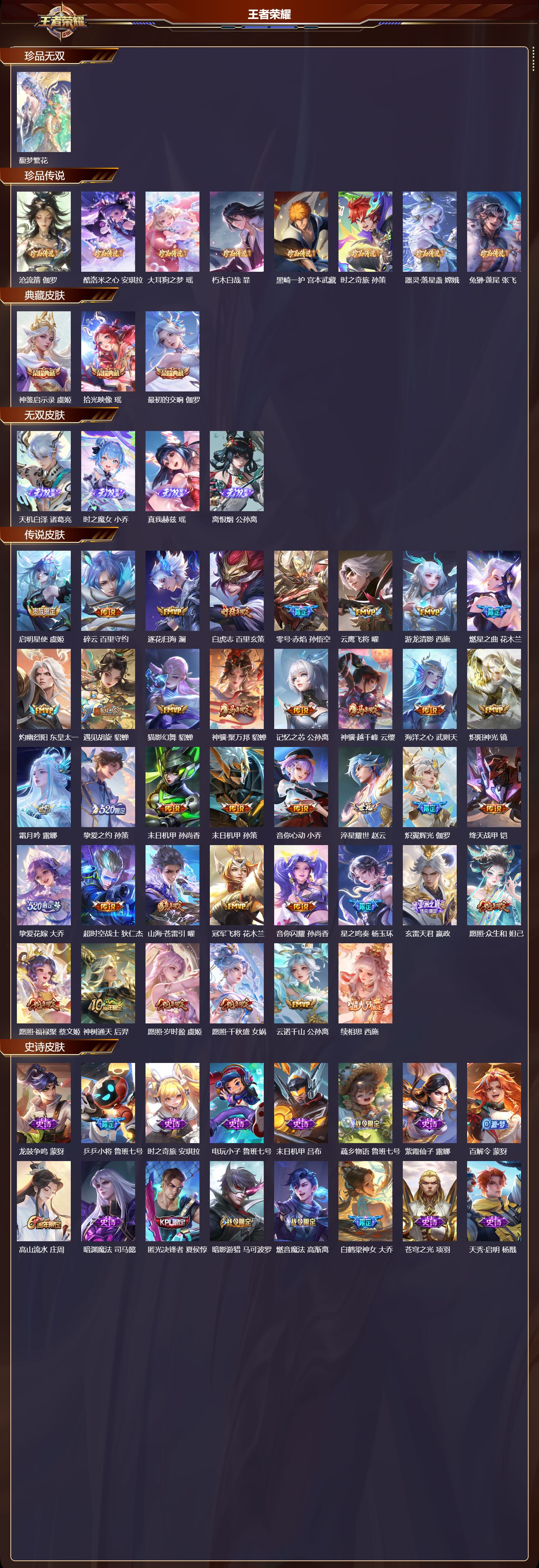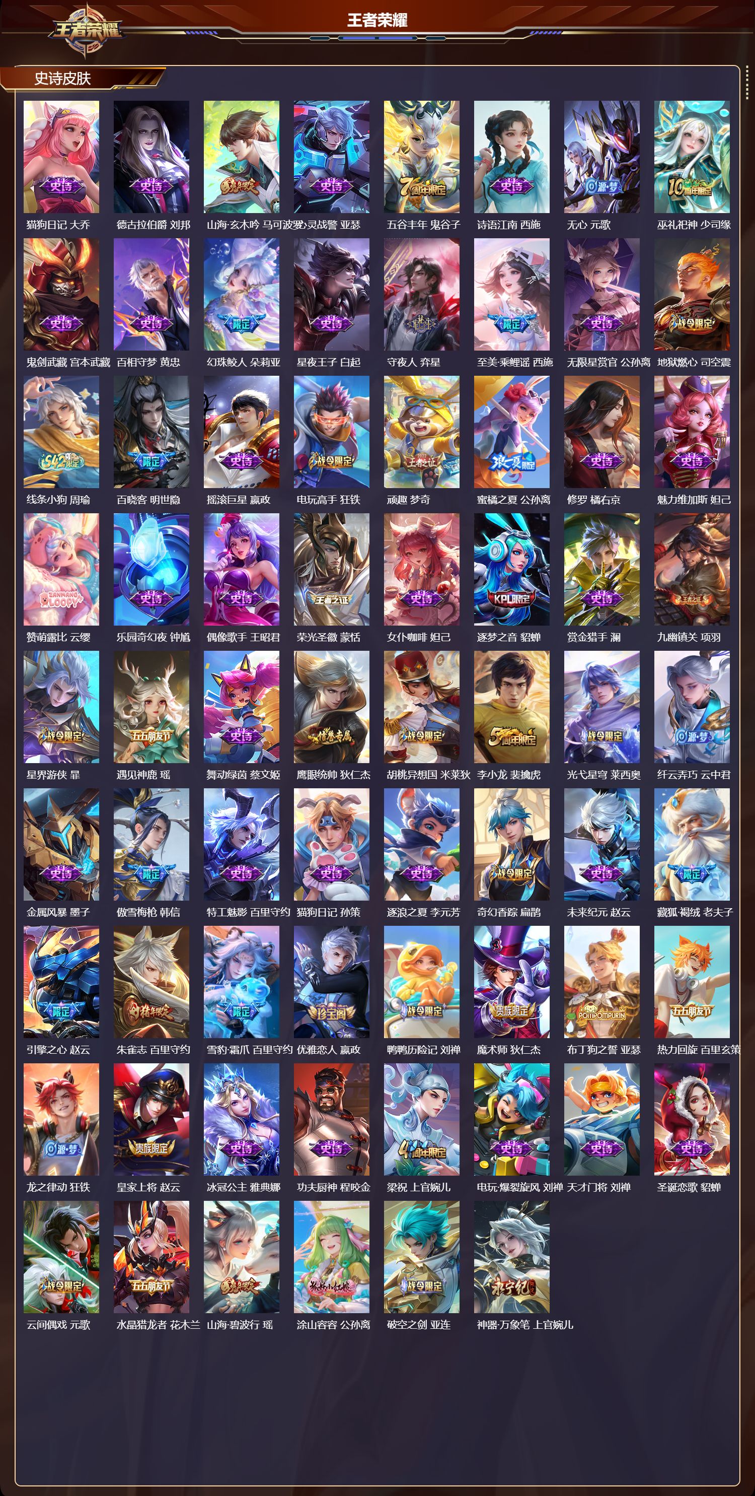 【130,史诗皮肤】龙鼓争鸣,蒙犽,乒乒小将,鲁班七号,时之奇旅,安琪拉,电玩小子,鲁班七号,末日机甲,吕布,蔬乡物语,鲁班七号,紫霞仙子,露娜,百解令,蒙犽,高山流水,庄周,暗渊魔法,司马懿,匿光决锋者,夏侯惇,暗影游猎,马可波罗,燃音魔法,高渐离,白鹤梁神女,大乔,苍穹之光,项羽,天秀·启明,杨戬,猫狗日记,大乔,德古拉伯爵,刘邦,山海·玄木吟,马可波罗,心灵战警,亚瑟,五谷丰年,鬼谷子,诗语江南,西施,无心,元歌,巫礼祀神,少司缘,鬼剑武藏,宫本武藏,百相守梦,黄忠,幻珠鲛人,朵莉亚,星夜王子,白起,守夜人,弈星,至美·乘鲤谣,西施,无限星赏官,公孙离,地狱燃心,司空震,线条小狗,周瑜,百晓客,明世隐,摇滚巨星,嬴政,电玩高手,狂铁,顽趣,梦奇,蜜橘之夏,公孙离,修罗,橘右京,魅力维加斯,妲己,赞萌露比,云缨,乐园奇幻夜,钟馗,偶像歌手,王昭君,荣光圣徽,蒙恬,女仆咖啡,妲己,逐梦之音,貂蝉,赏金猎手,澜,九幽镇关,项羽,星界游侠,暃,遇见神鹿,瑶,舞动绿茵,蔡文姬,鹰眼统帅,狄仁杰,胡桃异想国,米莱狄,李小龙,裴擒虎,光弋星穹,莱西奥,纤云弄巧,云中君,金属风暴,墨子,傲雪梅枪,韩信,特工魅影,百里守约,猫狗日记,孙策,逐浪之夏,李元芳,奇幻香踪,扁鹊,未来纪元,赵云,藏狐·褐绒,老夫子,引擎之心,赵云,朱雀志,百里守约,雪豹·霜爪,百里守约,优雅恋人,嬴政,鸭鸭历险记,刘禅,魔术师,狄仁杰,布丁狗之誓,亚瑟,热力回旋,百里玄策,龙之律动,狂铁,皇家上将,赵云,冰冠公主,雅典娜,功夫厨神,程咬金,梁祝,上官婉儿,电玩·爆裂旋风,刘禅,天才门将,刘禅,圣诞恋歌,貂蝉,云间偶戏,元歌,水晶猎龙者,花木兰,山海·碧波行,瑶,涂山容容,公孙离,破空之剑,亚连,神器·万象笔,上官婉儿,一生所爱,露娜,怒海争锋,黄忠,圣诞狂欢,吕布,青焰无极,镜,魅语,不知火舞,浮梦罗烟,海月,器灵·浮梦炉,赵怀真,天狼运算者,孙膑,永昼,夏洛特,天狼溯光者,伽罗,地狱岩魂,廉颇,茶境仙,孙膑,蔷薇恋人,孙尚香,冰雪圆舞曲,甄姬,火炮绅士,黄忠,青蛇,小乔,月团寄思,沈梦溪,航海奇遇记,老夫子,节奏热浪,阿轲,暗夜猫娘,阿轲,织梦人,西施,超时空战士,钟无艳,曙光守护者,铠,万灵启世,女娲,心灵骇客,安琪拉,箭羽风息,伽罗,乱世虎臣,张飞,百相守梦,周瑜,吟游魔法,明世隐,万物之道,弈星,绅士熊喵,刘禅,缤纷独角兽,小乔,魔法小厨娘,安琪拉,百相守梦,百里守约,线条小狗,小乔,蓝屏警告,典韦,真爱魔法,干将莫邪,时之恋人,孙尚香,水果甜心,孙尚香,狂想玩偶喵,蒙犽,化蝶舞,阿轲,幽灵船长,曹操,乘风破浪,夏侯惇,暗隐猎兽者,兰陵王,