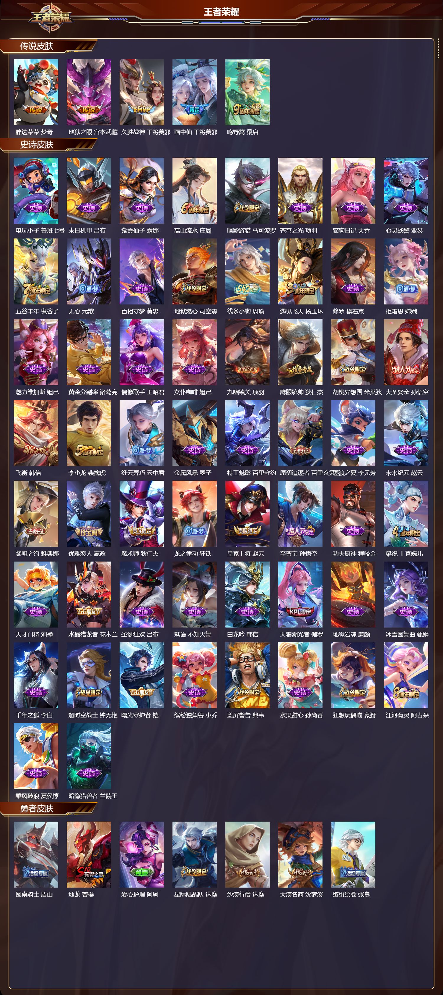 【58,史诗皮肤】电玩小子,鲁班七号,末日机甲,吕布,紫霞仙子,露娜,高山流水,庄周,暗影游猎,马可波罗,苍穹之光,项羽,猫狗日记,大乔,心灵战警,亚瑟,五谷丰年,鬼谷子,无心,元歌,百相守梦,黄忠,地狱燃心,司空震,线条小狗,周瑜,遇见飞天,杨玉环,修罗,橘右京,拒霜思,嫦娥,魅力维加斯,妲己,黄金分割率,诸葛亮,偶像歌手,王昭君,女仆咖啡,妲己,九幽镇关,项羽,鹰眼统帅,狄仁杰,胡桃异想国,米莱狄,大圣娶亲,孙悟空,飞衡,韩信,李小龙,裴擒虎,纤云弄巧,云中君,金属风暴,墨子,特工魅影,百里守约,原初追逐者,百里玄策,逐浪之夏,李元芳,未来纪元,赵云,黎明之约,雅典娜,优雅恋人,嬴政,魔术师,狄仁杰,龙之律动,狂铁,皇家上将,赵云,至尊宝,孙悟空,功夫厨神,程咬金,梁祝,上官婉儿,天才门将,刘禅,水晶猎龙者,花木兰,圣诞狂欢,吕布,魅语,不知火舞,白龙吟,韩信,天狼溯光者,伽罗,地狱岩魂,廉颇,冰雪圆舞曲,甄姬,千年之狐,李白,超时空战士,钟无艳,曙光守护者,铠,缤纷独角兽,小乔,蓝屏警告,典韦,水果甜心,孙尚香,狂想玩偶喵,蒙犽,江河有灵,阿古朵,乘风破浪,夏侯惇,暗隐猎兽者,兰陵王,