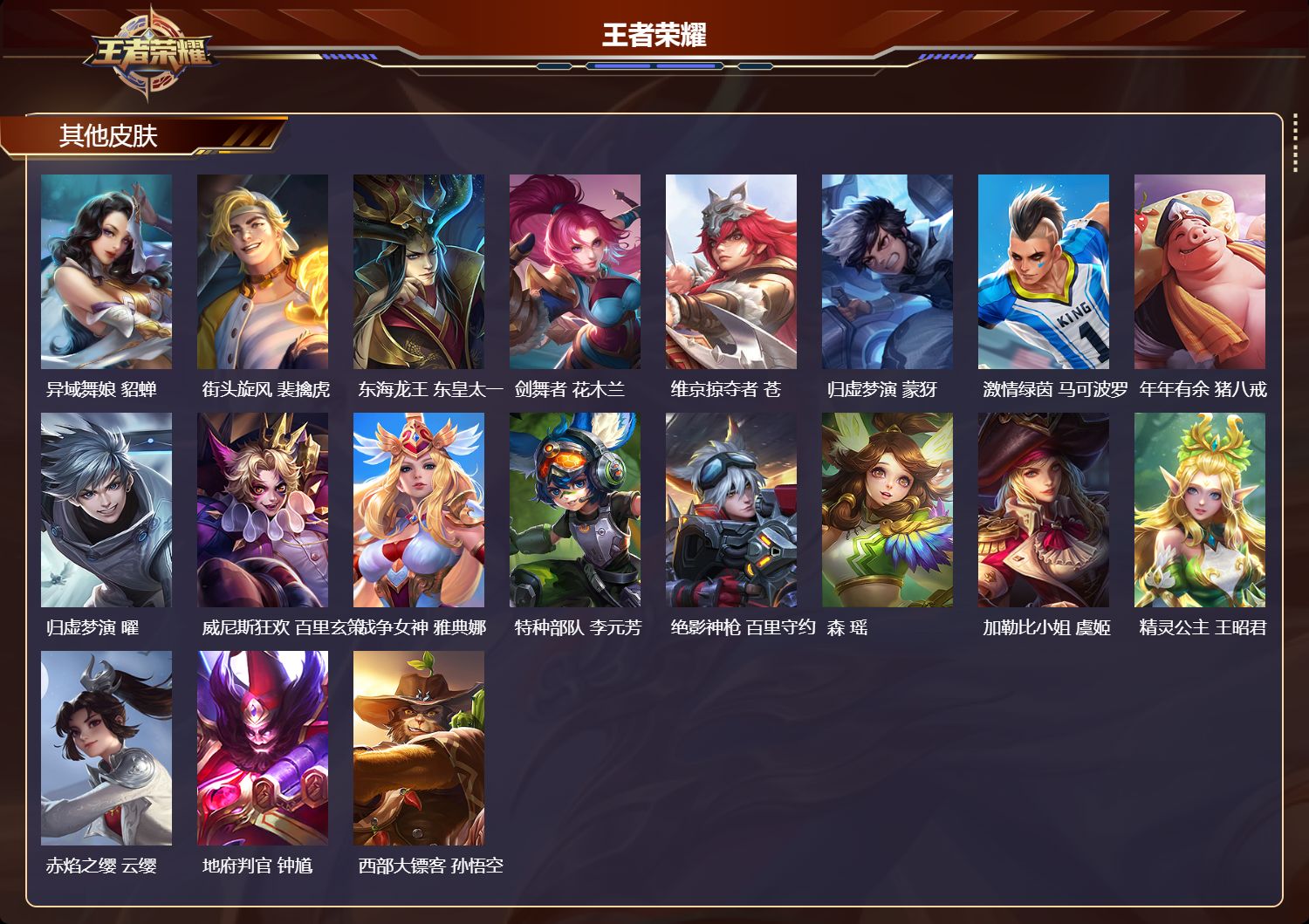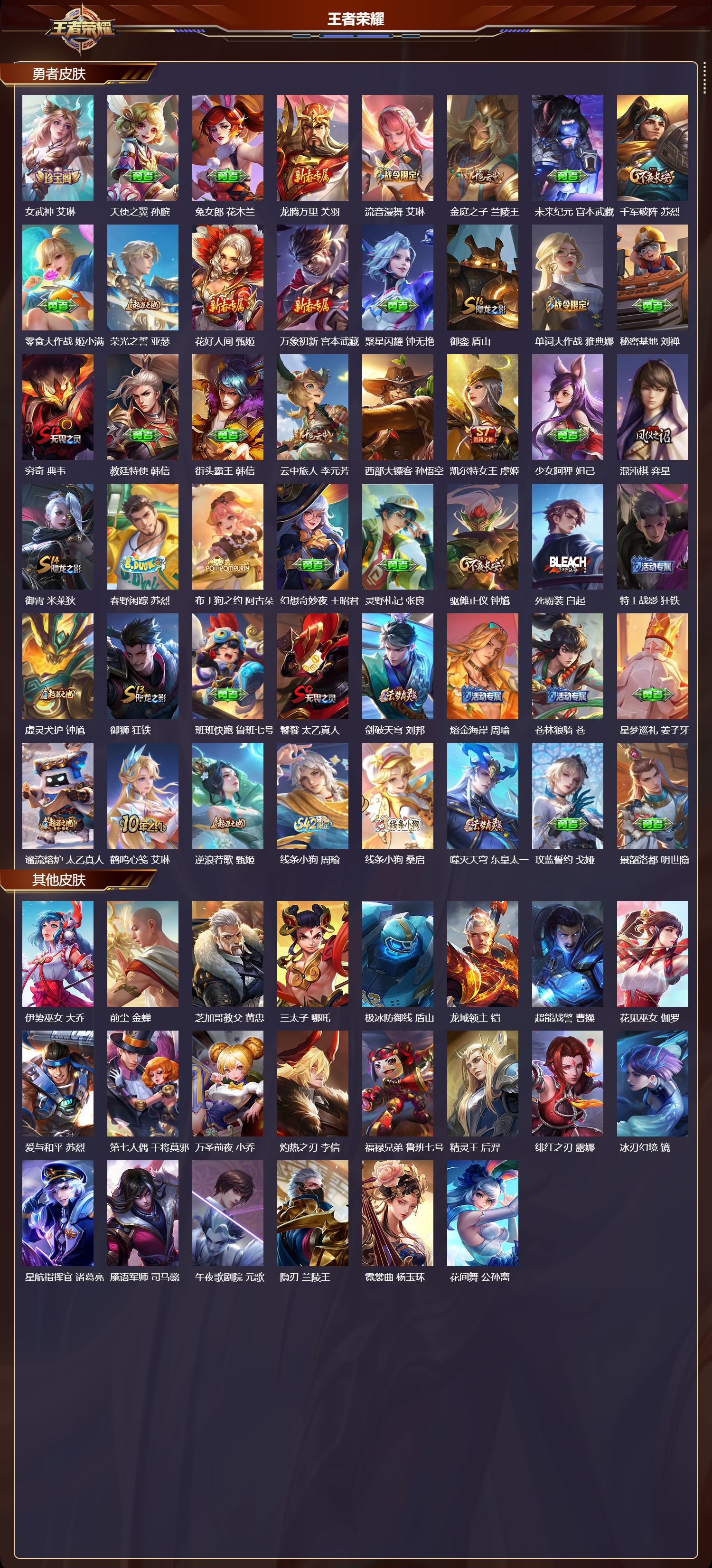 【41,其他皮肤】伊势巫女,大乔,前尘,金蝉,芝加哥教父,黄忠,三太子,哪吒,极冰防御线,盾山,龙域领主,铠,超能战警,曹操,花见巫女,伽罗,爱与和平,苏烈,第七人偶,干将莫邪,万圣前夜,小乔,灼热之刃,李信,福禄兄弟,鲁班七号,精灵王,后羿,绯红之刃,露娜,冰刃幻境,镜,星航指挥官,诸葛亮,魇语军师,司马懿,午夜歌剧院,元歌,隐刃,兰陵王,霓裳曲,杨玉环,花间舞,公孙离,异域舞娘,貂蝉,街头旋风,裴擒虎,东海龙王,东皇太一,剑舞者,花木兰,维京掠夺者,苍,归虚梦演,蒙犽,激情绿茵,马可波罗,年年有余,猪八戒,归虚梦演,曜,威尼斯狂欢,百里玄策,战争女神,雅典娜,特种部队,李元芳,绝影神枪,百里守约,森,瑶,加勒比小姐,虞姬,精灵公主,王昭君,赤焰之缨,云缨,地府判官,钟馗,西部大镖客,孙悟空,