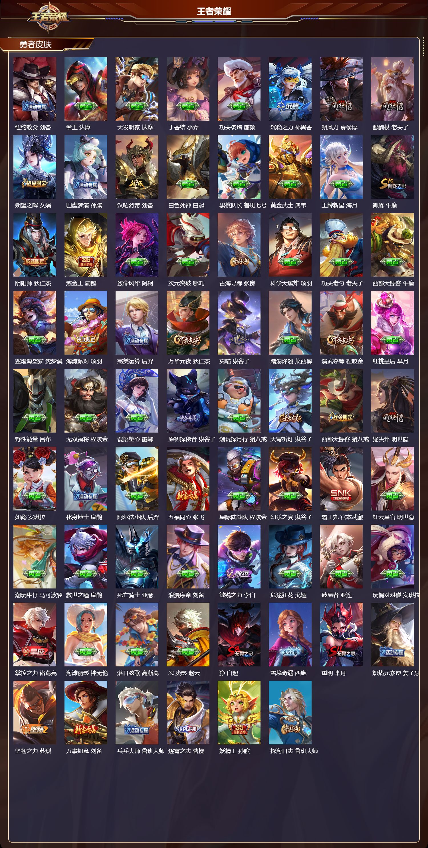 【125,勇者皮肤】圆桌骑士,盾山,烛龙,曹操,爱心护理,阿轲,星际陆战队,达摩,沙漠行僧,达摩,大漠名商,沈梦溪,缤纷绘卷,张良,纽约教父,刘备,拳王,达摩,大发明家,达摩,丁香结,小乔,功夫炙烤,廉颇,沉稳之力,孙尚香,朔风刀,夏侯惇,醍醐杖,老夫子,朔望之晖,女娲,归虚梦演,孙膑,汉昭烈帝,刘备,白色死神,白起,黑桃队长,鲁班七号,黄金武士,典韦,王牌新星,海月,御旌,牛魔,阴阳师,狄仁杰,炼金王,扁鹊,致命风华,阿轲,次元突破,哪吒,古海寻踪,张良,科学大爆炸,项羽,功夫老勺,老夫子,西部大镖客,牛魔,鲨炮海盗猫,沈梦溪,海滩派对,项羽,完美运算,后羿,万华元夜,狄仁杰,克喵,鬼谷子,踏浪烽翎,莱西奥,演武夺筹,程咬金,红桃皇后,芈月,野性能量,吕布,无双福将,程咬金,瓷语鉴心,露娜,原初探秘者,鬼谷子,潮玩探月行,猪八戒,天穹祈灯,鬼谷子,西部大镖客,猪八戒,疑决卦,明世隐,如懿,安琪拉,化身博士,扁鹊,阿尔法小队,后羿,五福同心,张飞,星际陆战队,程咬金,幻乐之宴,鬼谷子,霸王丸,宫本武藏,虹云星官,明世隐,潮玩牛仔,马可波罗,救世之瞳,扁鹊,死亡骑士,亚瑟,浪漫序章,刘备,敏锐之力,李白,危途狂花,戈娅,破局者,亚连,玩偶对对碰,安琪拉,掌控之力,诸葛亮,海滩丽影,钟无艳,落日弦歌,高渐离,忍·炎影,赵云,狰,白起,雪境奇遇,西施,重明,芈月,炽热元素使,姜子牙,坚韧之力,苏烈,万事如意,刘备,乓乓大师,鲁班大师,逐霄之志,曹操,妖精王,孙膑,探海日志,鲁班大师,女武神,艾琳,天使之翼,孙膑,兔女郎,花木兰,龙腾万里,关羽,流音漫舞,艾琳,金庭之子,兰陵王,未来纪元,宫本武藏,千军破阵,苏烈,零食大作战,姬小满,荣光之誓,亚瑟,花好人间,甄姬,万象初新,宫本武藏,聚星闪耀,钟无艳,御銮,盾山,单词大作战,雅典娜,秘密基地,刘禅,穷奇,典韦,教廷特使,韩信,街头霸王,韩信,云中旅人,李元芳,西部大镖客,孙悟空,凯尔特女王,虞姬,少女阿狸,妲己,混沌棋,弈星,御霄,米莱狄,春野闲踪,苏烈,布丁狗之约,阿古朵,幻想奇妙夜,王昭君,灵野札记,张良,驱傩正仪,钟馗,死霸装,白起,特工战影,狂铁,虚灵犬护,钟馗,御狮,狂铁,班班快跑,鲁班七号,饕餮,太乙真人,剑破天穹,刘邦,熔金海岸,周瑜,苍林狼骑,苍,星梦巡礼,姜子牙,谧流熔炉,太乙真人,鹤鸣心笺,艾琳,逆浪荇歌,甄姬,线条小狗,周瑜,线条小狗,桑启,噬灭天穹,东皇太一,玫蓝誓约,戈娅,景韶洛都,明世隐,