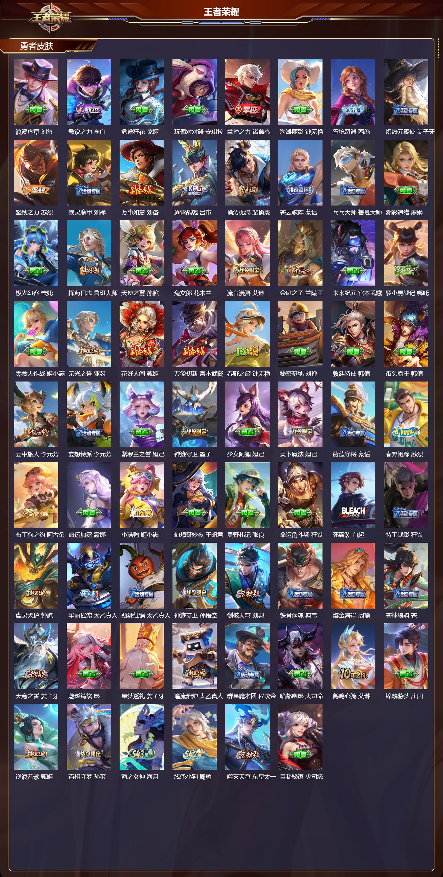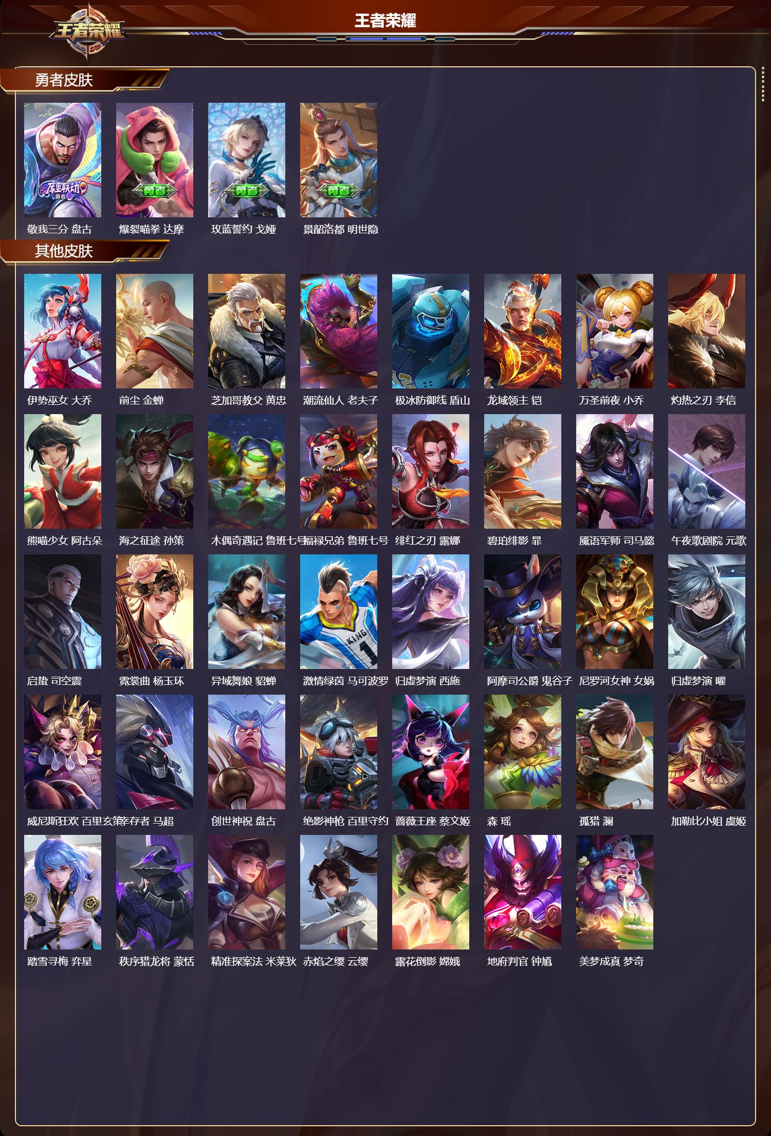 【127,勇者皮肤】时空谍影,海诺,玲珑珍味,西施,胡桃夹子,干将莫邪,太极少年,赵怀真,大漠名商,沈梦溪,暖冬絮语,程咬金,纽约教父,刘备,拳王,达摩,大发明家,达摩,龙舞盛年,沈梦溪,功夫炙烤,廉颇,沉稳之力,孙尚香,海盐诗旅,桑启,幻泉雾影,海月,热血海滩,哪吒,白色死神,白起,黄金武士,典韦,御旌,牛魔,阴阳师,狄仁杰,径山谋武,孙权,次元突破,哪吒,古海寻踪,张良,戏梦巡演,空空儿,功夫老勺,老夫子,西部大镖客,牛魔,鲨炮海盗猫,沈梦溪,海滩派对,项羽,完美运算,后羿,无尽征程,廉颇,克喵,鬼谷子,踏浪烽翎,莱西奥,红桃皇后,芈月,西部游侠,莱西奥,野性能量,吕布,哥特玫瑰,露娜,守护之力,大乔,无双福将,程咬金,百相守梦,影,星空之诺,沈梦溪,潮玩探月行,猪八戒,天穹祈灯,鬼谷子,决胜大满贯,曹操,化身博士,扁鹊,五福同心,张飞,金色潮汐,朵莉亚,星际陆战队,程咬金,幻乐之宴,鬼谷子,东方不败,武则天,虹云星官,明世隐,雾影缉谜,兰陵王,赤刃凌霄,敖隐,潮玩骑兵,杨戬,死亡骑士,亚瑟,浪漫序章,刘备,敏锐之力,李白,危途狂花,戈娅,玩偶对对碰,安琪拉,掌控之力,诸葛亮,海滩丽影,钟无艳,雪境奇遇,西施,炽热元素使,姜子牙,坚韧之力,苏烈,唤灵魔甲,刘禅,万事如意,刘备,逐霄战戟,吕布,擒涛扼浪,裴擒虎,苍云破阵,蒙恬,乓乓大师,鲁班大师,溯影追猎,虞姬,极光幻客,蚩奼,探海日志,鲁班大师,天使之翼,孙膑,兔女郎,花木兰,流音漫舞,艾琳,金庭之子,兰陵王,未来纪元,宫本武藏,罗小黑战记,哪吒,零食大作战,姬小满,荣光之誓,亚瑟,花好人间,甄姬,万象初新,宫本武藏,春野之旅,钟无艳,秘密基地,刘禅,教廷特使,韩信,街头霸王,韩信,云中旅人,李元芳,妄想特派,李元芳,紫罗兰之誓,妲己,神迹守卫,墨子,少女阿狸,妲己,灵卜魔法,妲己,蔚蓝守将,蒙恬,春野闲踪,苏烈,布丁狗之约,阿古朵,命运加冕,露娜,小满鸭,姬小满,幻想奇妙夜,王昭君,灵野札记,张良,命运角斗场,狂铁,死霸装,白起,特工战影,狂铁,虚灵犬护,钟馗,华丽摇滚,太乙真人,劲辣红锅,太乙真人,神迹守卫,孙悟空,剑破天穹,刘邦,铁骨偃魂,典韦,熔金海岸,周瑜,苍林狼骑,苍,天穹之誓,姜子牙,魅影绮裳,影,星梦巡礼,姜子牙,谧流熔炉,太乙真人,群星魔术团,程咬金,暗都幽影,大司命,鹤鸣心笺,艾琳,锦麟游梦,庄周,逆浪荇歌,甄姬,百相守梦,孙策,海之女神,海月,线条小狗,周瑜,噬灭天穹,东皇太一,灵卦秘语,少司缘,敬我三分,盘古,爆裂喵拳,达摩,玫蓝誓约,戈娅,景韶洛都,明世隐,