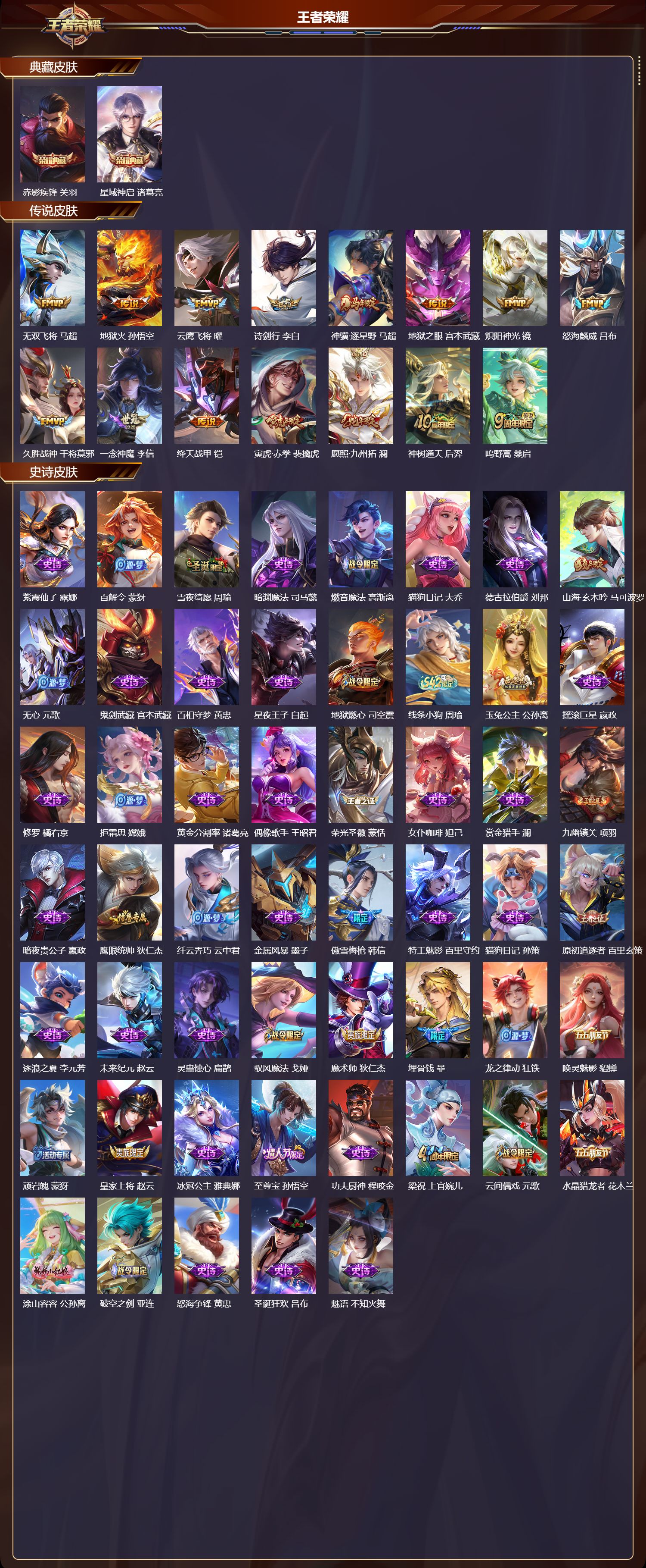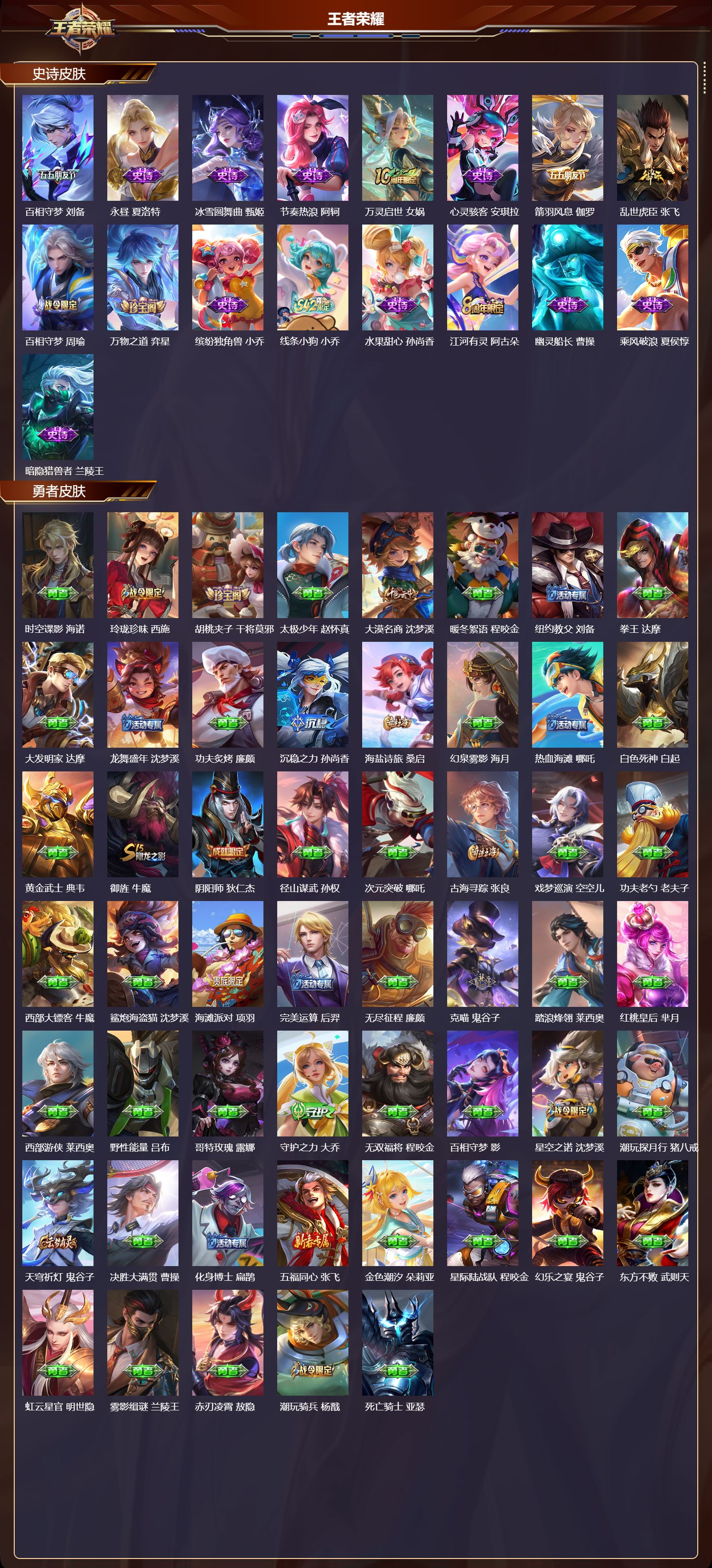 【70,史诗皮肤】紫霞仙子,露娜,百解令,蒙犽,雪夜绮愿,周瑜,暗渊魔法,司马懿,燃音魔法,高渐离,猫狗日记,大乔,德古拉伯爵,刘邦,山海·玄木吟,马可波罗,无心,元歌,鬼剑武藏,宫本武藏,百相守梦,黄忠,星夜王子,白起,地狱燃心,司空震,线条小狗,周瑜,玉兔公主,公孙离,摇滚巨星,嬴政,修罗,橘右京,拒霜思,嫦娥,黄金分割率,诸葛亮,偶像歌手,王昭君,荣光圣徽,蒙恬,女仆咖啡,妲己,赏金猎手,澜,九幽镇关,项羽,暗夜贵公子,嬴政,鹰眼统帅,狄仁杰,纤云弄巧,云中君,金属风暴,墨子,傲雪梅枪,韩信,特工魅影,百里守约,猫狗日记,孙策,原初追逐者,百里玄策,逐浪之夏,李元芳,未来纪元,赵云,灵蛊蚀心,扁鹊,驭风魔法,戈娅,魔术师,狄仁杰,埋骨钱,暃,龙之律动,狂铁,唤灵魅影,貂蝉,顽岩魄,蒙犽,皇家上将,赵云,冰冠公主,雅典娜,至尊宝,孙悟空,功夫厨神,程咬金,梁祝,上官婉儿,云间偶戏,元歌,水晶猎龙者,花木兰,涂山容容,公孙离,破空之剑,亚连,怒海争锋,黄忠,圣诞狂欢,吕布,魅语,不知火舞,百相守梦,刘备,永昼,夏洛特,冰雪圆舞曲,甄姬,节奏热浪,阿轲,万灵启世,女娲,心灵骇客,安琪拉,箭羽风息,伽罗,乱世虎臣,张飞,百相守梦,周瑜,万物之道,弈星,缤纷独角兽,小乔,线条小狗,小乔,水果甜心,孙尚香,江河有灵,阿古朵,幽灵船长,曹操,乘风破浪,夏侯惇,暗隐猎兽者,兰陵王,