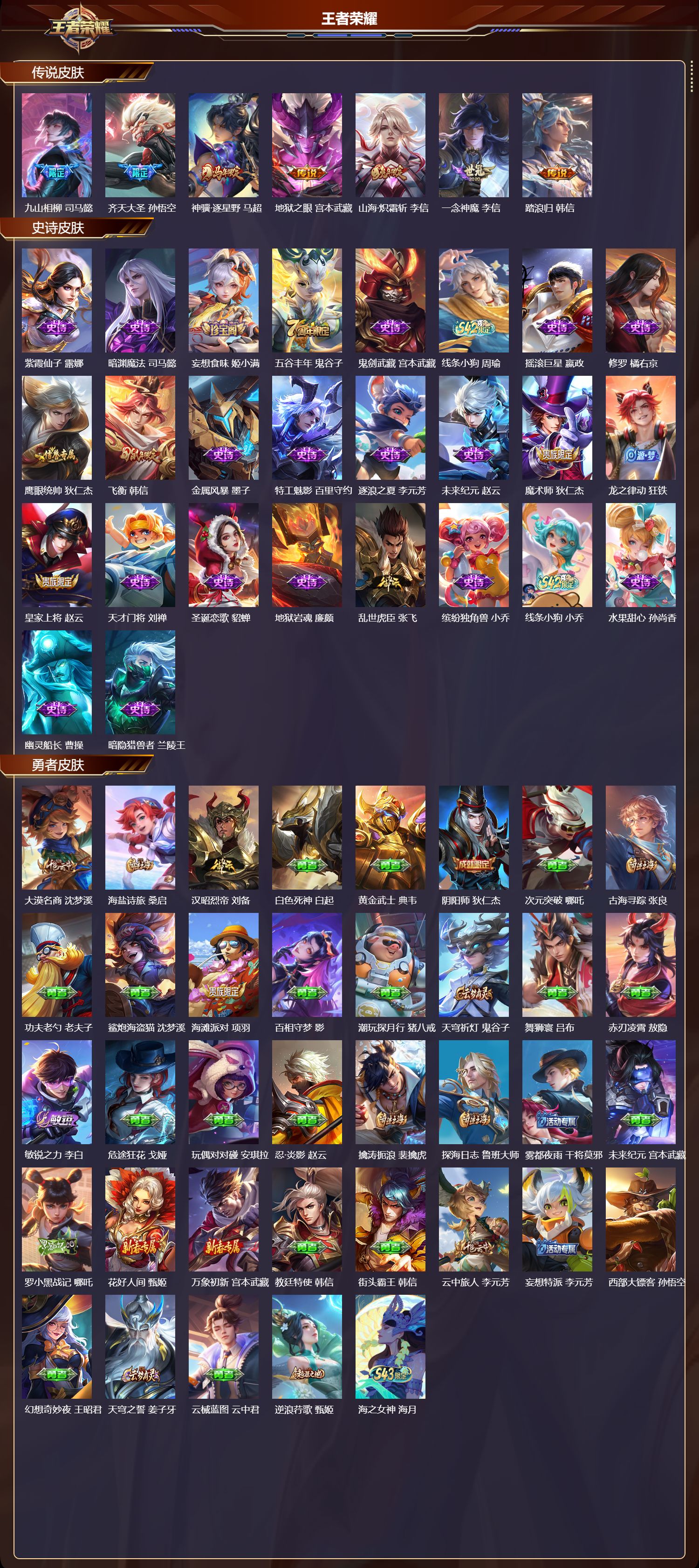 【26,史诗皮肤】紫霞仙子,露娜,暗渊魔法,司马懿,妄想食味,姬小满,五谷丰年,鬼谷子,鬼剑武藏,宫本武藏,线条小狗,周瑜,摇滚巨星,嬴政,修罗,橘右京,鹰眼统帅,狄仁杰,飞衡,韩信,金属风暴,墨子,特工魅影,百里守约,逐浪之夏,李元芳,未来纪元,赵云,魔术师,狄仁杰,龙之律动,狂铁,皇家上将,赵云,天才门将,刘禅,圣诞恋歌,貂蝉,地狱岩魂,廉颇,乱世虎臣,张飞,缤纷独角兽,小乔,线条小狗,小乔,水果甜心,孙尚香,幽灵船长,曹操,暗隐猎兽者,兰陵王,