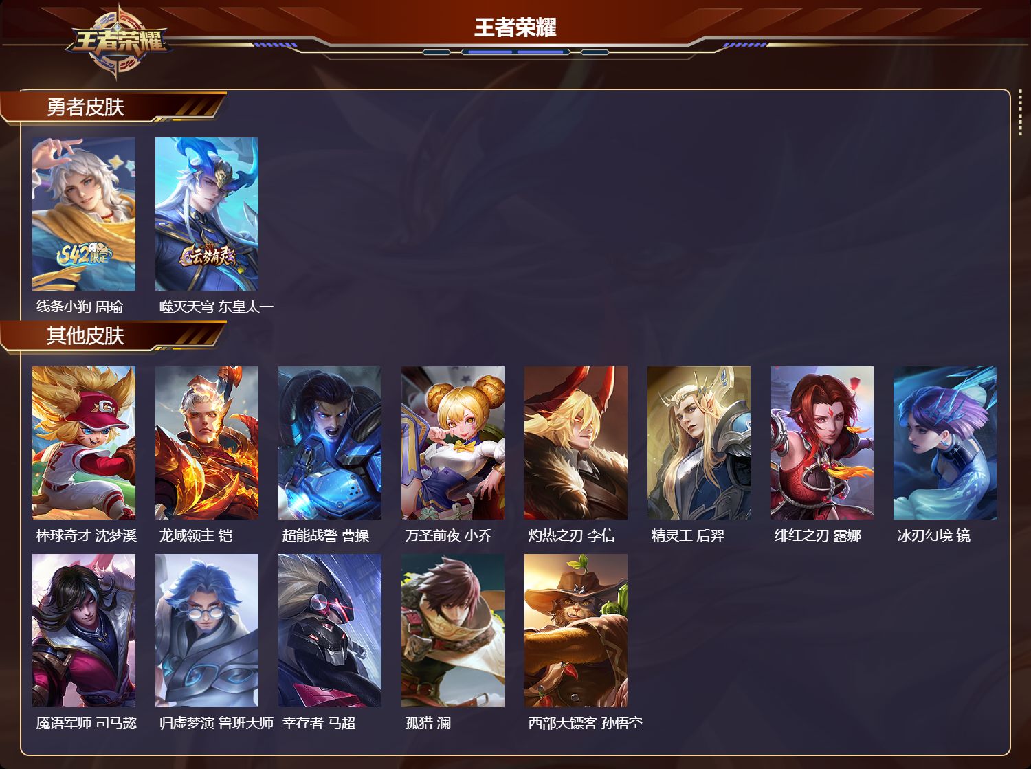 【13,其他皮肤】棒球奇才,沈梦溪,龙域领主,铠,超能战警,曹操,万圣前夜,小乔,灼热之刃,李信,精灵王,后羿,绯红之刃,露娜,冰刃幻境,镜,魇语军师,司马懿,归虚梦演,鲁班大师,幸存者,马超,孤猎,澜,西部大镖客,孙悟空,