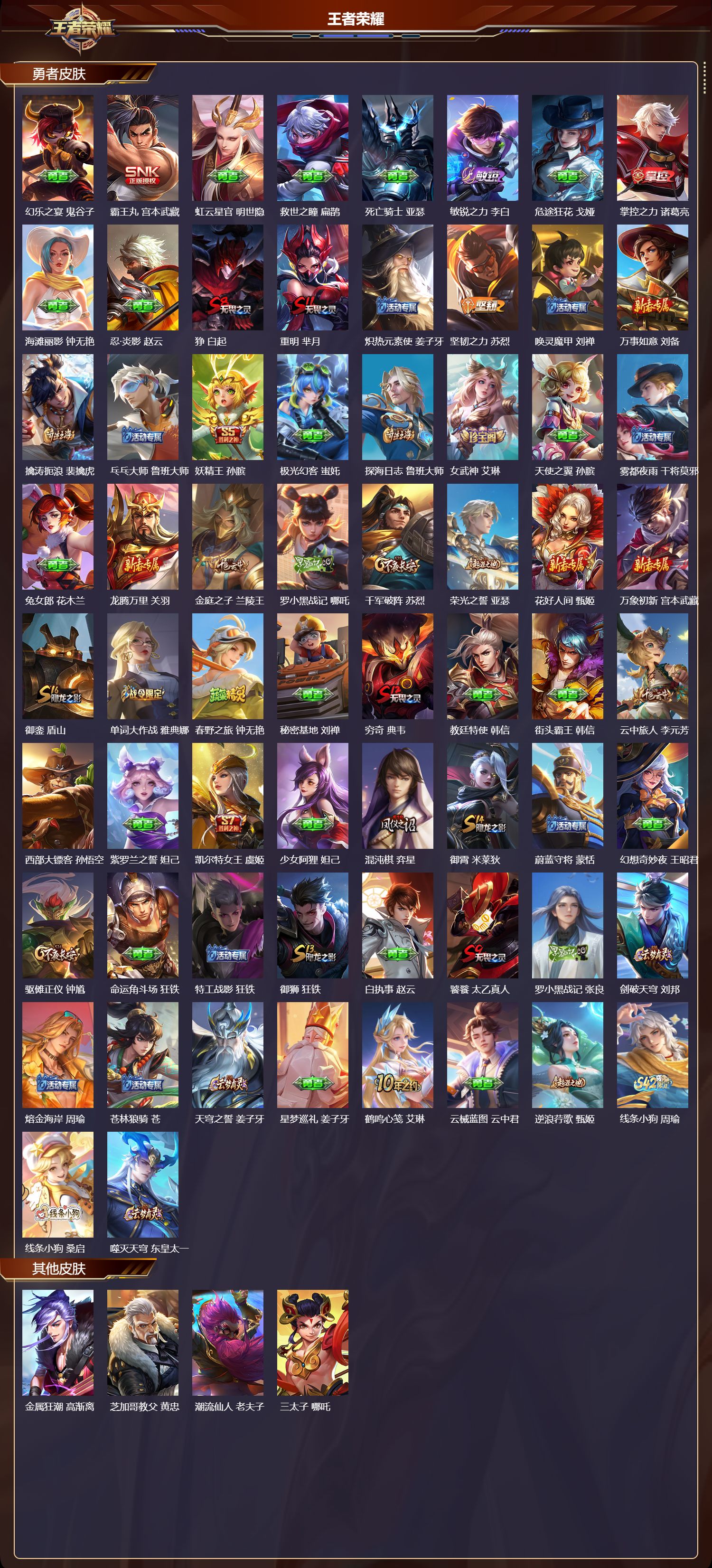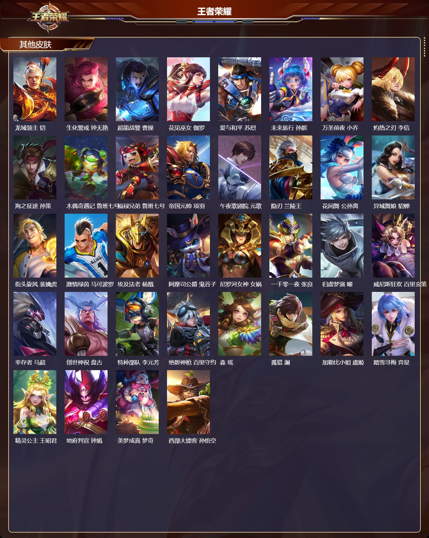 【40,其他皮肤】金属狂潮,高渐离,芝加哥教父,黄忠,潮流仙人,老夫子,三太子,哪吒,龙域领主,铠,生化警戒,钟无艳,超能战警,曹操,花见巫女,伽罗,爱与和平,苏烈,未来旅行,孙膑,万圣前夜,小乔,灼热之刃,李信,海之征途,孙策,木偶奇遇记,鲁班七号,福禄兄弟,鲁班七号,帝国元帅,项羽,午夜歌剧院,元歌,隐刃,兰陵王,花间舞,公孙离,异域舞娘,貂蝉,街头旋风,裴擒虎,激情绿茵,马可波罗,埃及法老,杨戬,阿摩司公爵,鬼谷子,尼罗河女神,女娲,一千零一夜,张良,归虚梦演,曜,威尼斯狂欢,百里玄策,幸存者,马超,创世神祝,盘古,特种部队,李元芳,绝影神枪,百里守约,森,瑶,孤猎,澜,加勒比小姐,虞姬,踏雪寻梅,弈星,精灵公主,王昭君,地府判官,钟馗,美梦成真,梦奇,西部大镖客,孙悟空,