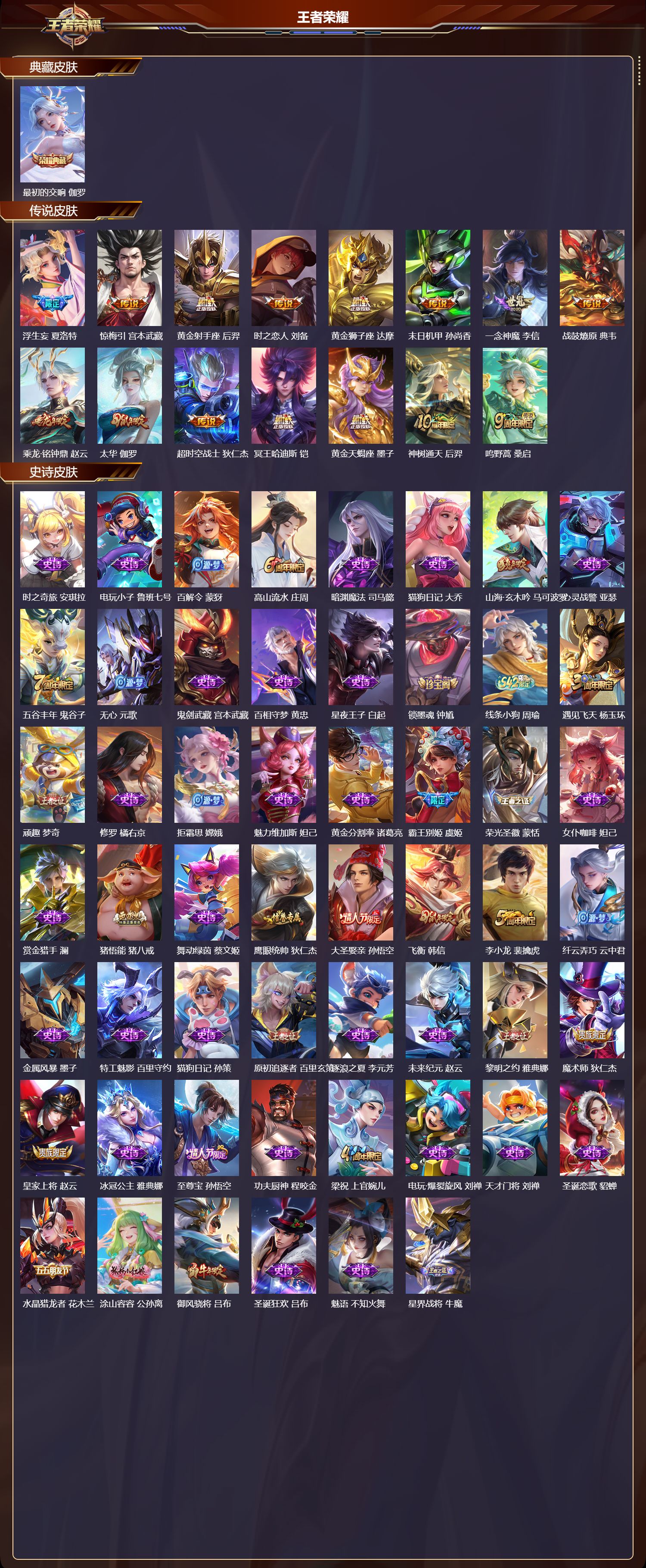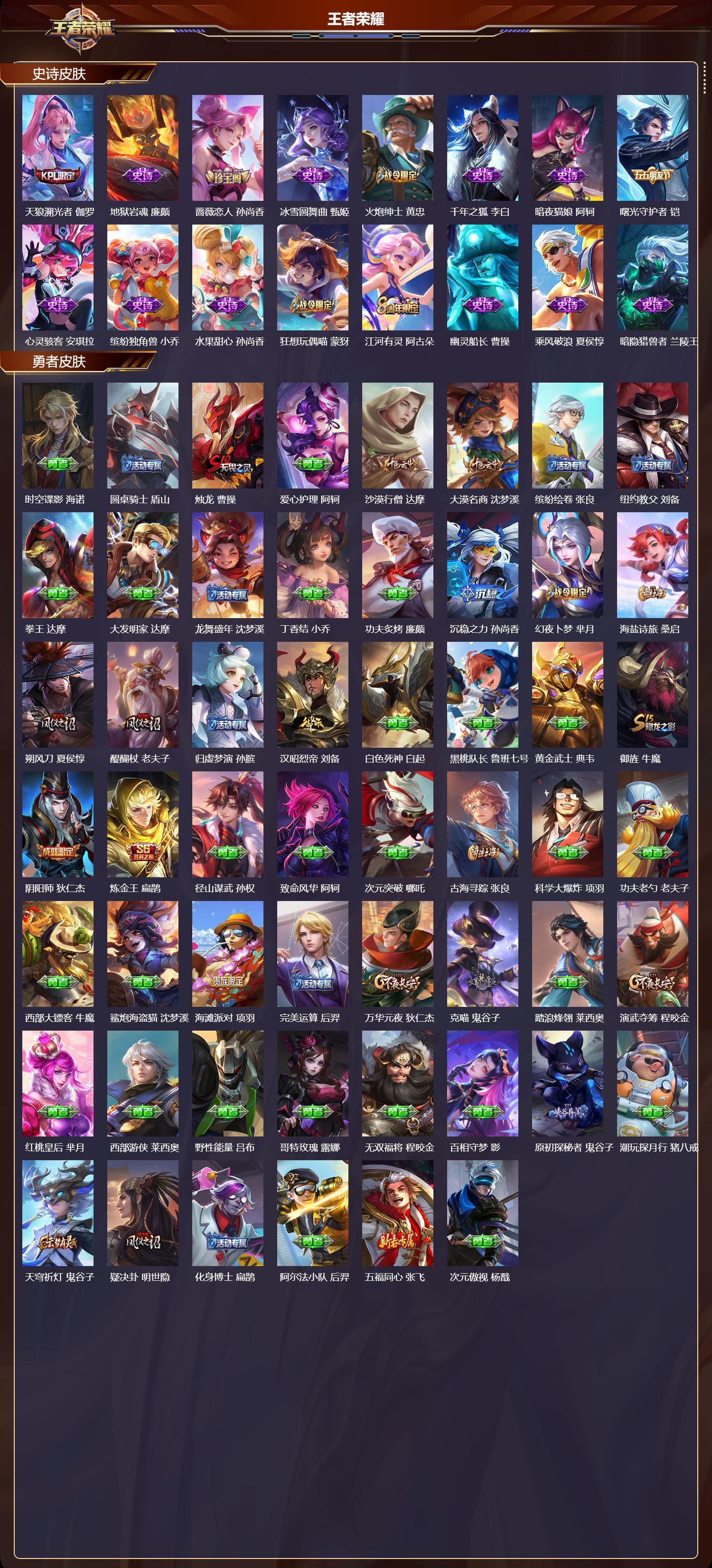 【70,史诗皮肤】时之奇旅,安琪拉,电玩小子,鲁班七号,百解令,蒙犽,高山流水,庄周,暗渊魔法,司马懿,猫狗日记,大乔,山海·玄木吟,马可波罗,心灵战警,亚瑟,五谷丰年,鬼谷子,无心,元歌,鬼剑武藏,宫本武藏,百相守梦,黄忠,星夜王子,白起,锁墨魂,钟馗,线条小狗,周瑜,遇见飞天,杨玉环,顽趣,梦奇,修罗,橘右京,拒霜思,嫦娥,魅力维加斯,妲己,黄金分割率,诸葛亮,霸王别姬,虞姬,荣光圣徽,蒙恬,女仆咖啡,妲己,赏金猎手,澜,猪悟能,猪八戒,舞动绿茵,蔡文姬,鹰眼统帅,狄仁杰,大圣娶亲,孙悟空,飞衡,韩信,李小龙,裴擒虎,纤云弄巧,云中君,金属风暴,墨子,特工魅影,百里守约,猫狗日记,孙策,原初追逐者,百里玄策,逐浪之夏,李元芳,未来纪元,赵云,黎明之约,雅典娜,魔术师,狄仁杰,皇家上将,赵云,冰冠公主,雅典娜,至尊宝,孙悟空,功夫厨神,程咬金,梁祝,上官婉儿,电玩·爆裂旋风,刘禅,天才门将,刘禅,圣诞恋歌,貂蝉,水晶猎龙者,花木兰,涂山容容,公孙离,御风骁将,吕布,圣诞狂欢,吕布,魅语,不知火舞,星界战将,牛魔,天狼溯光者,伽罗,地狱岩魂,廉颇,蔷薇恋人,孙尚香,冰雪圆舞曲,甄姬,火炮绅士,黄忠,千年之狐,李白,暗夜猫娘,阿轲,曙光守护者,铠,心灵骇客,安琪拉,缤纷独角兽,小乔,水果甜心,孙尚香,狂想玩偶喵,蒙犽,江河有灵,阿古朵,幽灵船长,曹操,乘风破浪,夏侯惇,暗隐猎兽者,兰陵王,