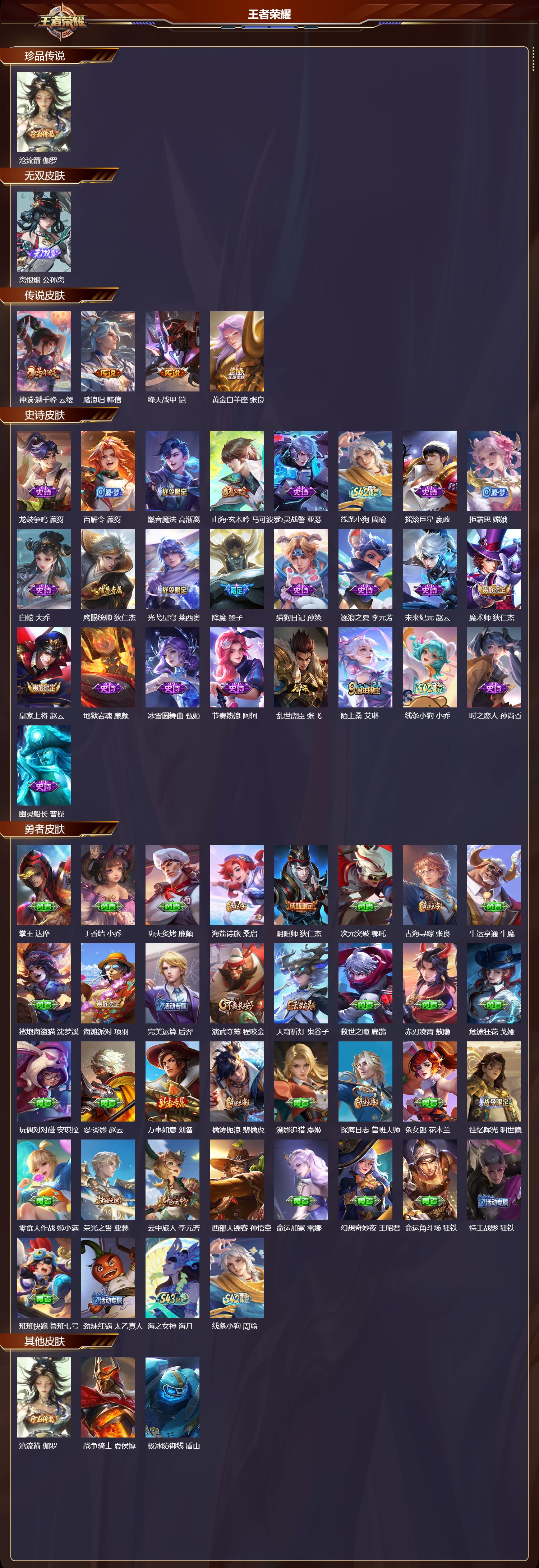 【36,勇者皮肤】拳王,达摩,丁香结,小乔,功夫炙烤,廉颇,海盐诗旅,桑启,阴阳师,狄仁杰,次元突破,哪吒,古海寻踪,张良,牛运亨通,牛魔,鲨炮海盗猫,沈梦溪,海滩派对,项羽,完美运算,后羿,演武夺筹,程咬金,天穹祈灯,鬼谷子,救世之瞳,扁鹊,赤刃凌霄,敖隐,危途狂花,戈娅,玩偶对对碰,安琪拉,忍·炎影,赵云,万事如意,刘备,擒涛扼浪,裴擒虎,溯影追猎,虞姬,探海日志,鲁班大师,兔女郎,花木兰,往忆晖光,明世隐,零食大作战,姬小满,荣光之誓,亚瑟,云中旅人,李元芳,西部大镖客,孙悟空,命运加冕,露娜,幻想奇妙夜,王昭君,命运角斗场,狂铁,特工战影,狂铁,班班快跑,鲁班七号,劲辣红锅,太乙真人,海之女神,海月,线条小狗,周瑜,