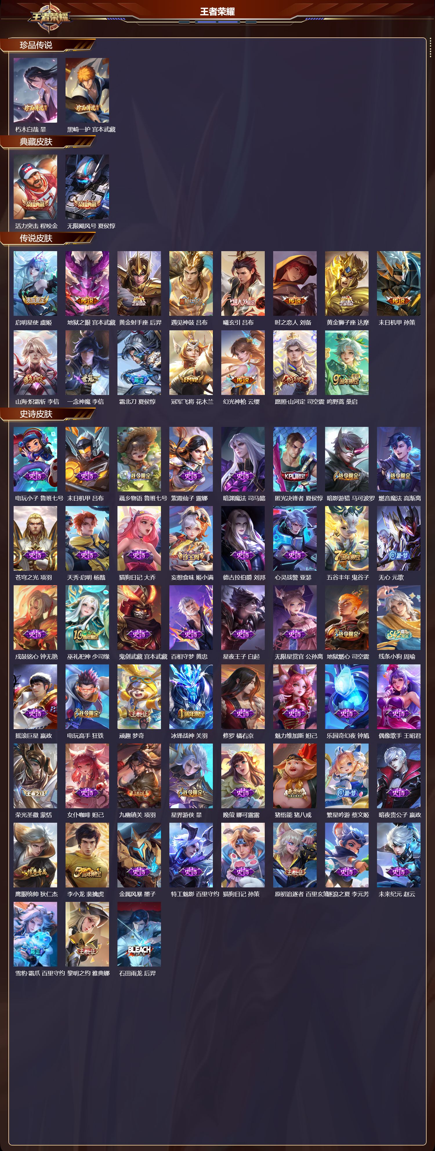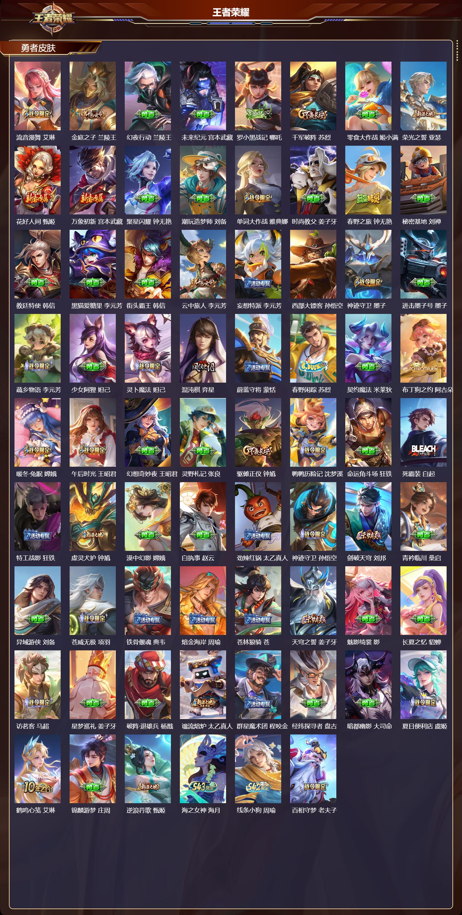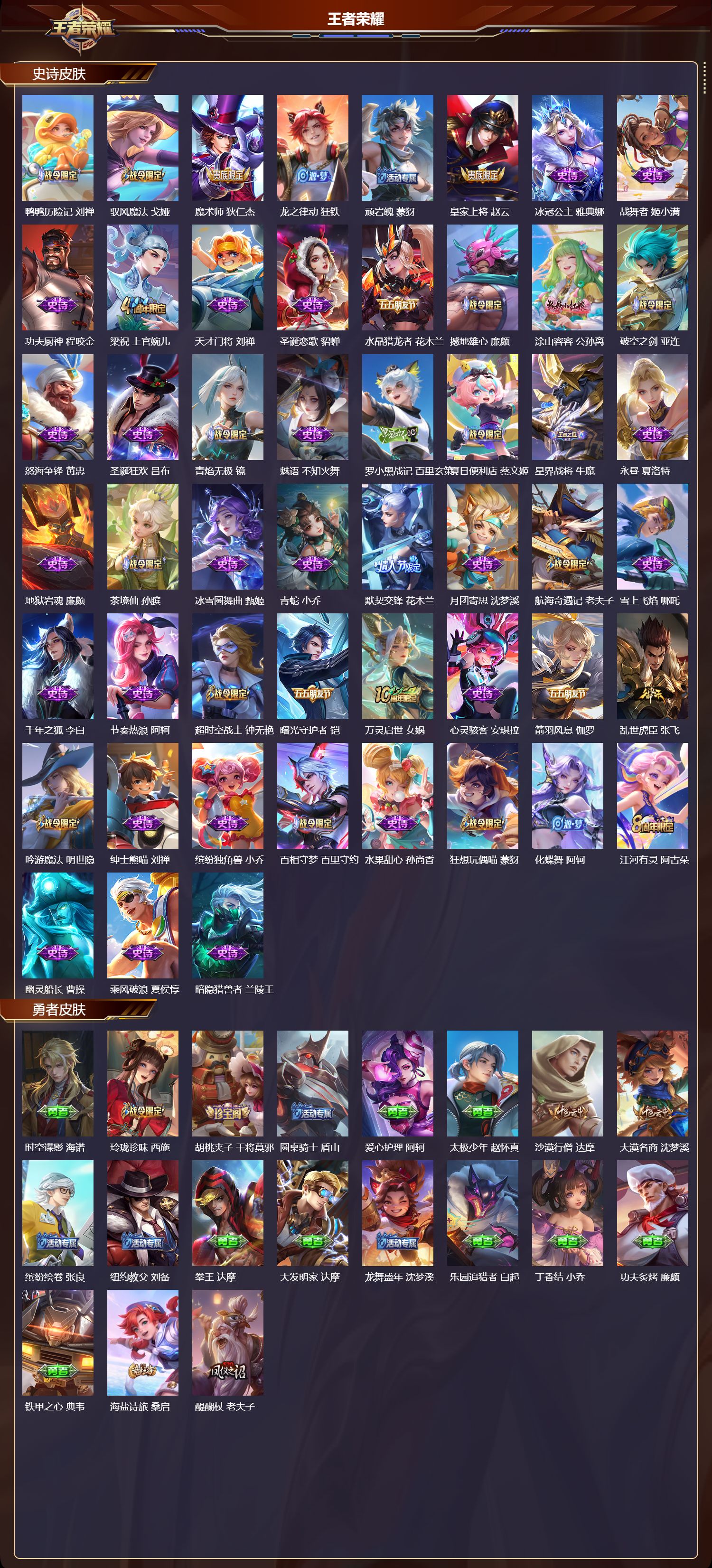 【102,史诗皮肤】电玩小子,鲁班七号,末日机甲,吕布,蔬乡物语,鲁班七号,紫霞仙子,露娜,暗渊魔法,司马懿,匿光决锋者,夏侯惇,暗影游猎,马可波罗,燃音魔法,高渐离,苍穹之光,项羽,天秀·启明,杨戬,猫狗日记,大乔,妄想食味,姬小满,德古拉伯爵,刘邦,心灵战警,亚瑟,五谷丰年,鬼谷子,无心,元歌,戍鼓铭心,钟无艳,巫礼祀神,少司缘,鬼剑武藏,宫本武藏,百相守梦,黄忠,星夜王子,白起,无限星赏官,公孙离,地狱燃心,司空震,线条小狗,周瑜,摇滚巨星,嬴政,电玩高手,狂铁,顽趣,梦奇,冰锋战神,关羽,修罗,橘右京,魅力维加斯,妲己,乐园奇幻夜,钟馗,偶像歌手,王昭君,荣光圣徽,蒙恬,女仆咖啡,妲己,九幽镇关,项羽,星界游侠,暃,晚萤,娜可露露,猪悟能,猪八戒,繁星吟游,蔡文姬,暗夜贵公子,嬴政,鹰眼统帅,狄仁杰,李小龙,裴擒虎,金属风暴,墨子,特工魅影,百里守约,猫狗日记,孙策,原初追逐者,百里玄策,逐浪之夏,李元芳,未来纪元,赵云,雪豹·霜爪,百里守约,黎明之约,雅典娜,石田雨龙,后羿,鸭鸭历险记,刘禅,驭风魔法,戈娅,魔术师,狄仁杰,龙之律动,狂铁,顽岩魄,蒙犽,皇家上将,赵云,冰冠公主,雅典娜,战舞者,姬小满,功夫厨神,程咬金,梁祝,上官婉儿,天才门将,刘禅,圣诞恋歌,貂蝉,水晶猎龙者,花木兰,撼地雄心,廉颇,涂山容容,公孙离,破空之剑,亚连,怒海争锋,黄忠,圣诞狂欢,吕布,青焰无极,镜,魅语,不知火舞,罗小黑战记,百里玄策,夏日便利店,蔡文姬,星界战将,牛魔,永昼,夏洛特,地狱岩魂,廉颇,茶境仙,孙膑,冰雪圆舞曲,甄姬,青蛇,小乔,默契交锋,花木兰,月团寄思,沈梦溪,航海奇遇记,老夫子,雪上飞焰,哪吒,千年之狐,李白,节奏热浪,阿轲,超时空战士,钟无艳,曙光守护者,铠,万灵启世,女娲,心灵骇客,安琪拉,箭羽风息,伽罗,乱世虎臣,张飞,吟游魔法,明世隐,绅士熊喵,刘禅,缤纷独角兽,小乔,百相守梦,百里守约,水果甜心,孙尚香,狂想玩偶喵,蒙犽,化蝶舞,阿轲,江河有灵,阿古朵,幽灵船长,曹操,乘风破浪,夏侯惇,暗隐猎兽者,兰陵王,